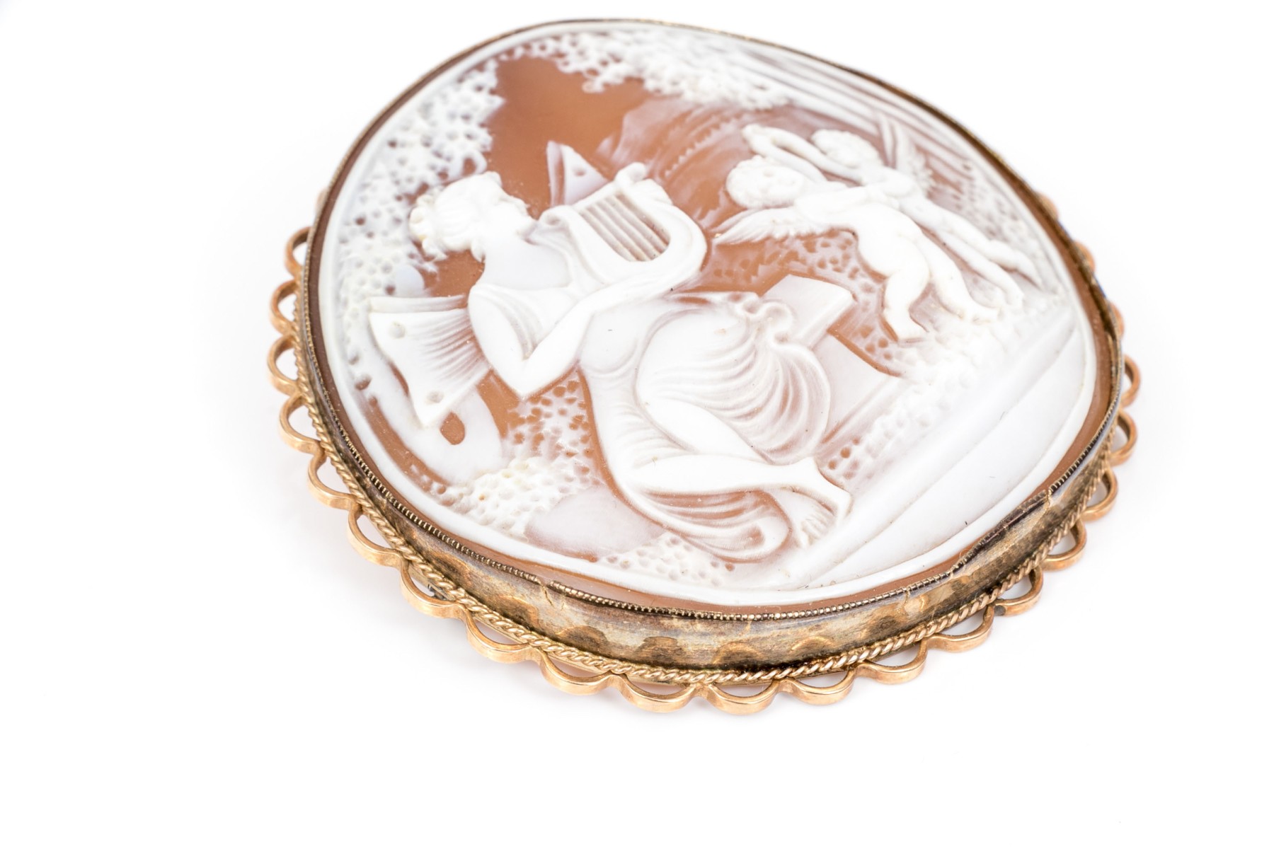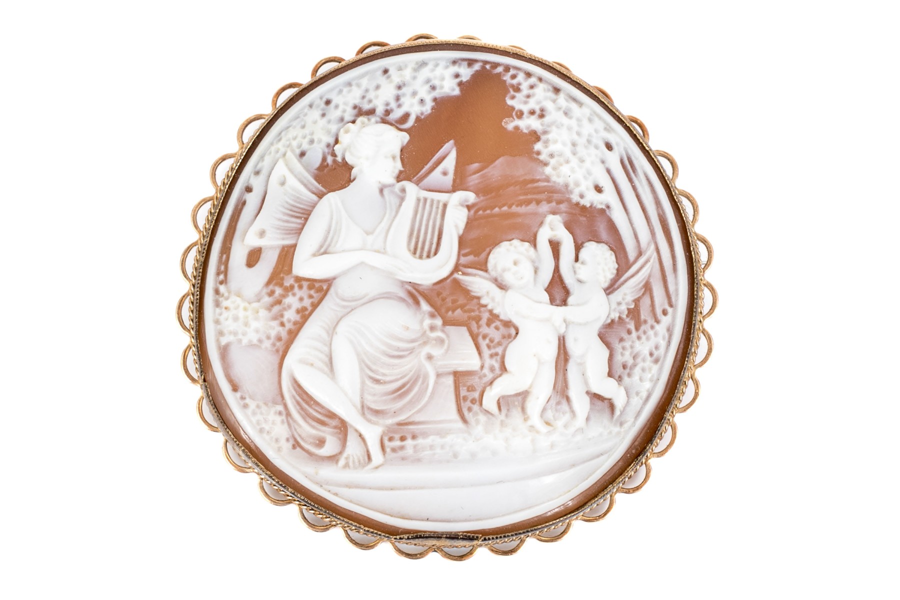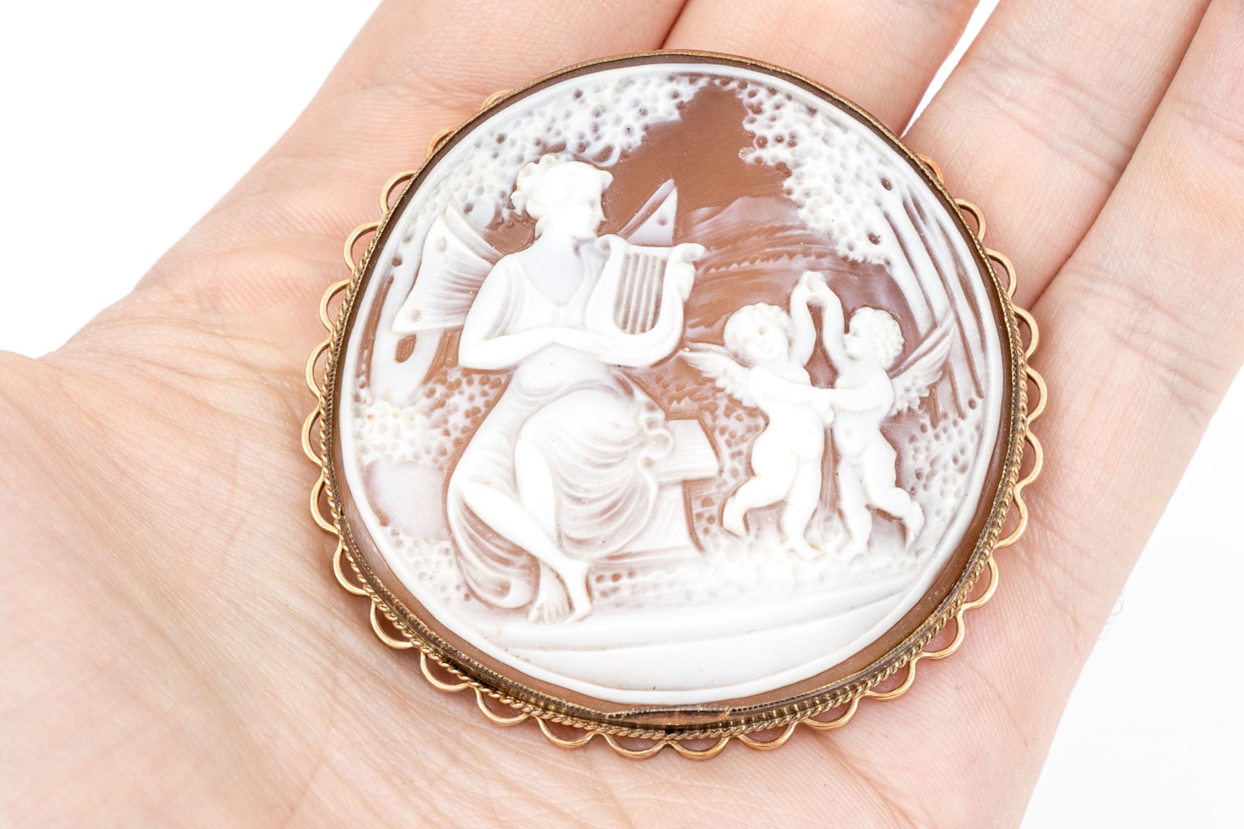 9k yellow gold vintage beautiful large round Psyche and Cupids motif cameo brooch, scalloped frame