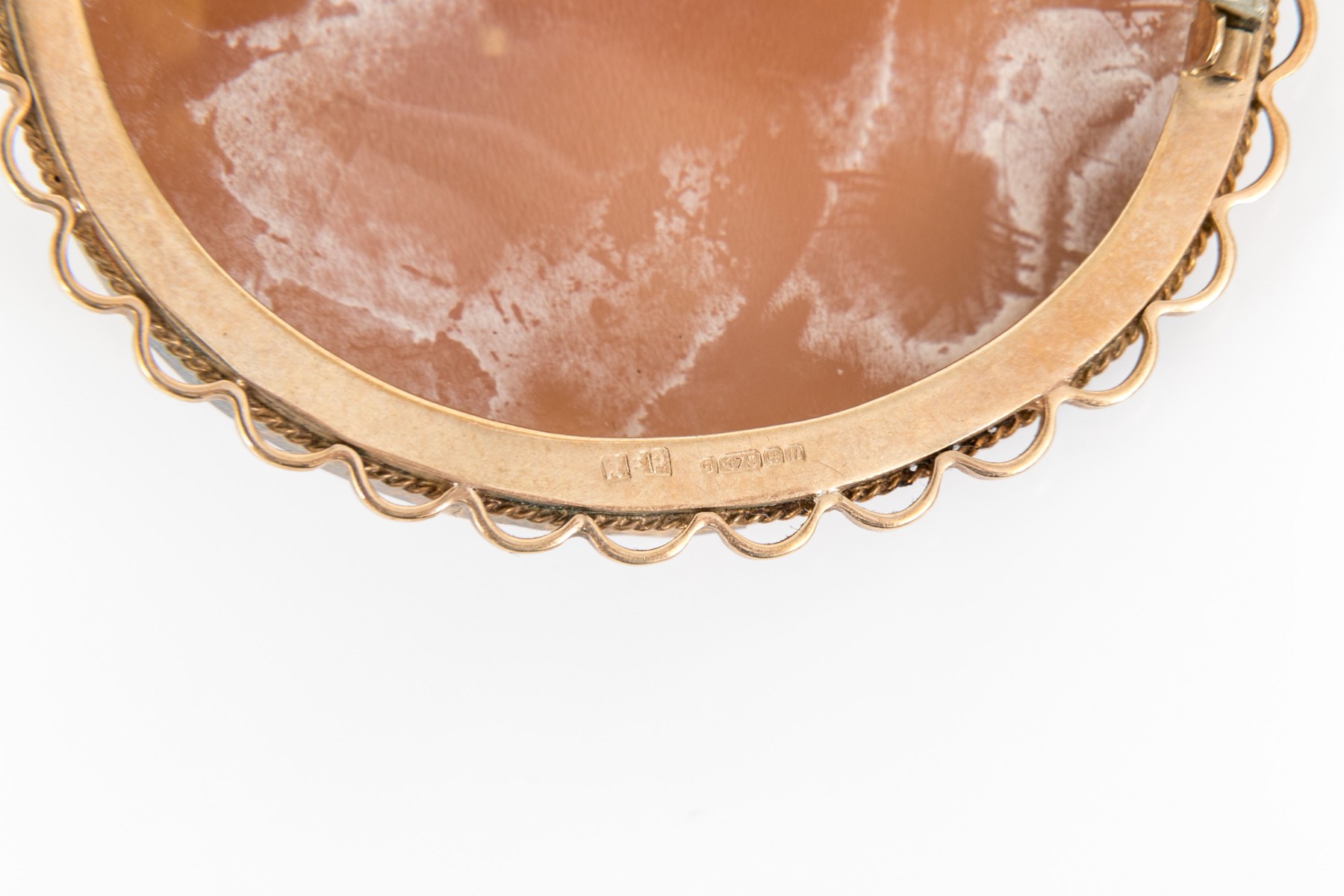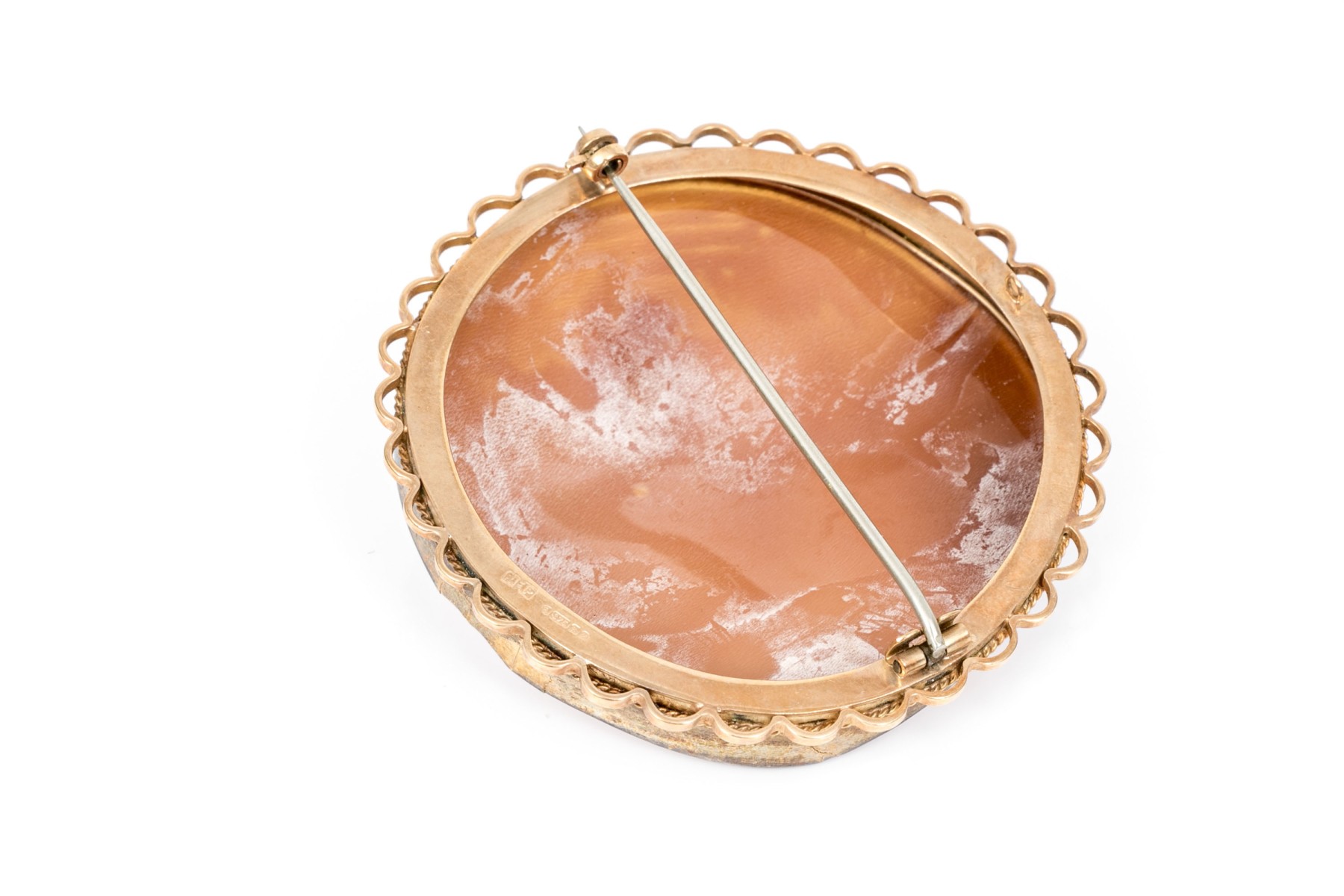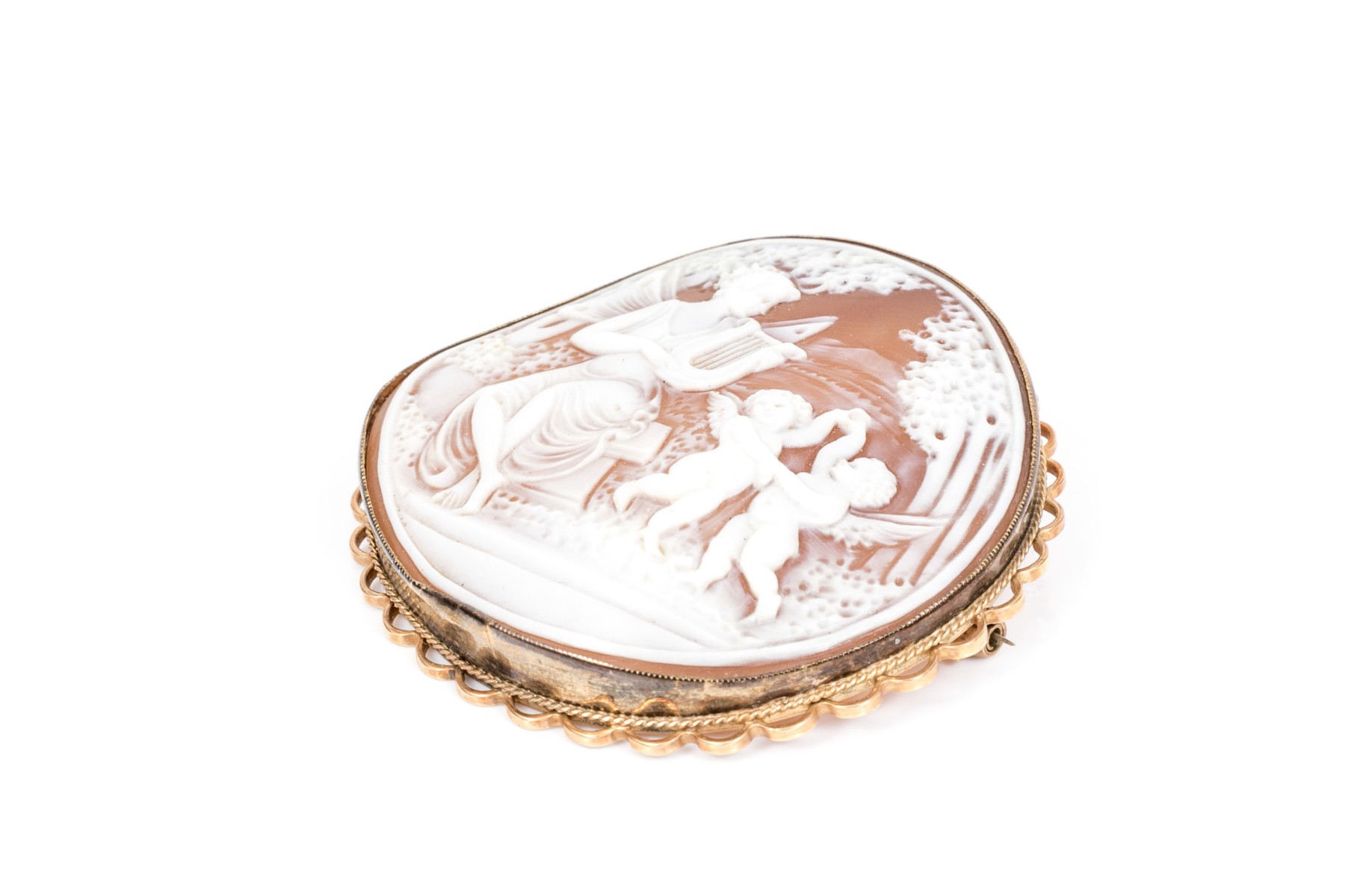 9k yellow gold vintage beautiful large round Psyche and Cupids motif cameo brooch, scalloped frame
