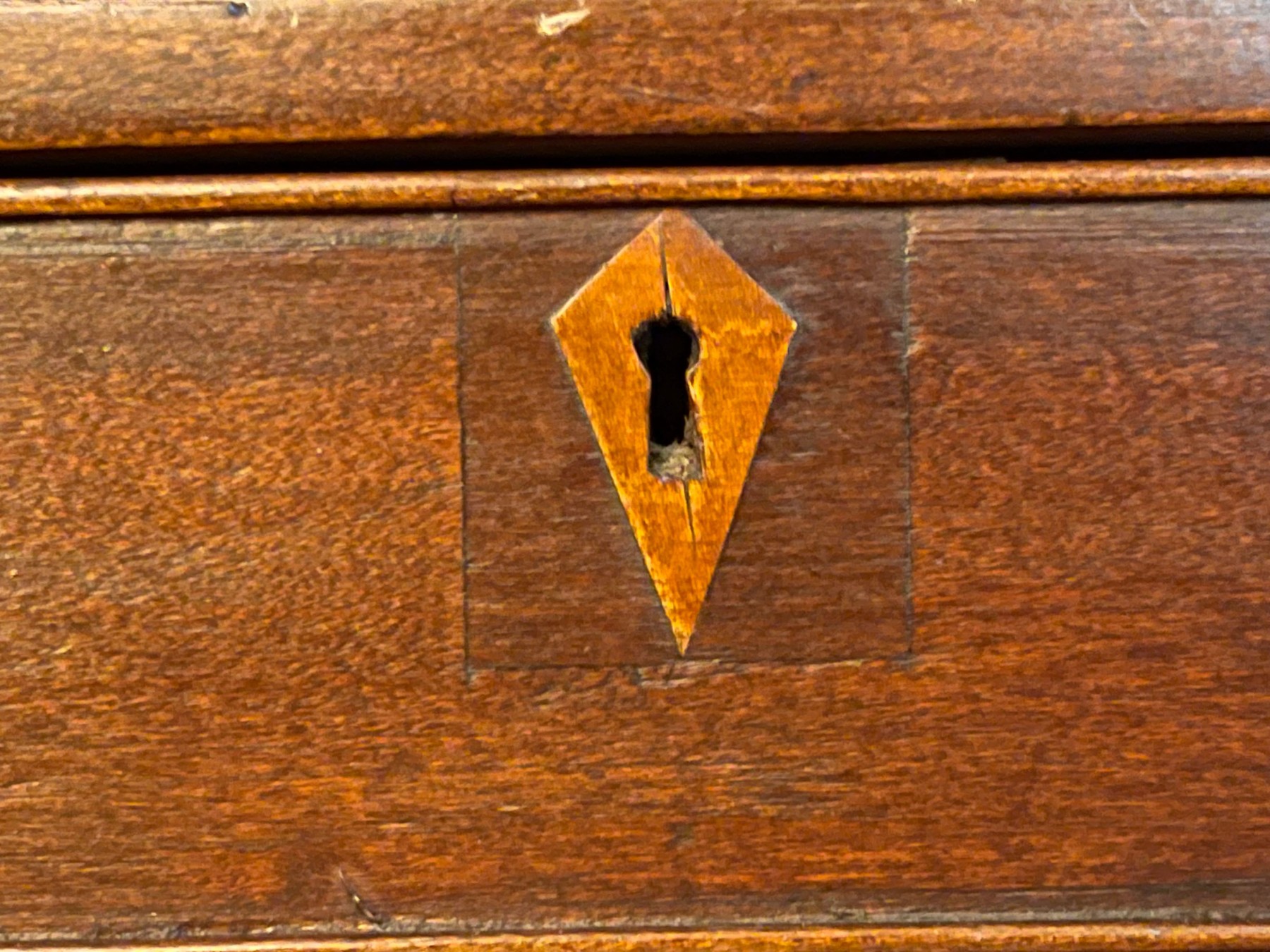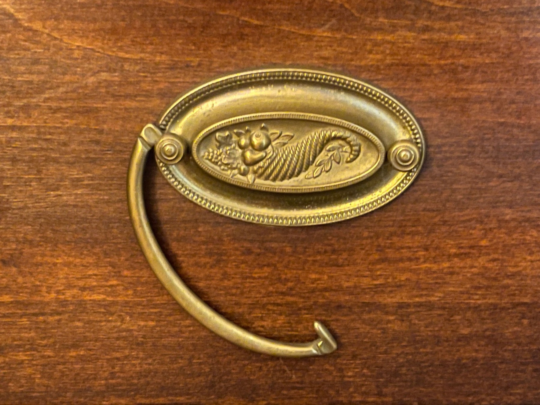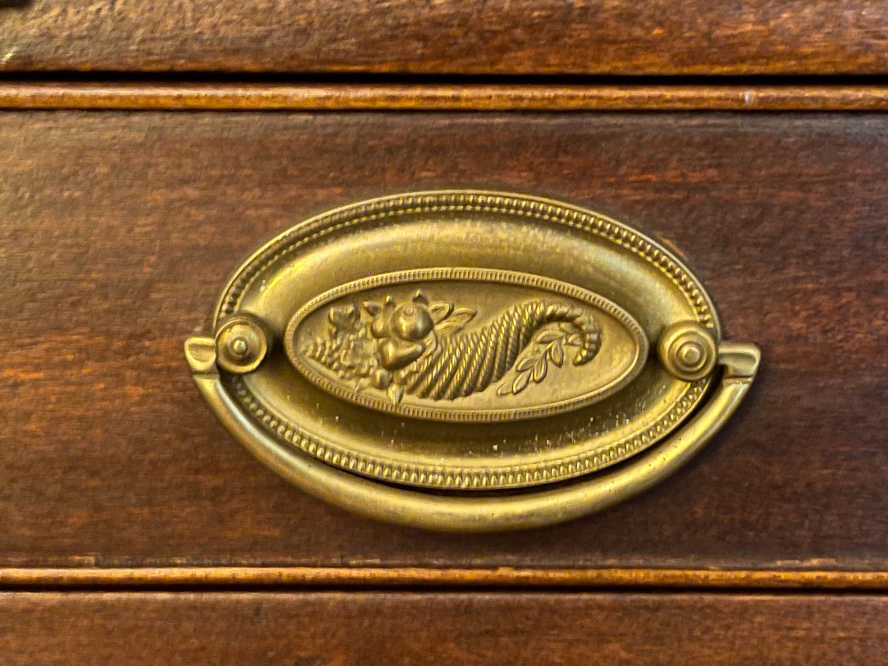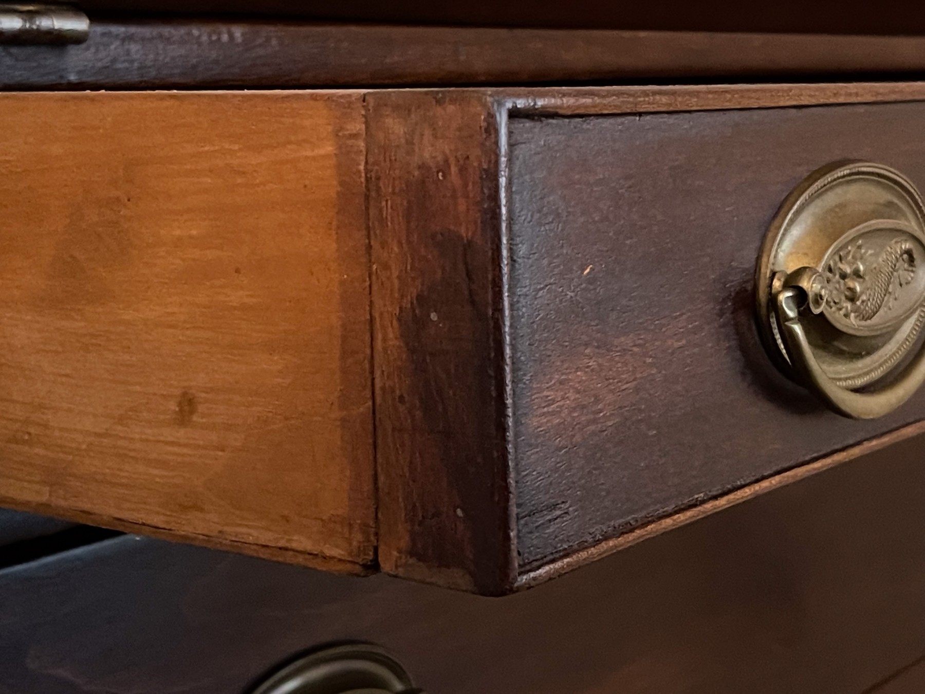 Condition: Fair, one of the brass pulls is detached on lowest drawers, commensurate with age and use