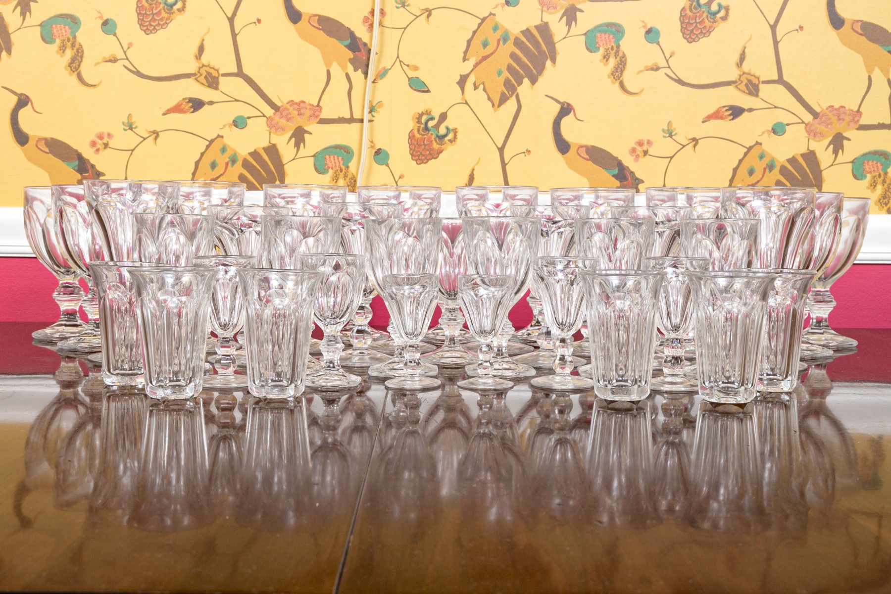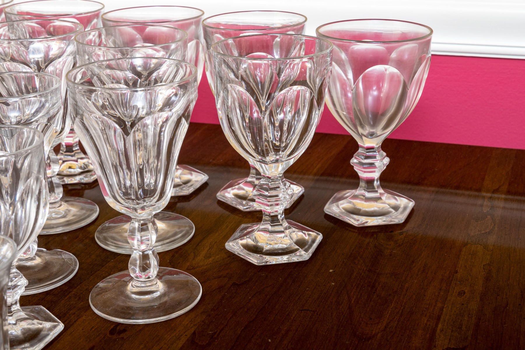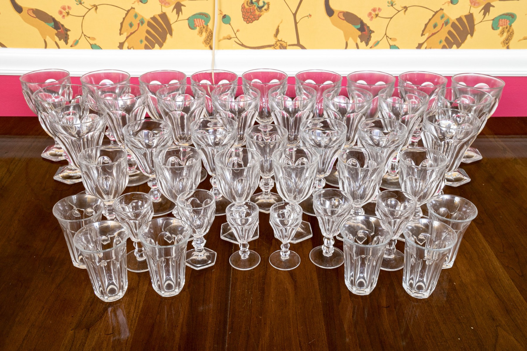 Comprised of 45 pieces including water glasses, wine glasses, cordials, and juice glasses. Some have hexoganol bases some have circular bases. Not all pieces marked.