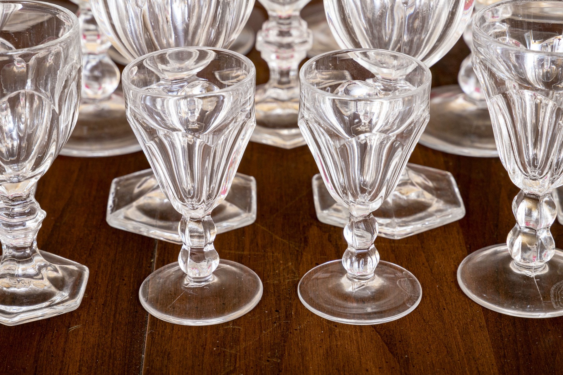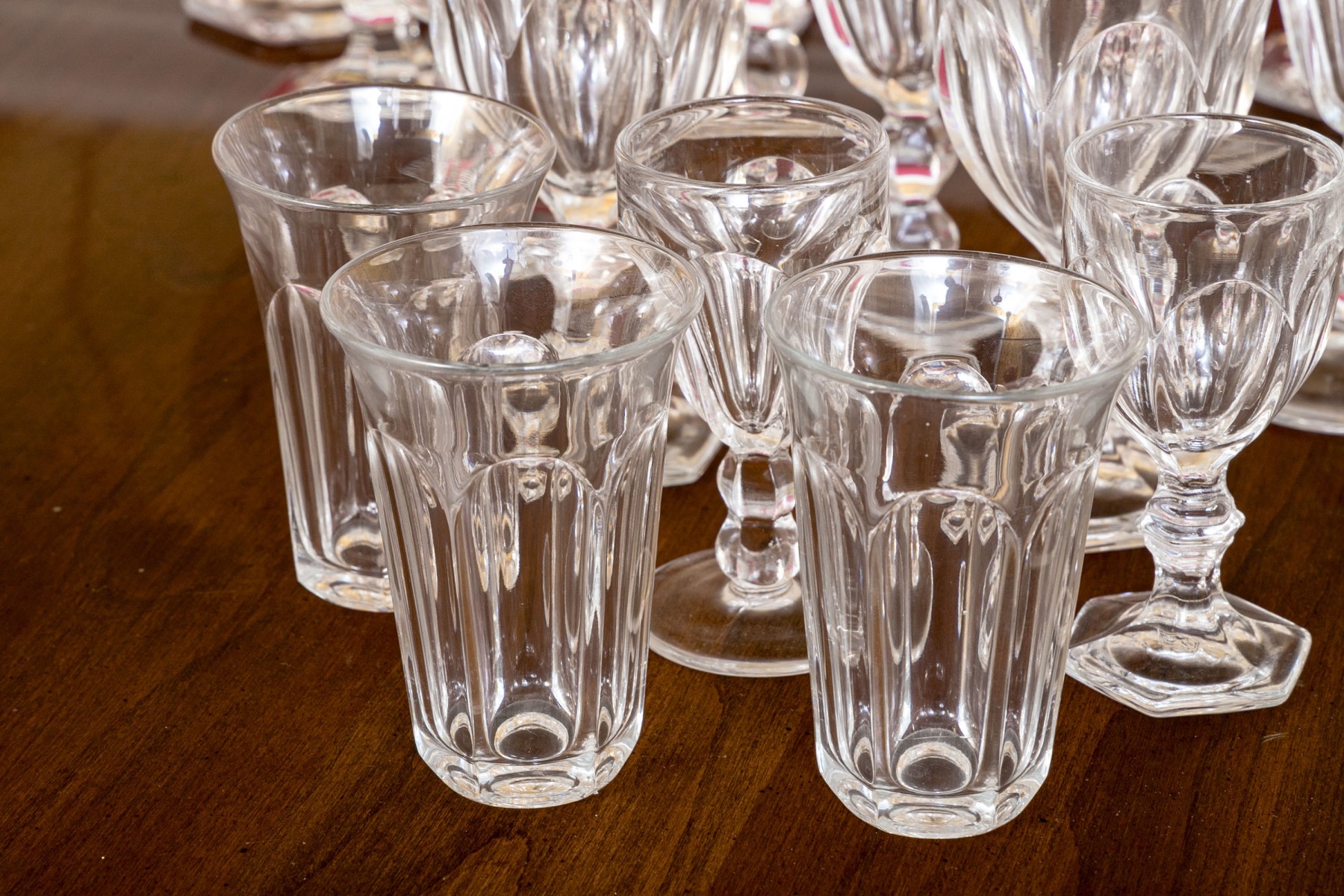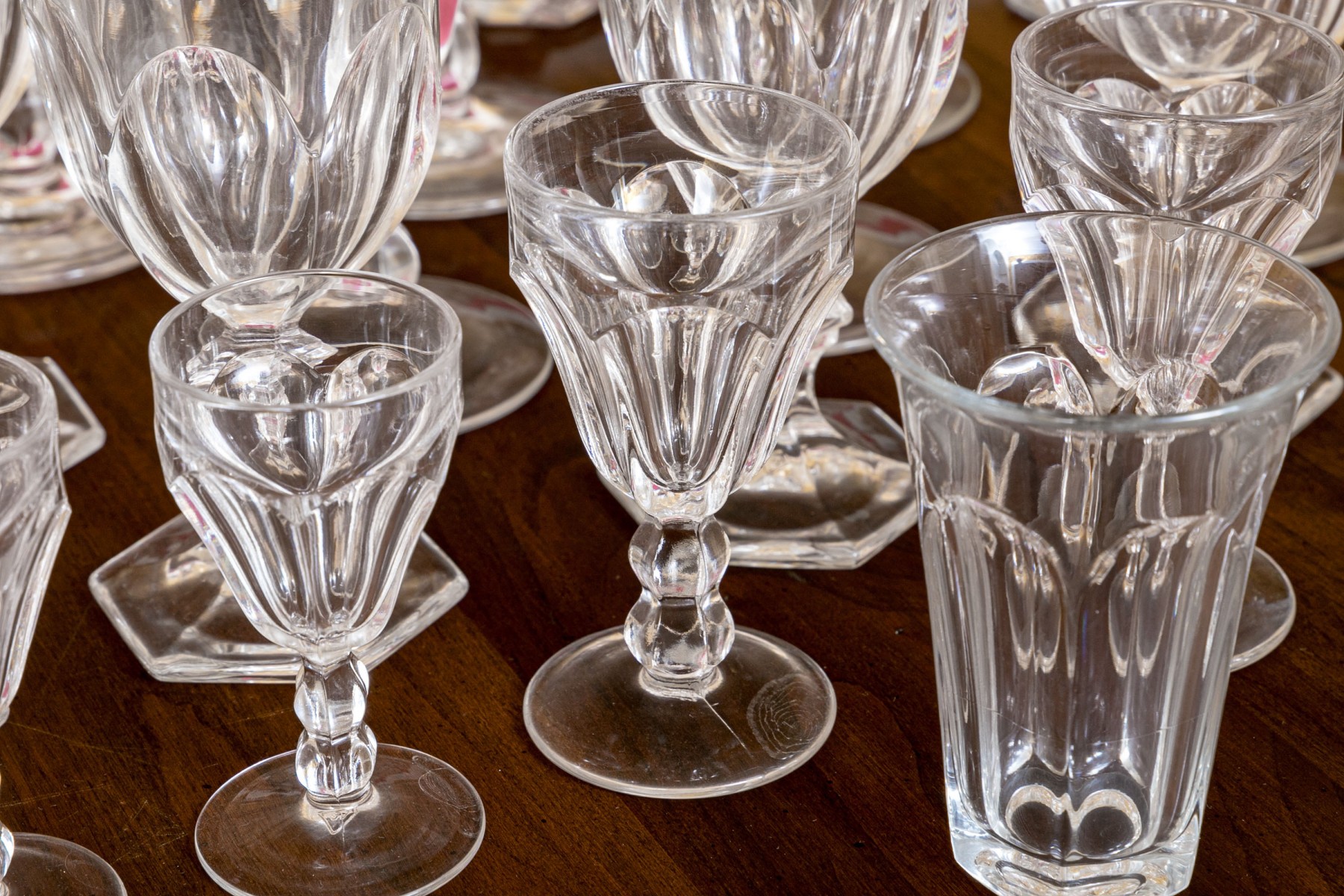 Comprised of 45 pieces including water glasses, wine glasses, cordials, and juice glasses. Some have hexoganol bases some have circular bases. Not all pieces marked.