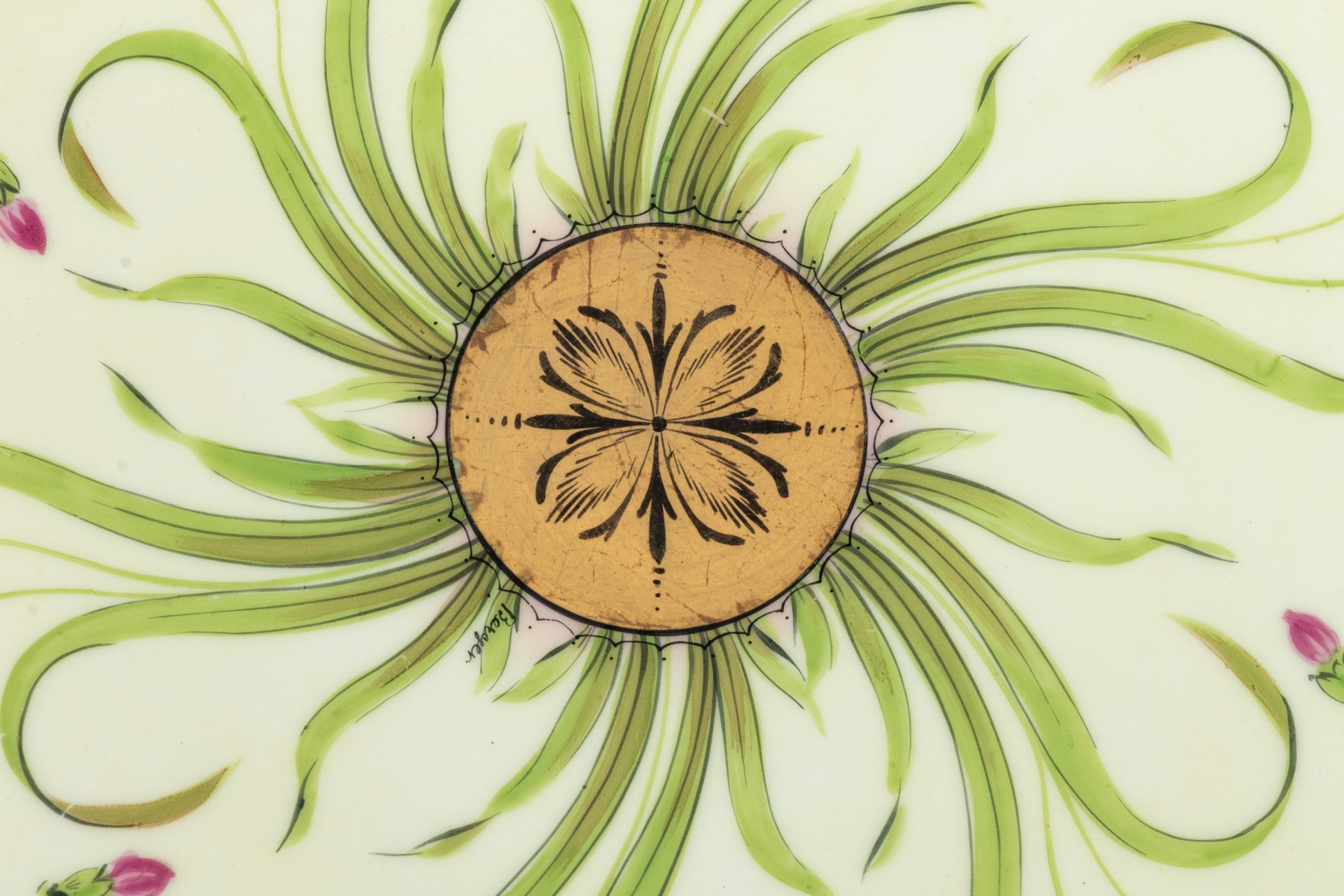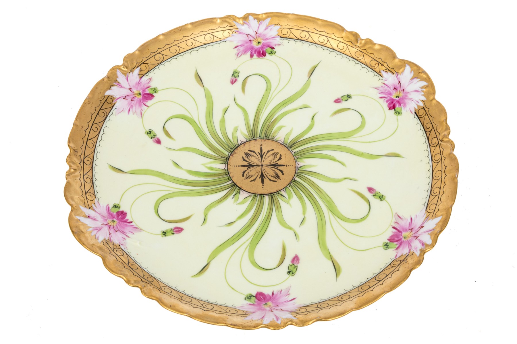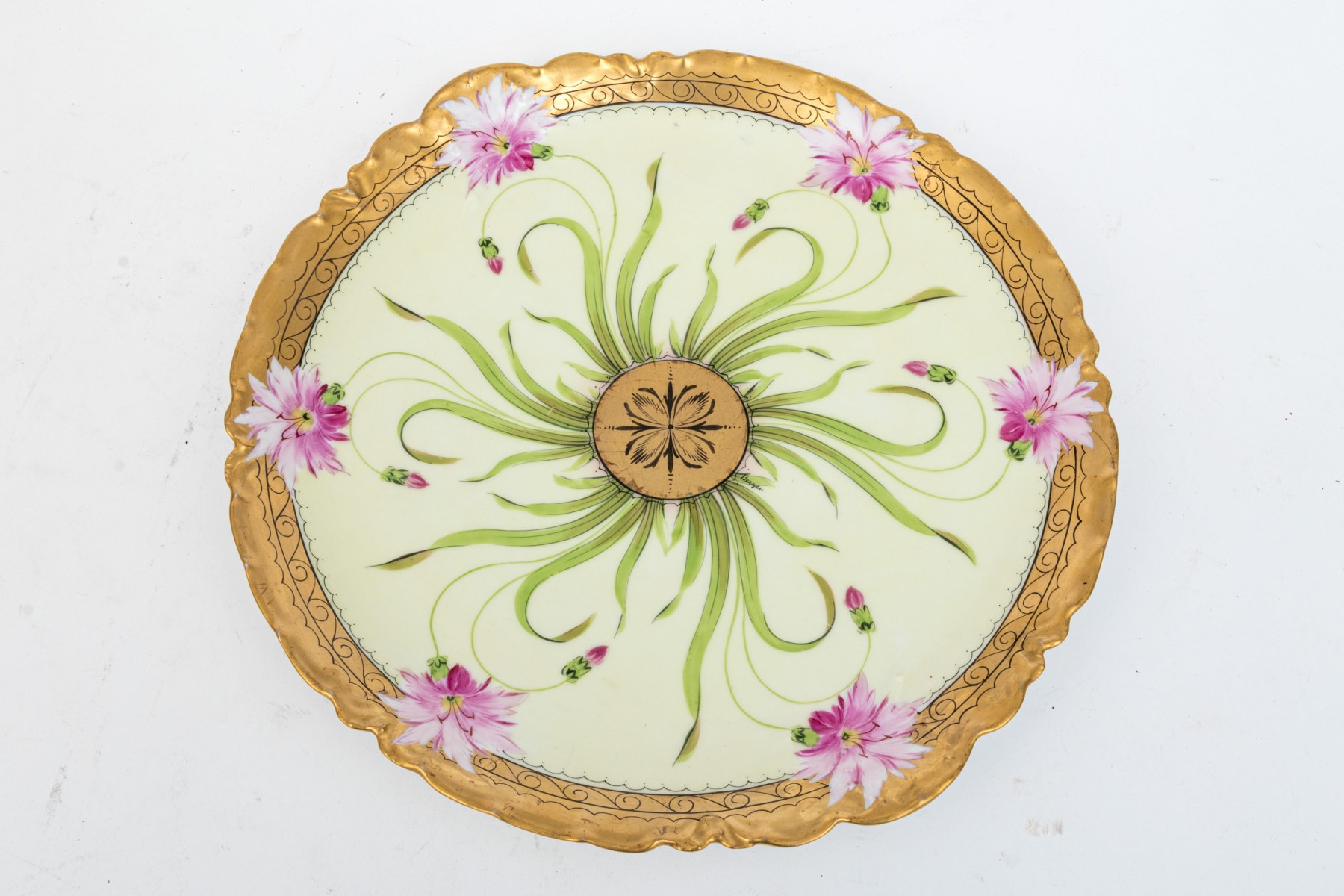 Cream ground with hand painted floral decoration and gold leaf border and center medallion.