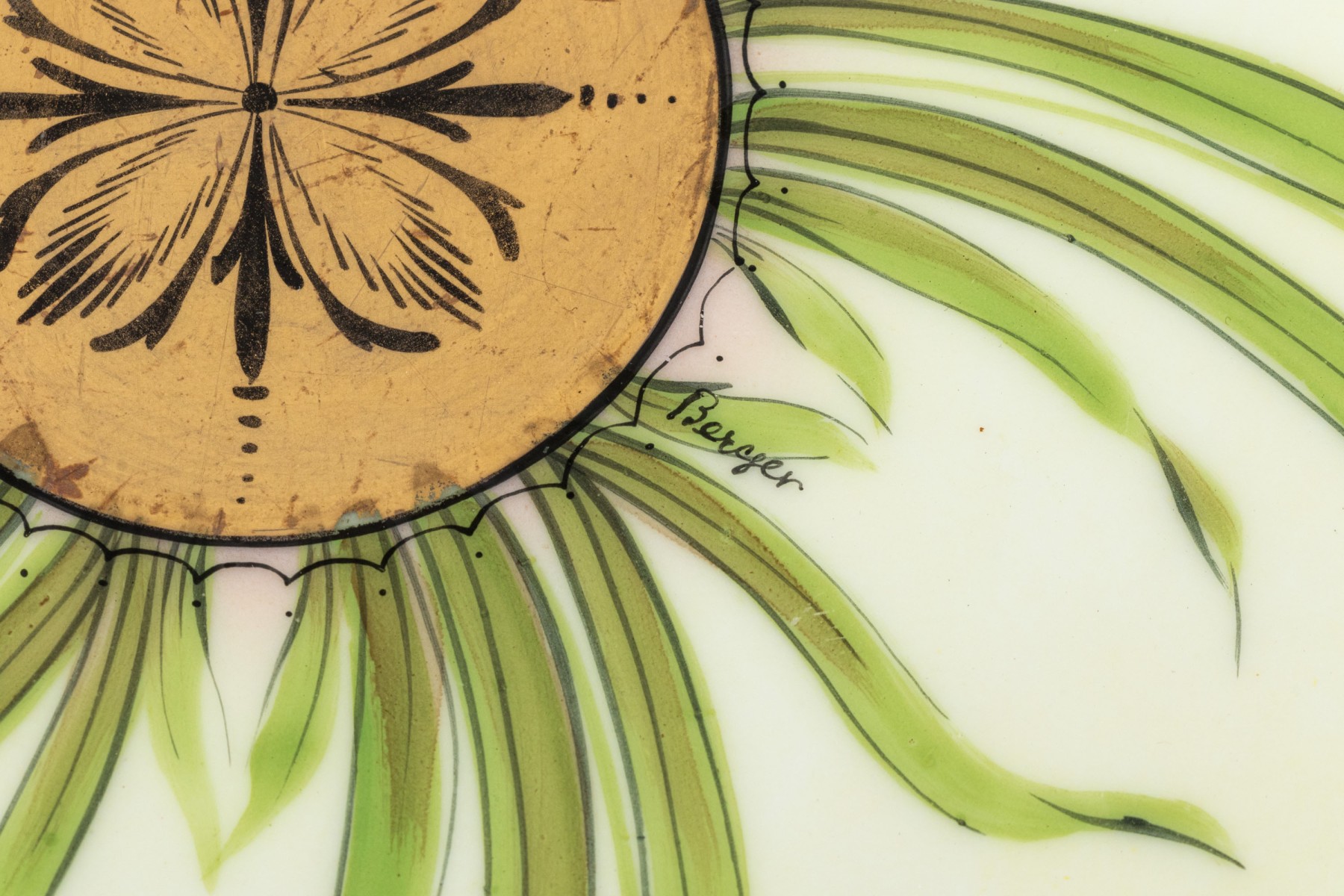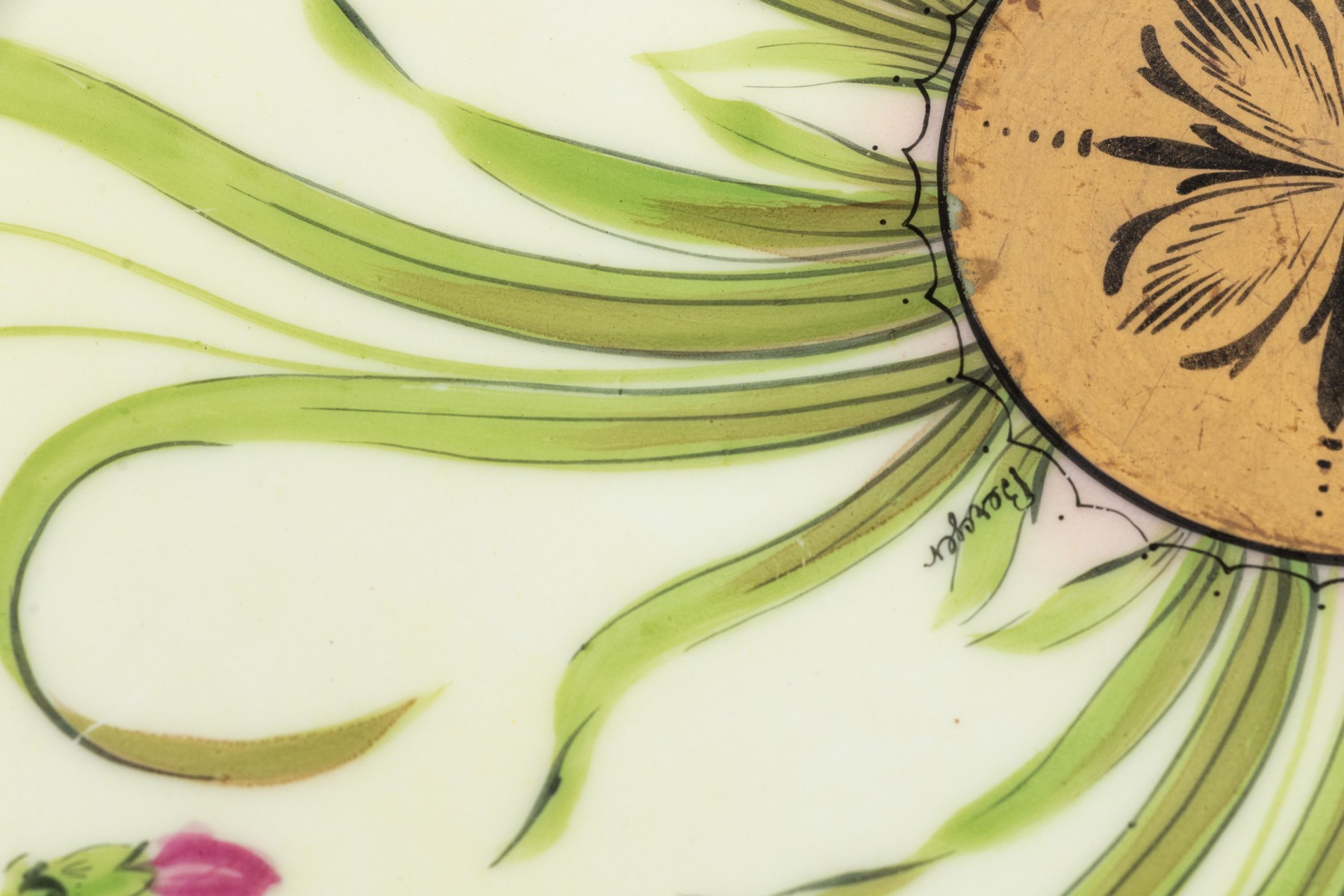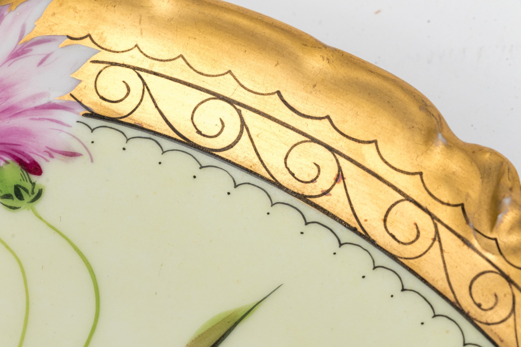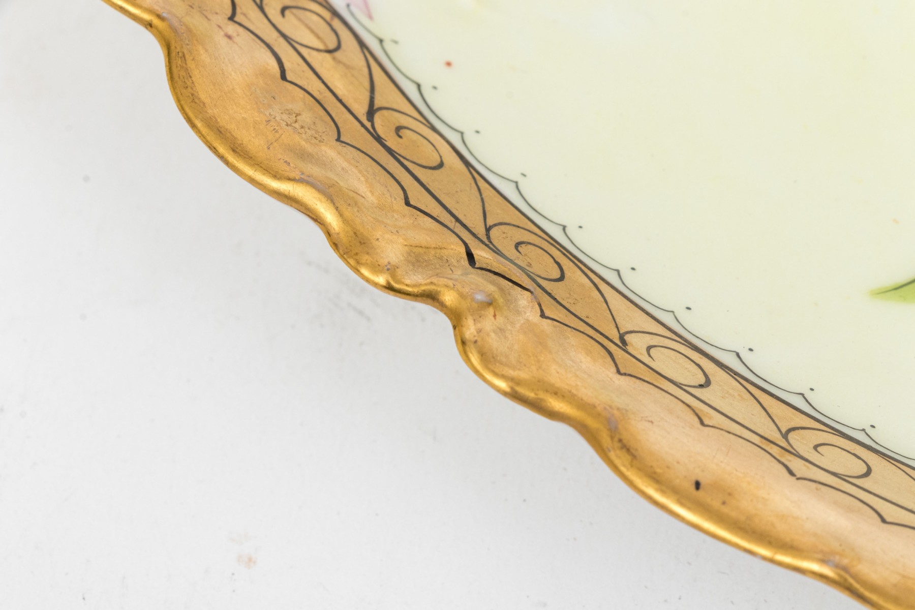Cream ground with hand painted floral decoration and gold leaf border and center medallion.