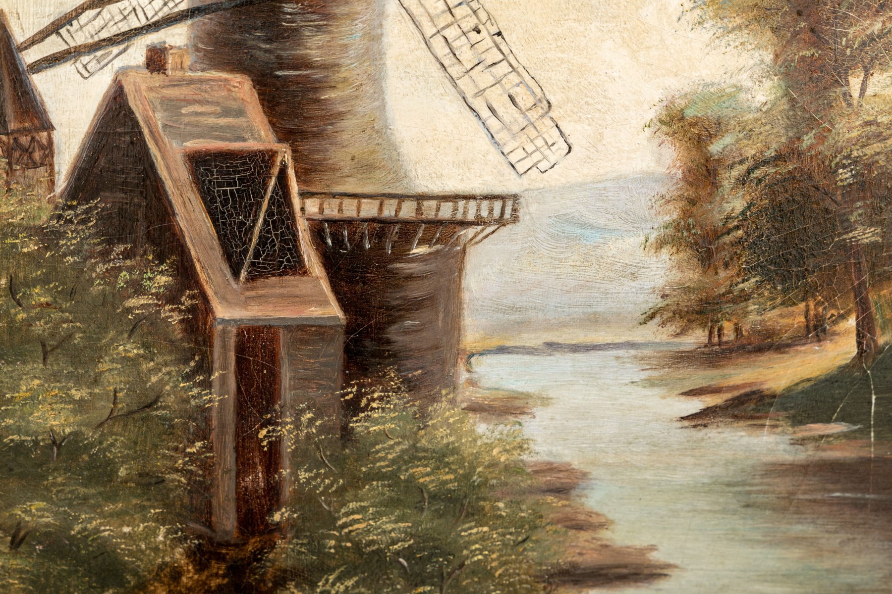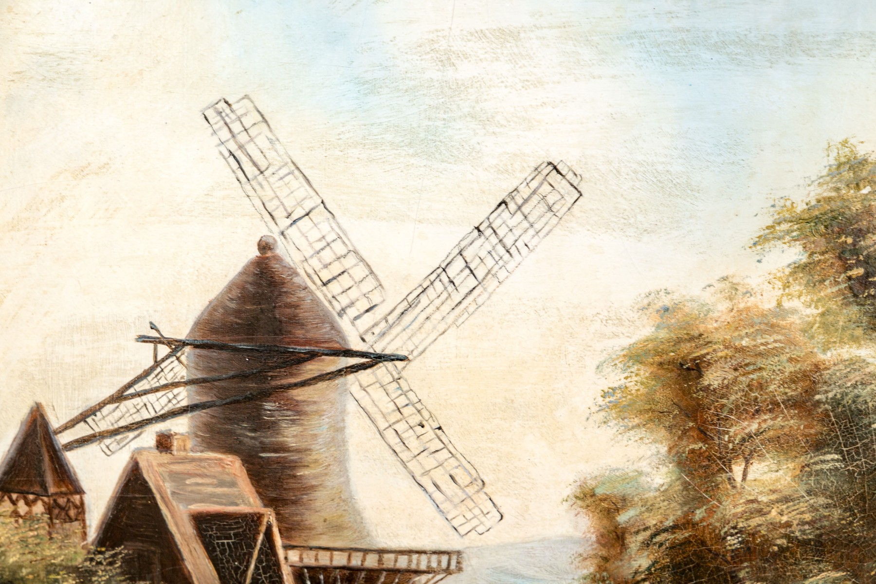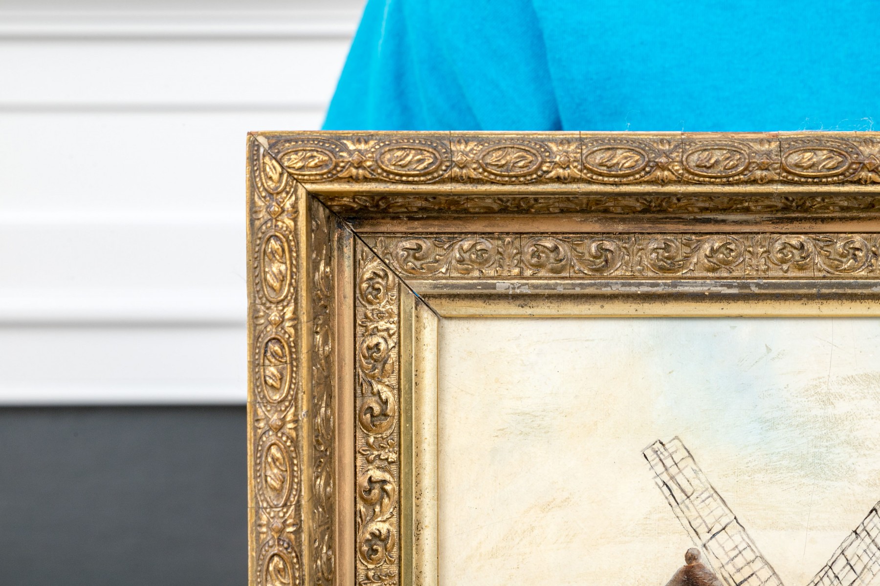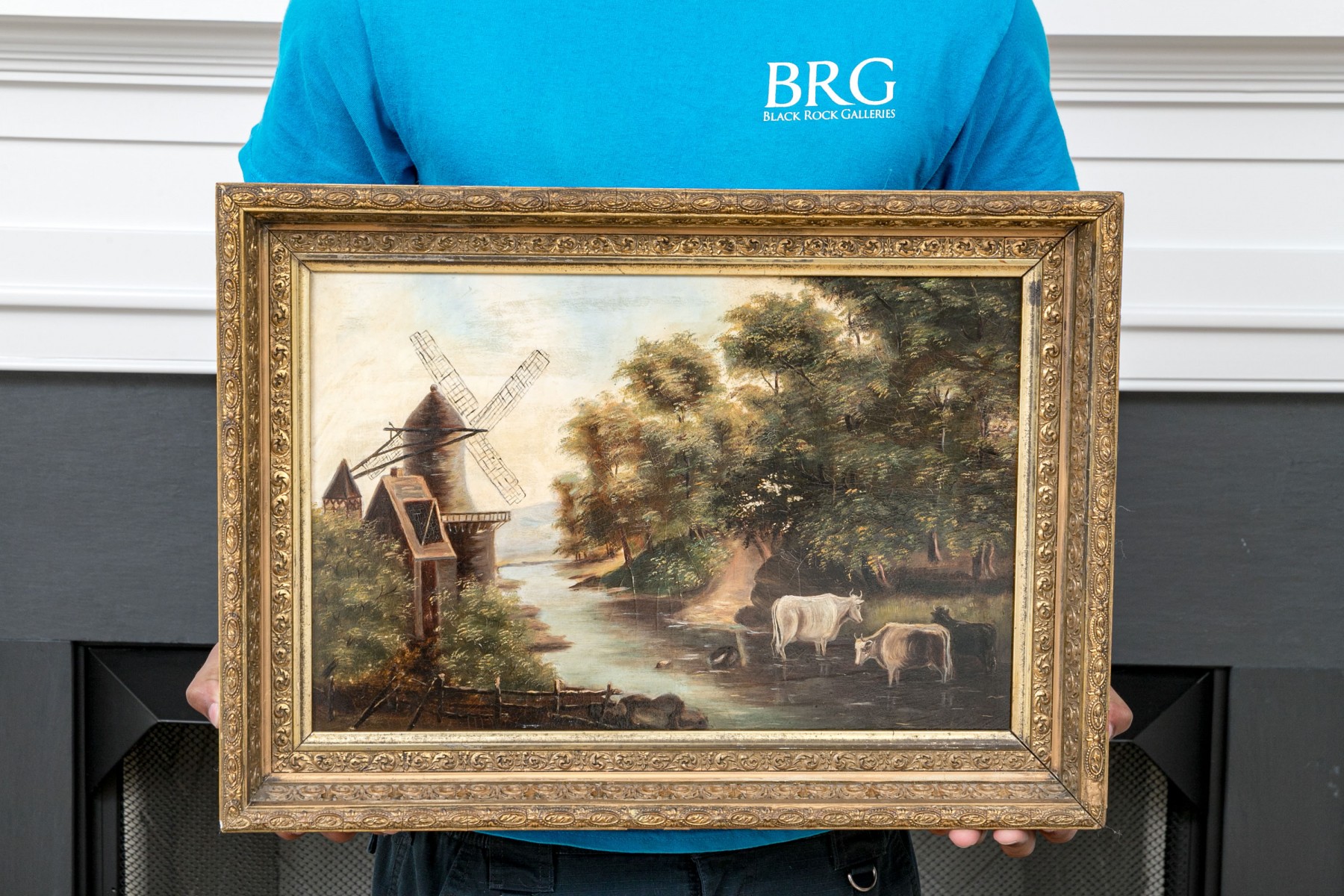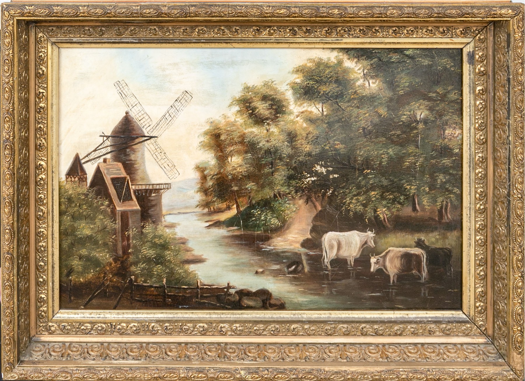 A pastoral landscape with cows and a riverside windmill. Apparently unsigned. In original gilt frame.