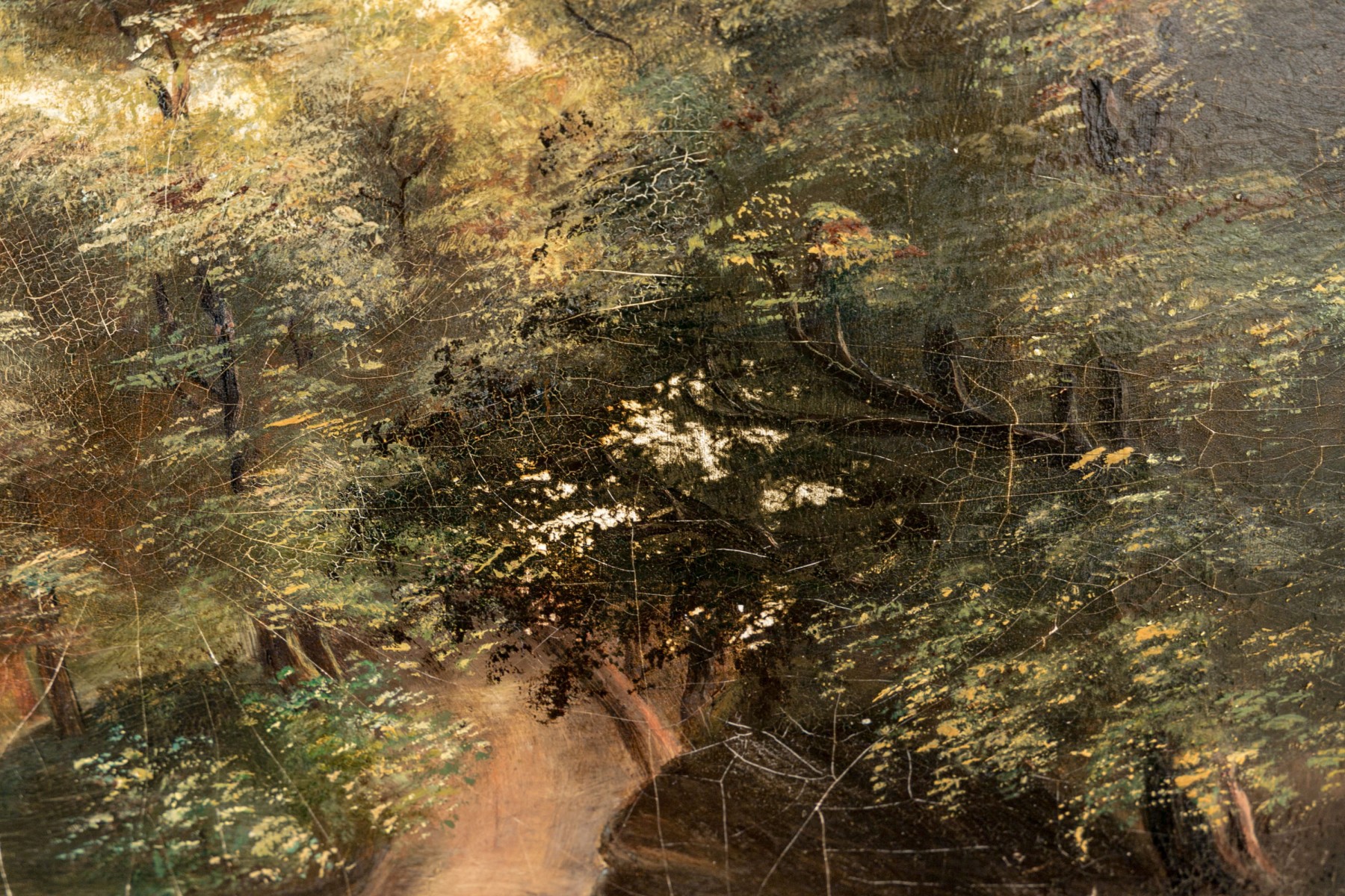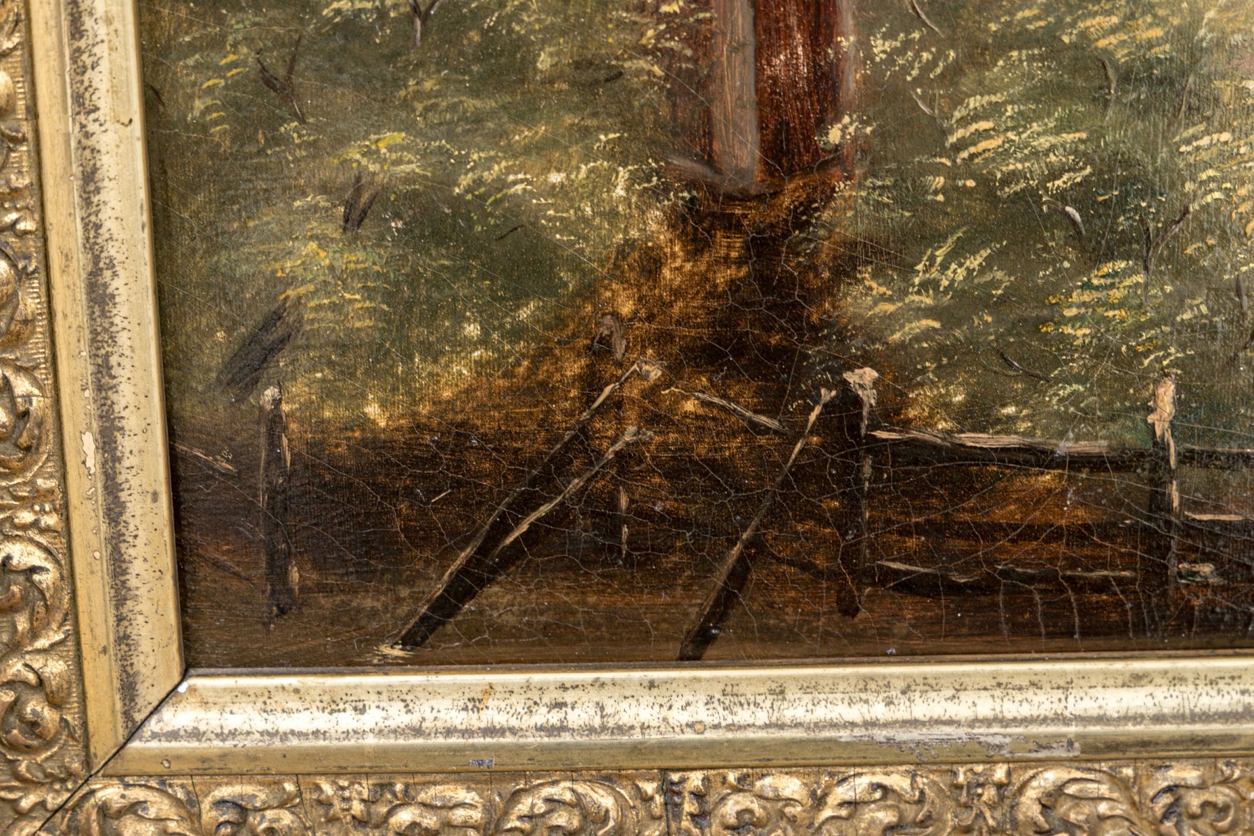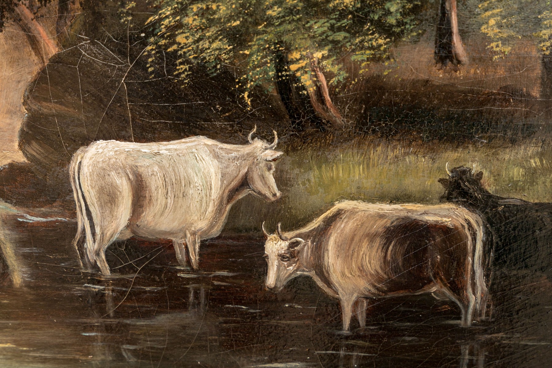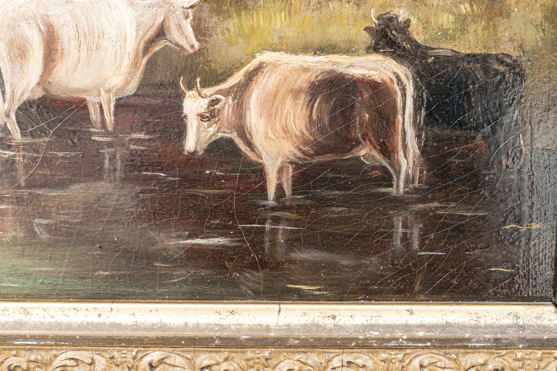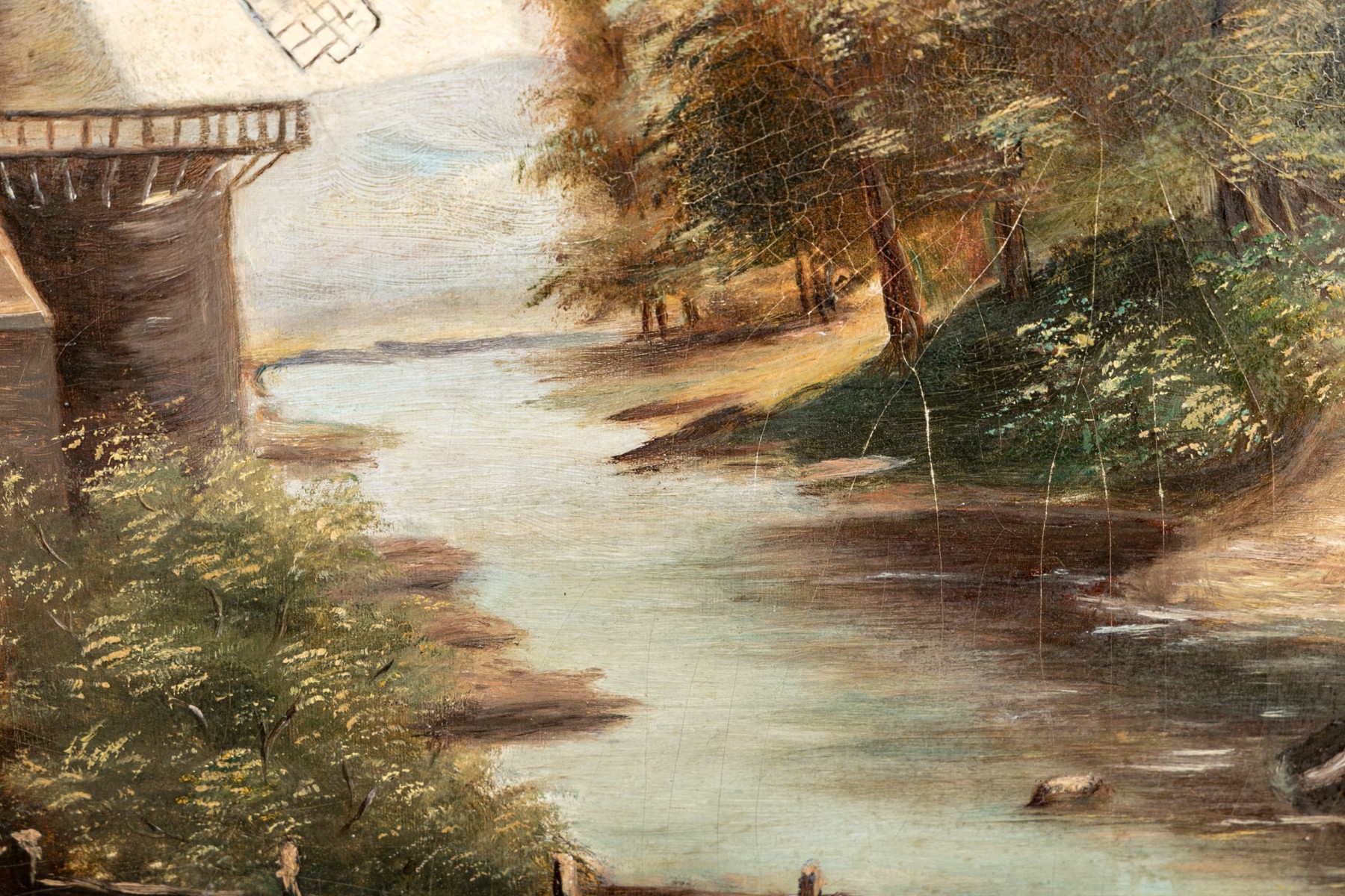 A pastoral landscape with cows and a riverside windmill. Apparently unsigned. In original gilt frame.