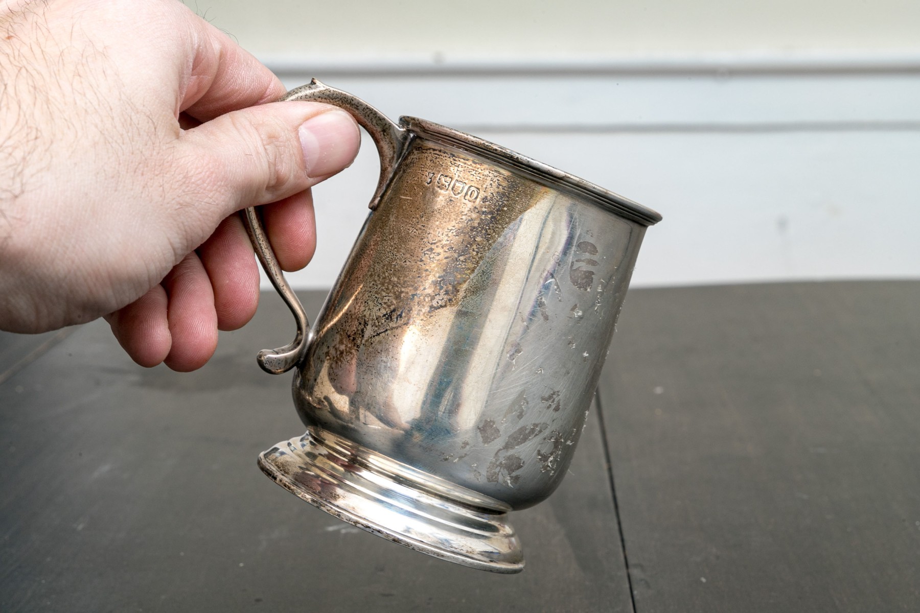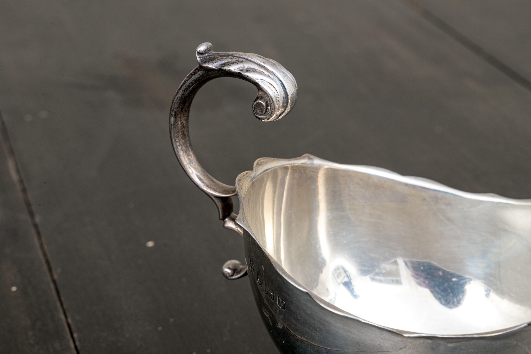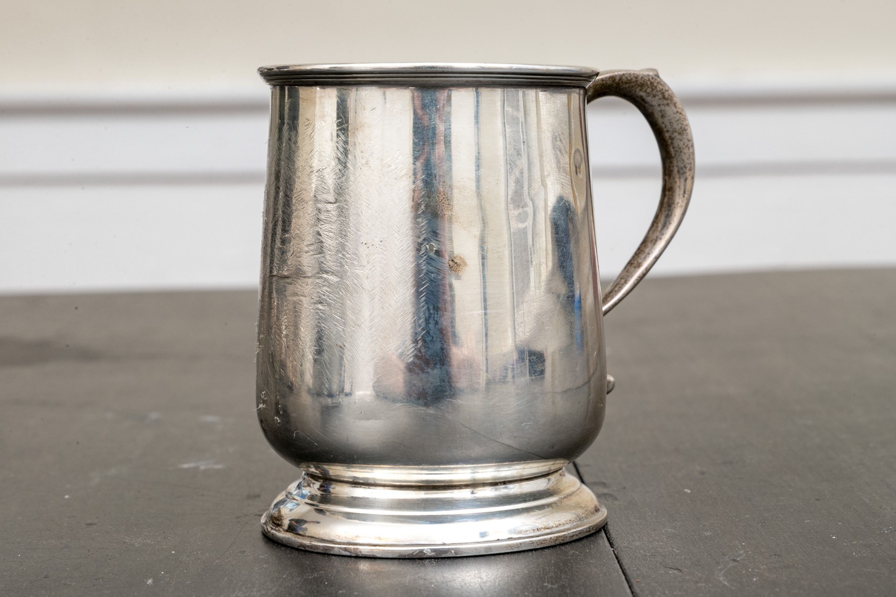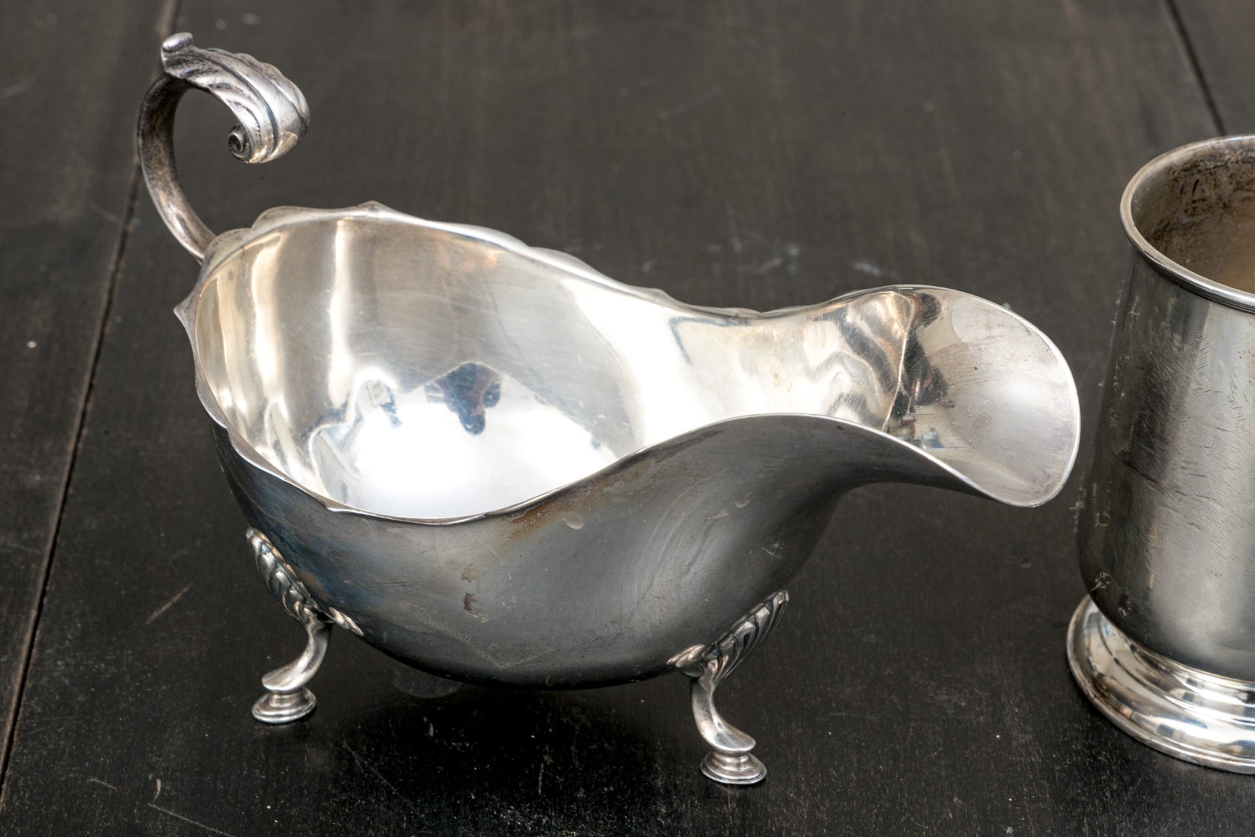A Georgian London mug together with a Birmingham marked silver sauceboat on three legs with scroll form handle.