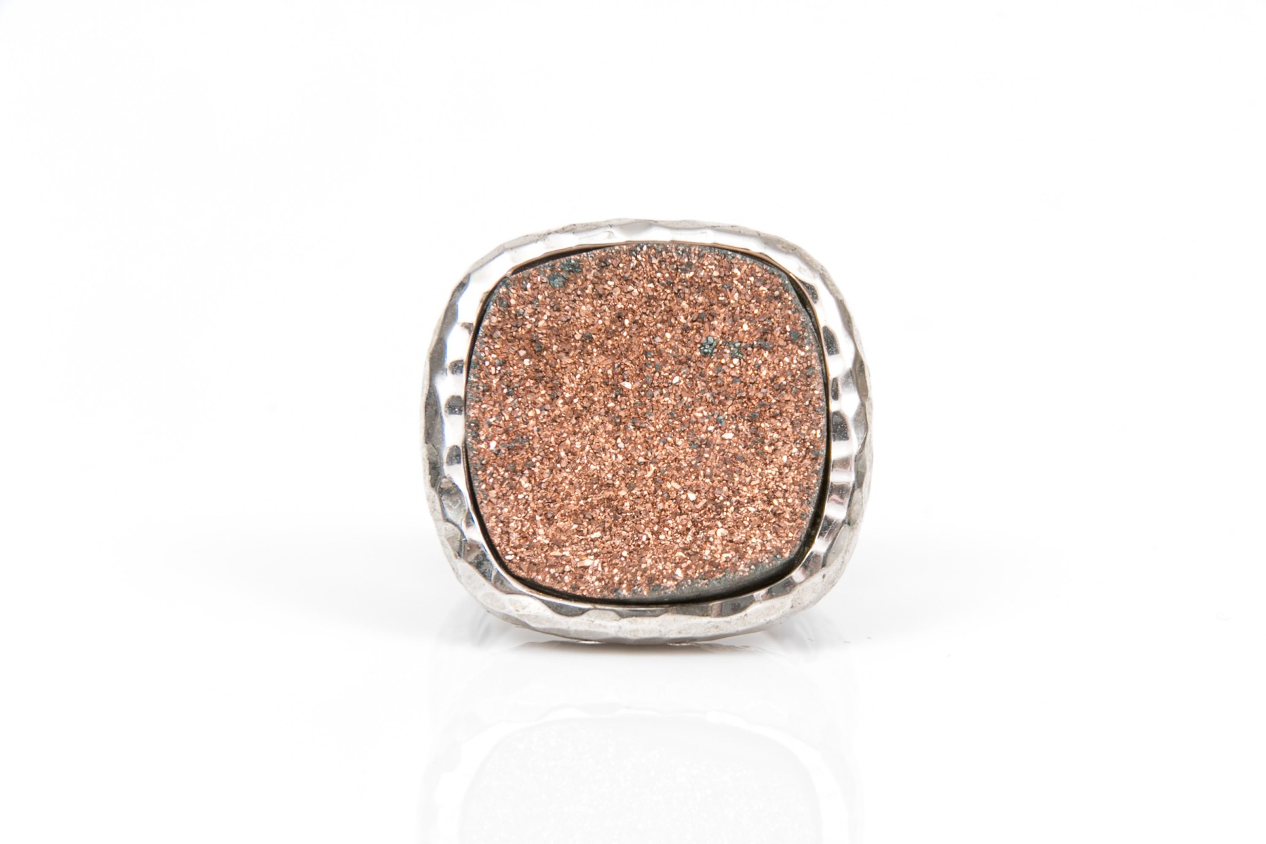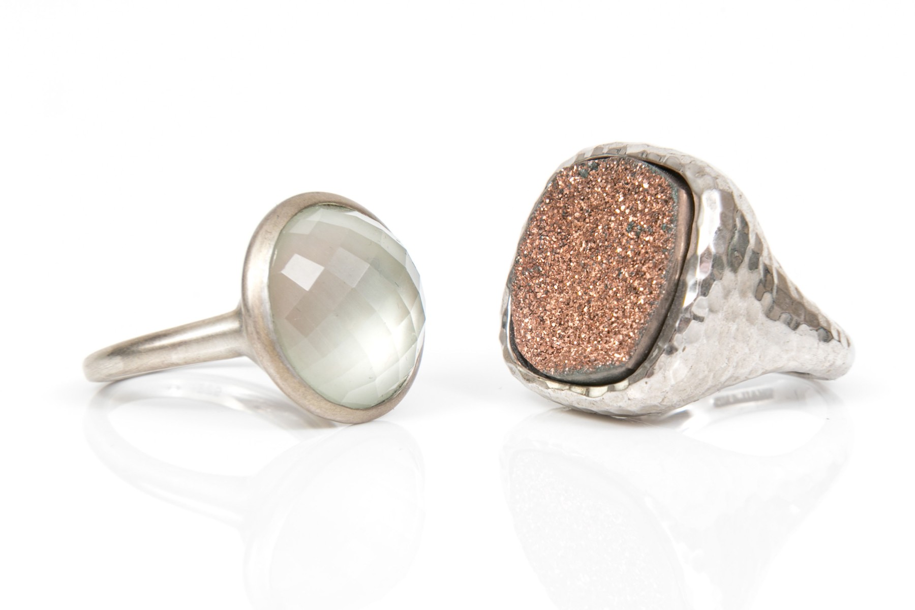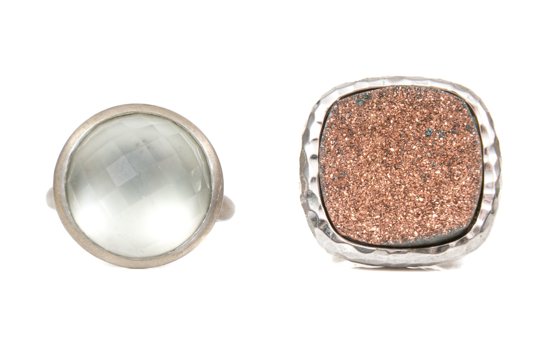 Dimensions: 7/8" Across Top-Druzy Ring, 11/16" Across Top-Checkered Green quartz Ring