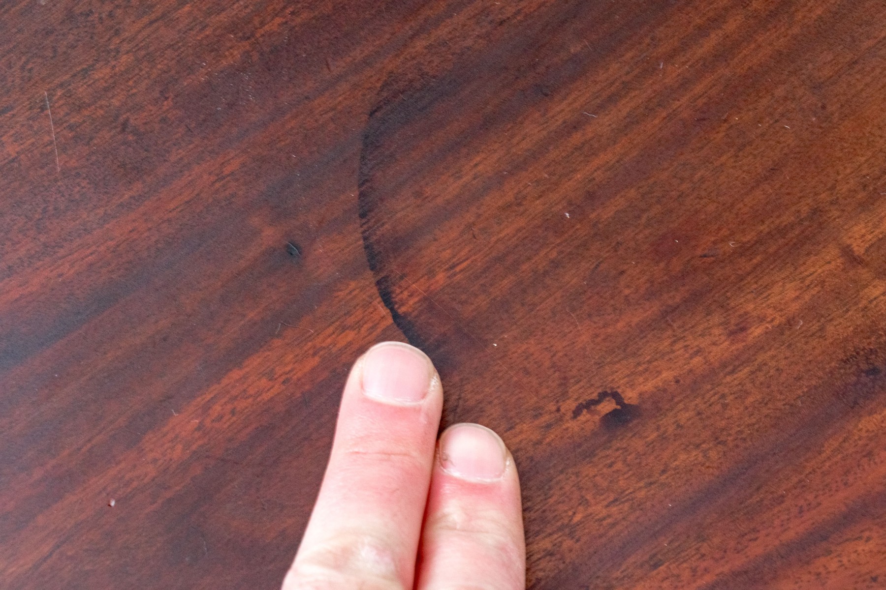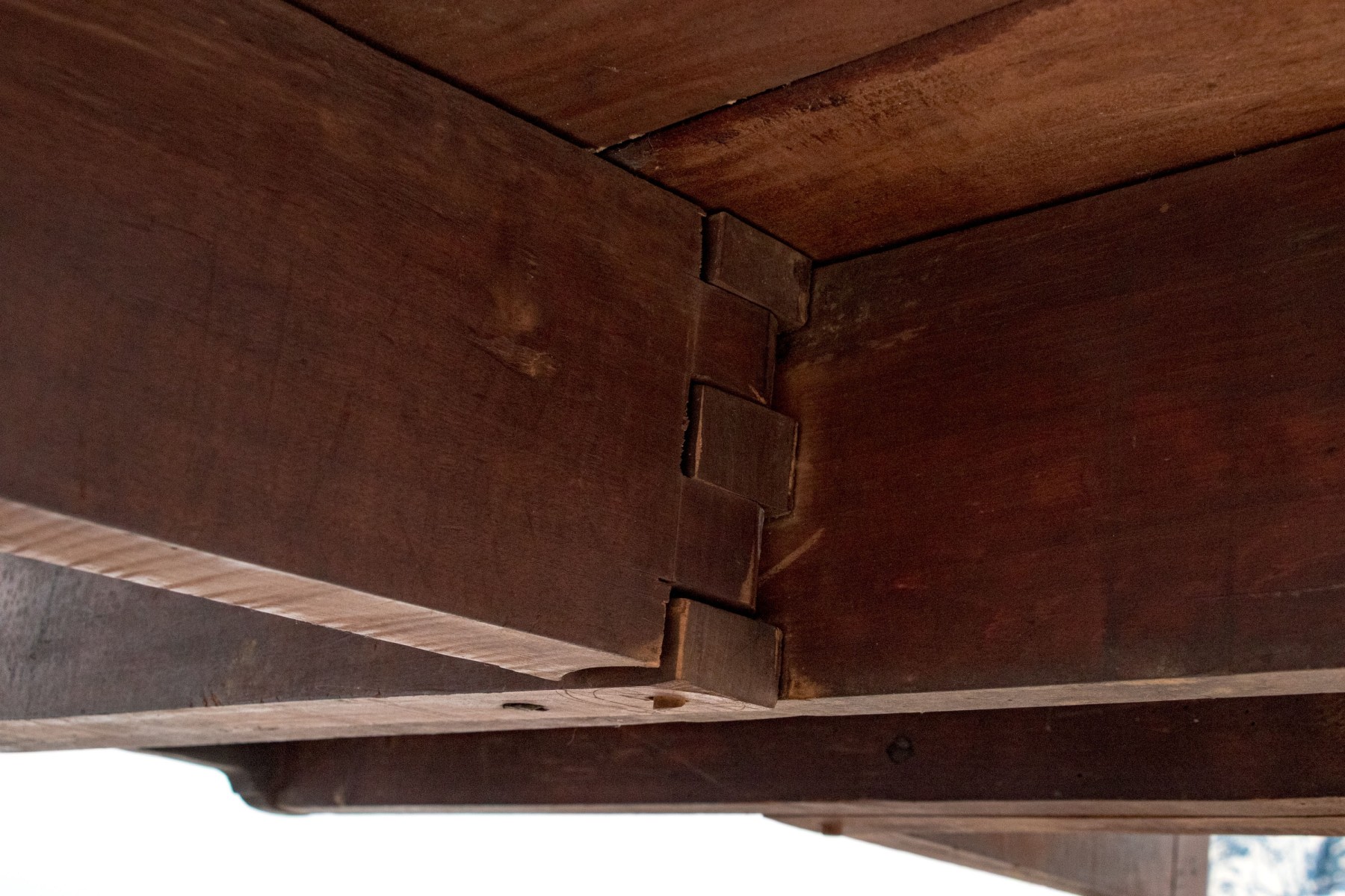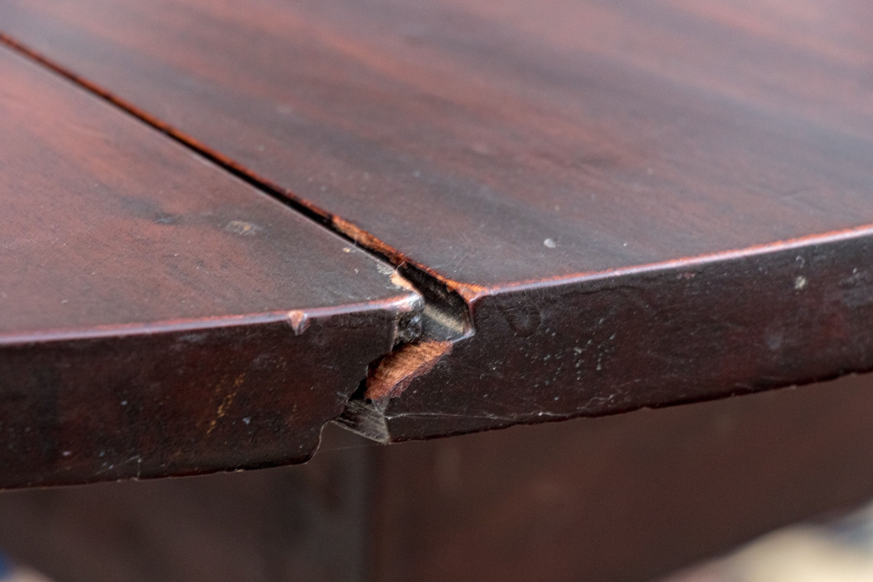 Stains and chips around the trim edges with three splits to the center panel. Chipping to the drop leaves where it meets the center panel with raised. Nice deep rich finish.