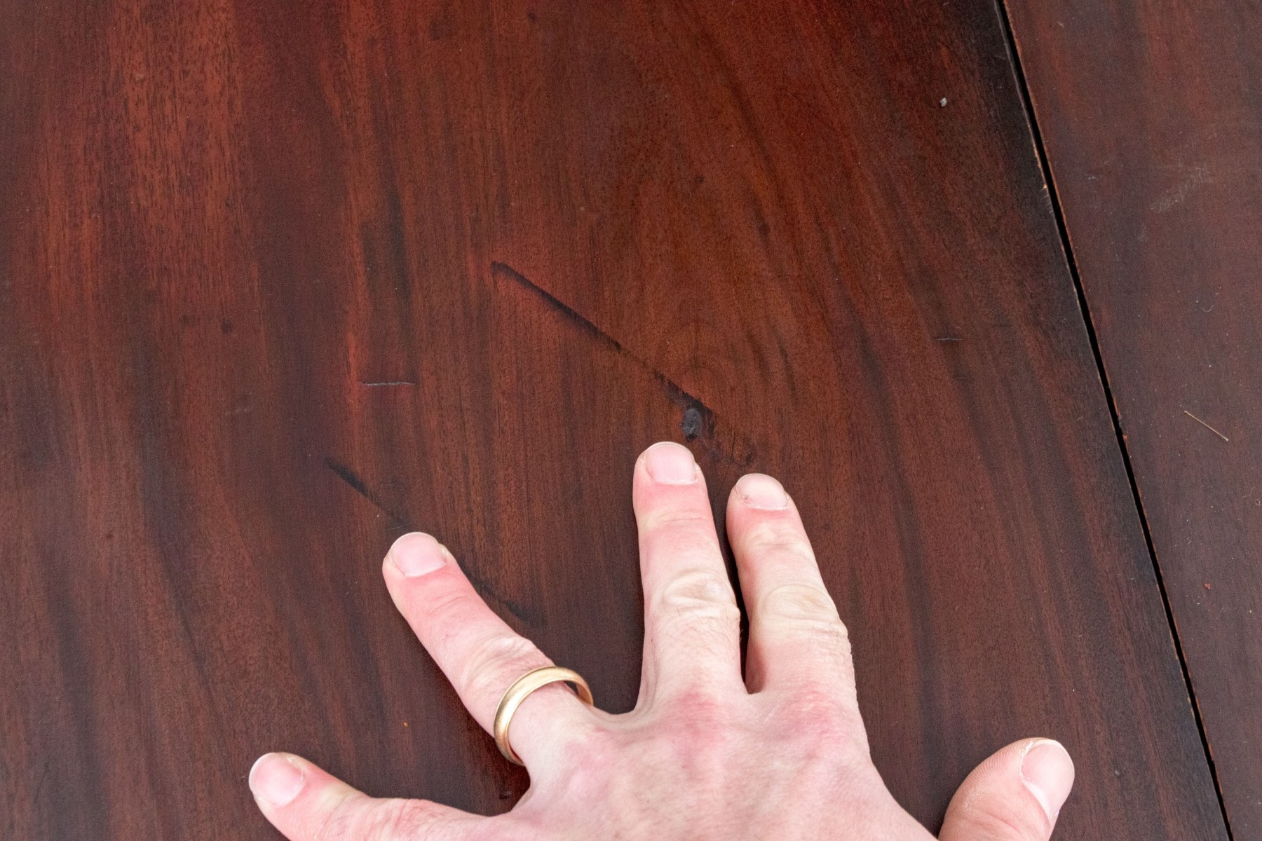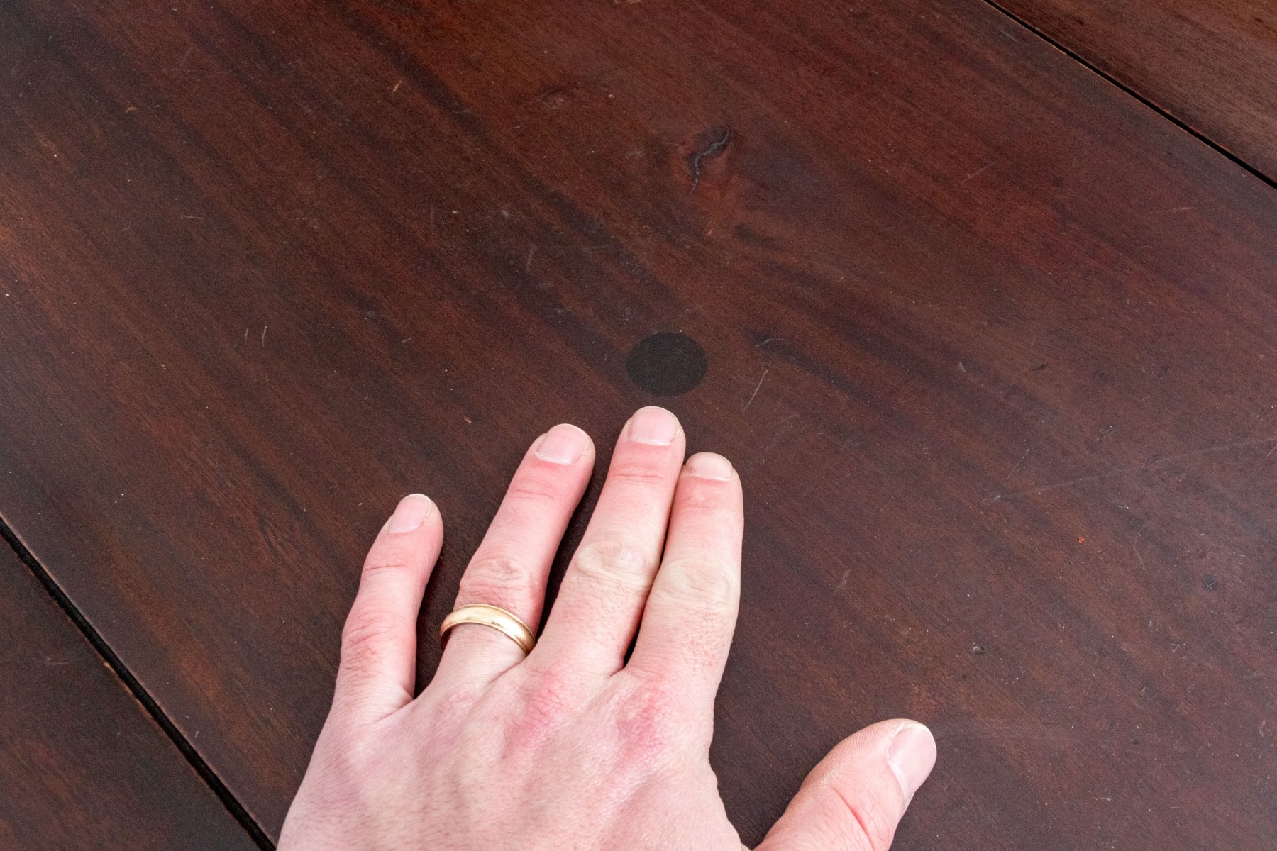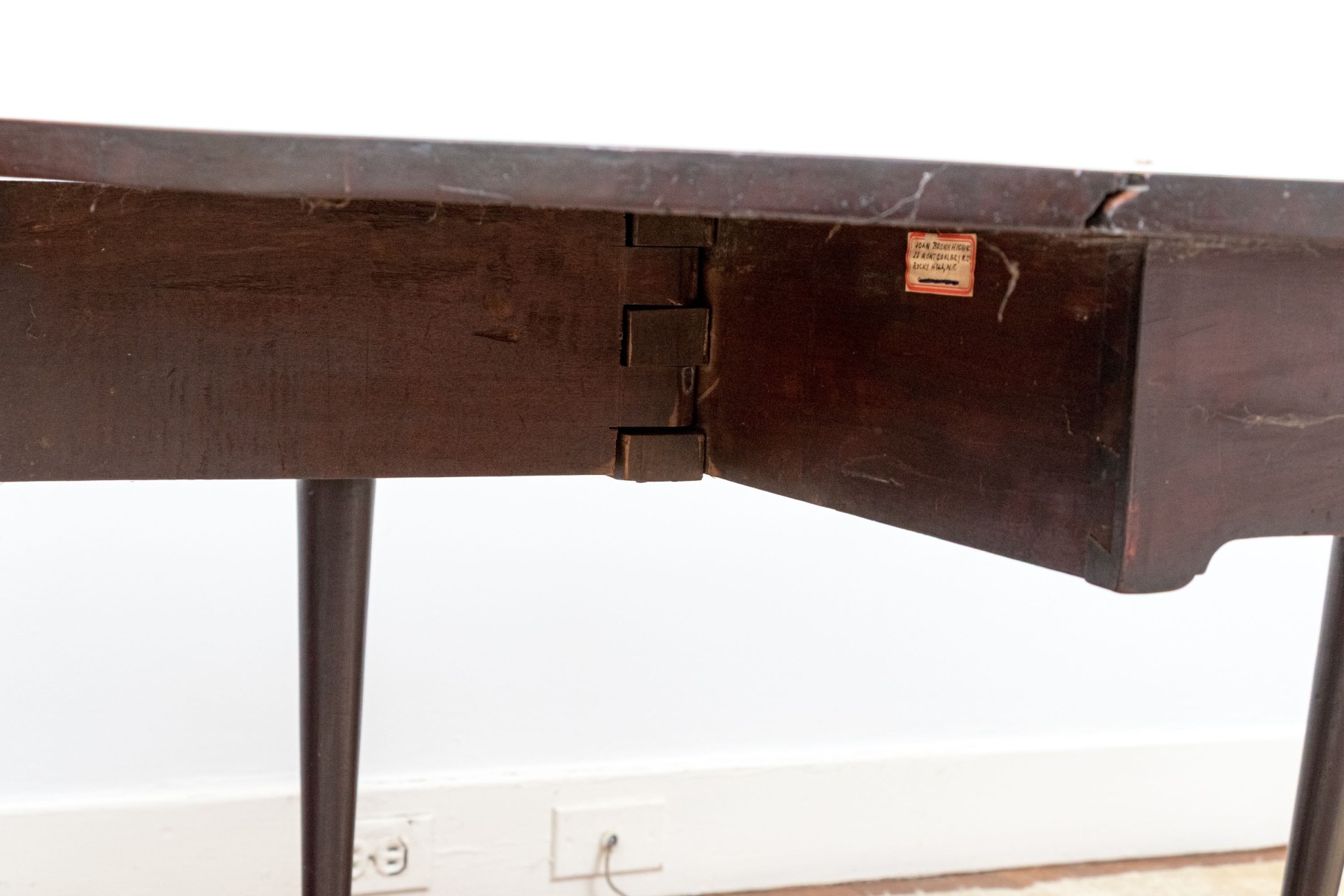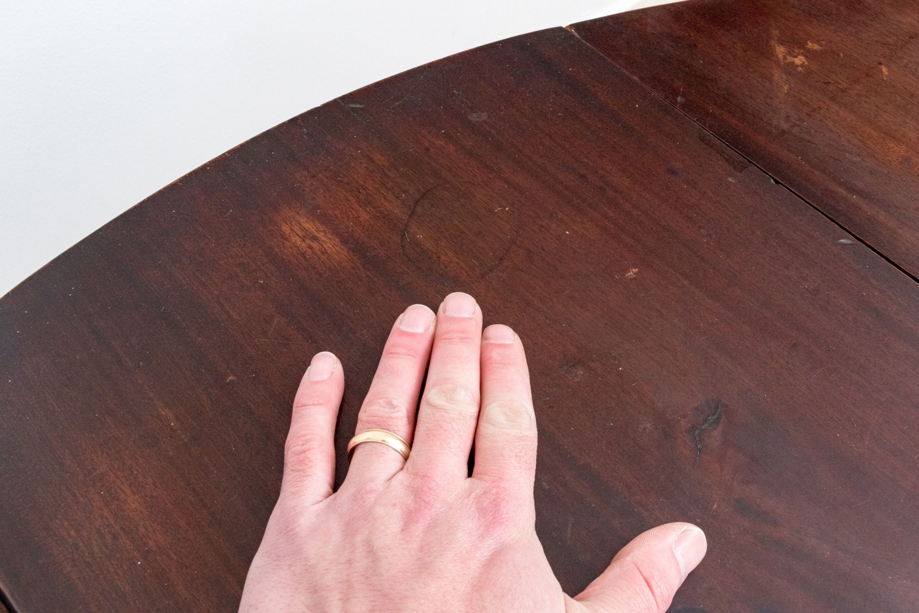 Stains and chips around the trim edges with three splits to the center panel. Chipping to the drop leaves where it meets the center panel with raised. Nice deep rich finish.