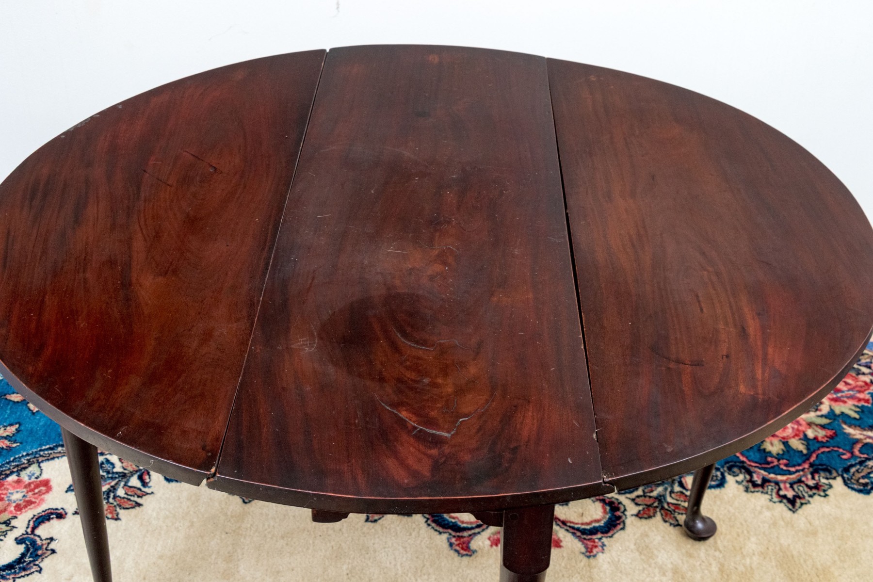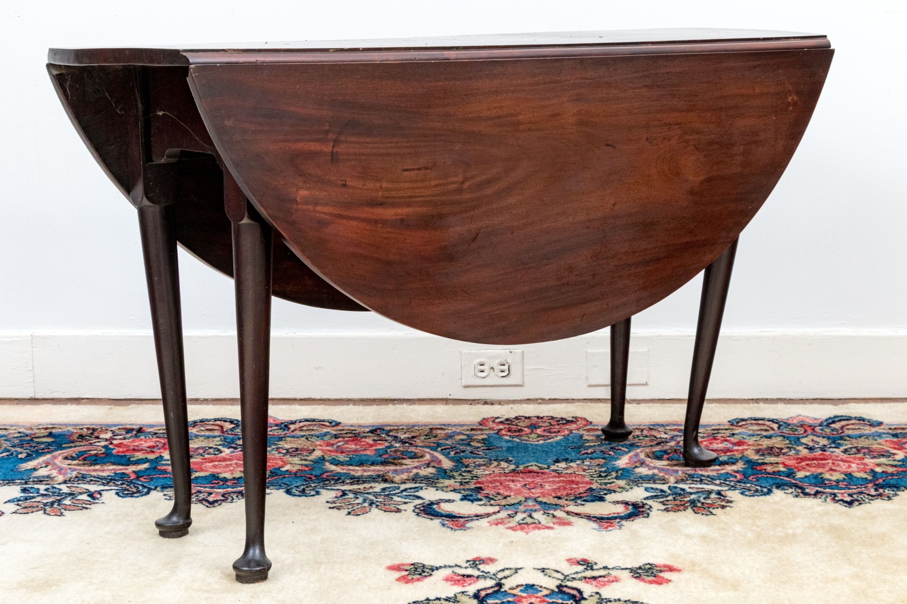 A delightful antique Queen Anne drop leaf tea table in rich dark brown mahogany. The table features large demilune leaves raised over a simply bracketed apron over cylindrical legs flaring out to pad feet. Bearing a sticker label marked Joan Brown Higgins underneath.