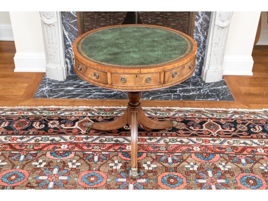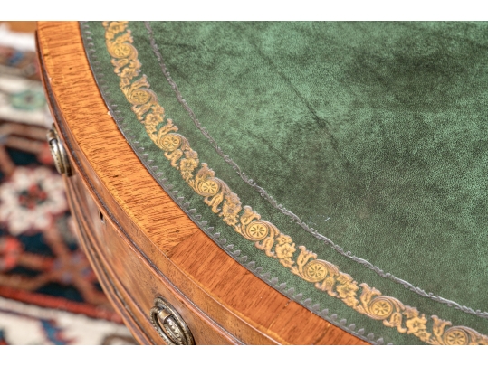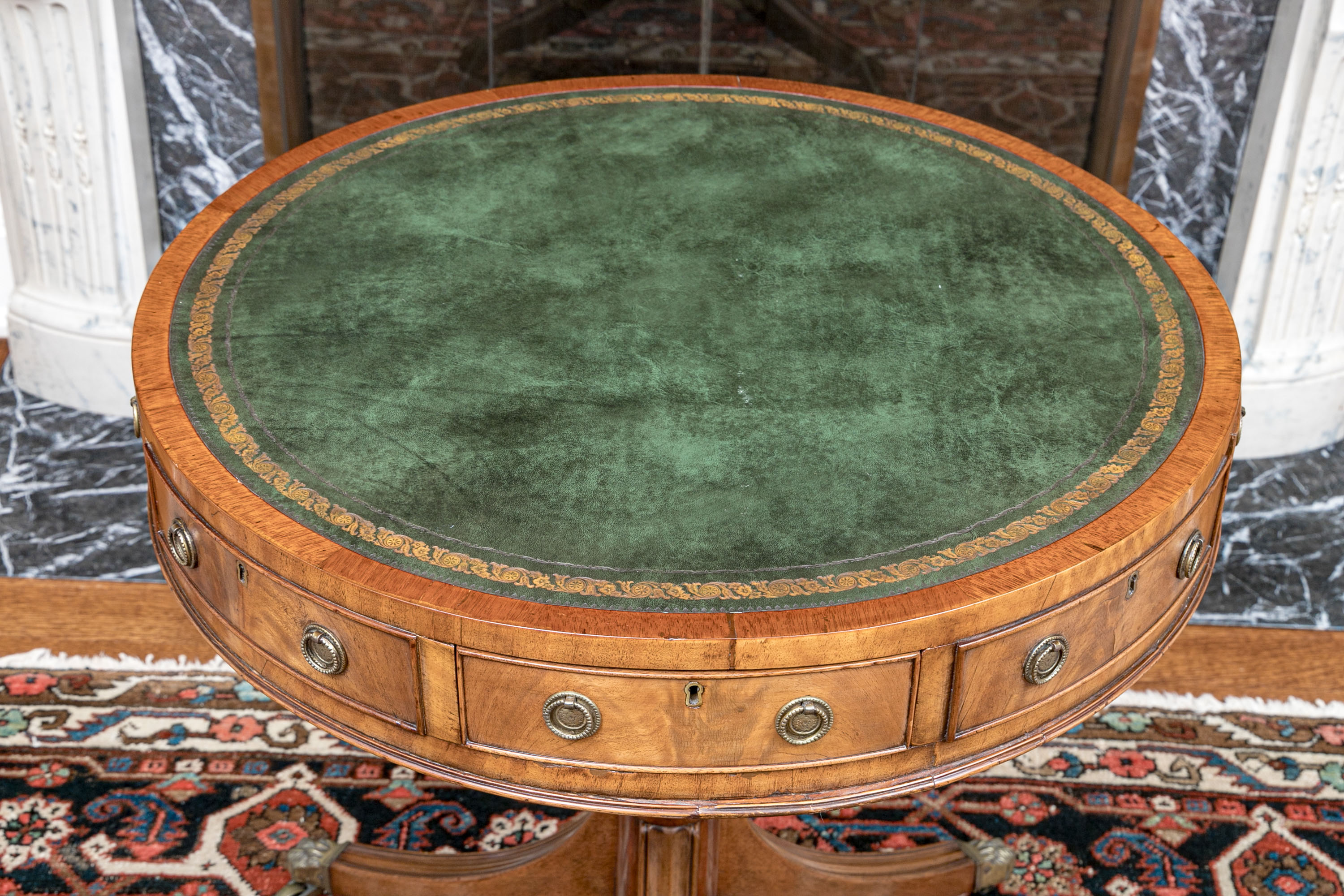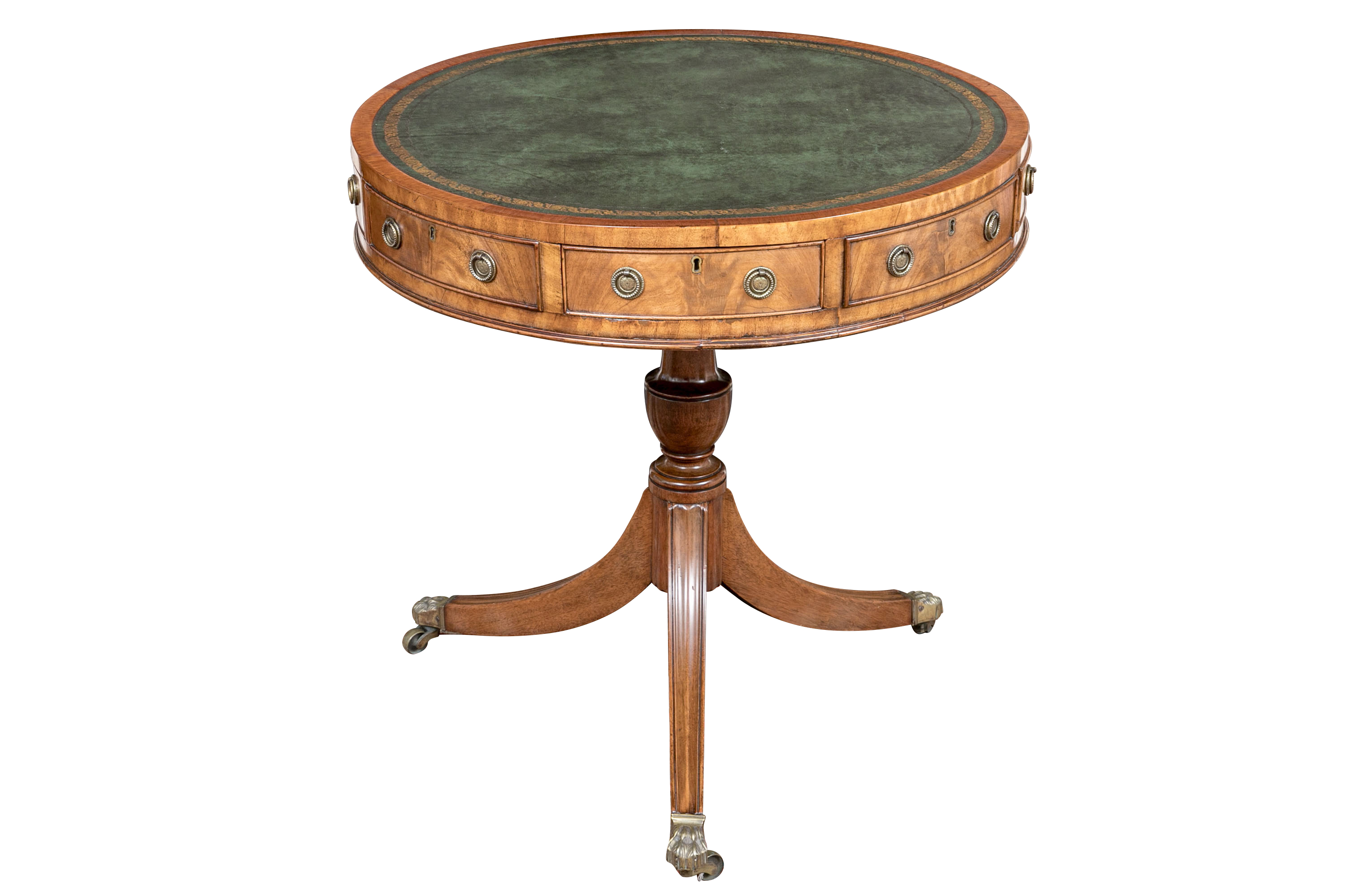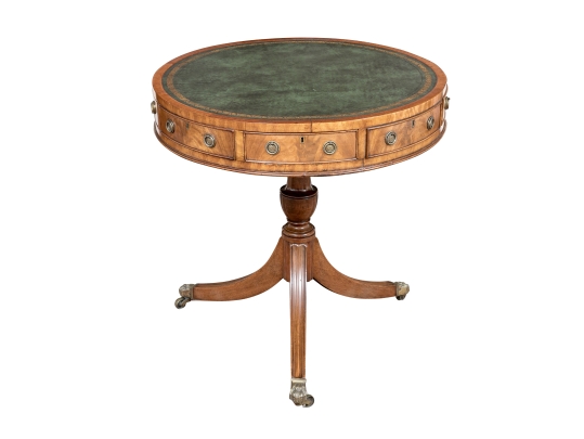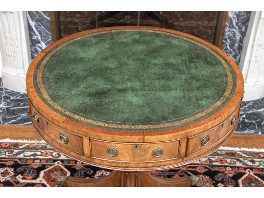 A beautifully crafted traditional Georgian Gilt-Embossed Green Leather Drum Table. With very fine Dove-Tailed drawers (Four are real and four are faux) and having delicate Brass Ring Pulls and inset brass Key Escutcheons. The wood is handsome and the drawer front panels utilize very decorative Flame Mahogany. The table top has Gilt-Embossed leather and the color contrasts beautifully with the Mahogany framing. The Pedestal base is comprised of a Classic turned Urn Form Support surmounting three gracefully carved legs terminating in powerful Lion’s Paw feet and riding on Brass Castors. The attention to detail, chosen woods, fine form and great condition all contribute to a most desirable piece of Georgian history.