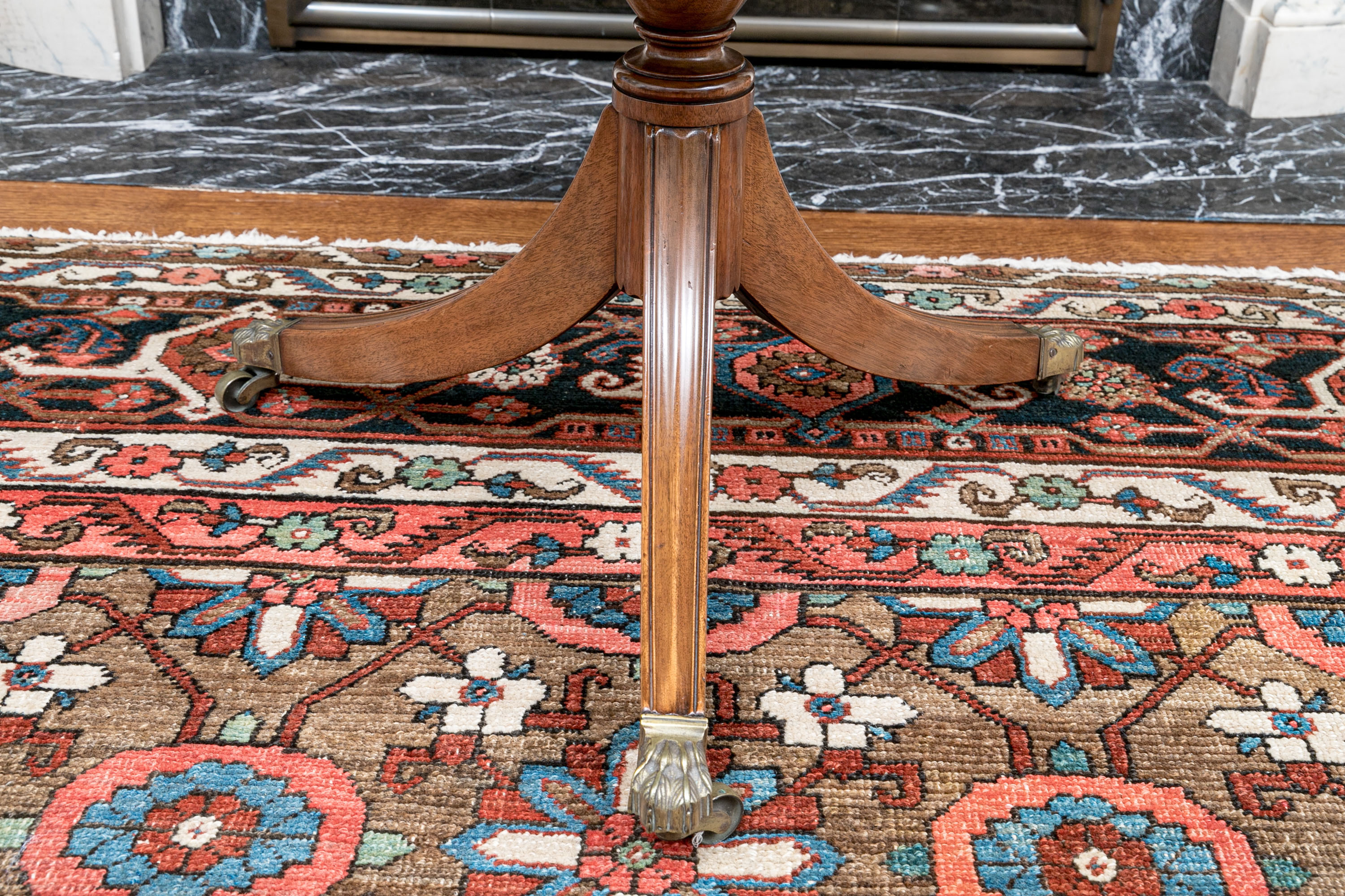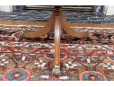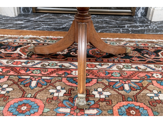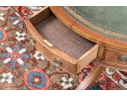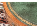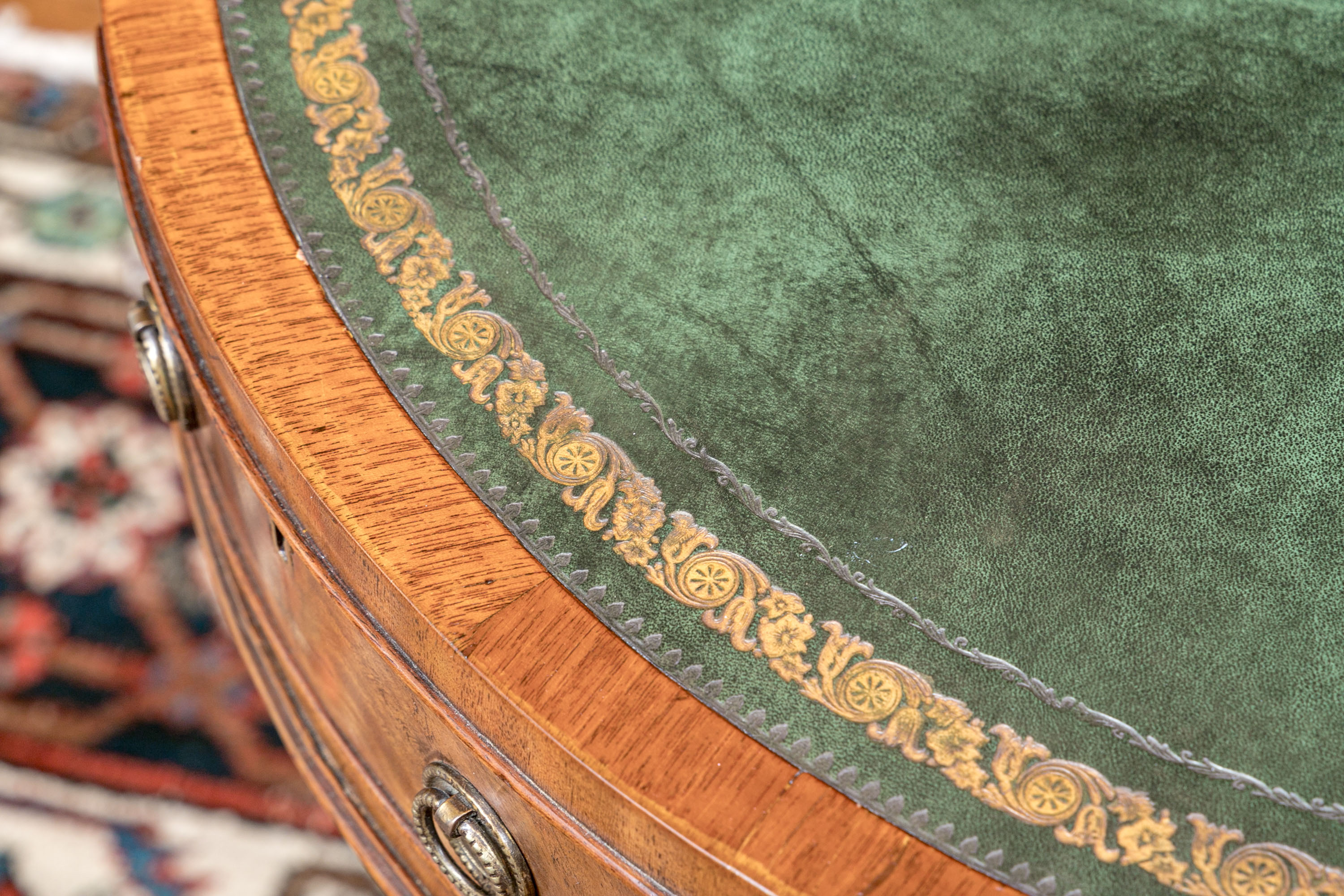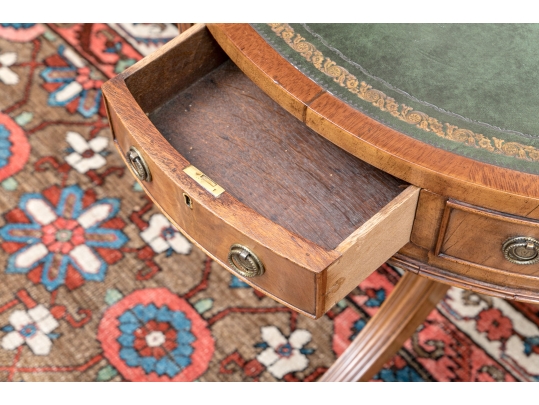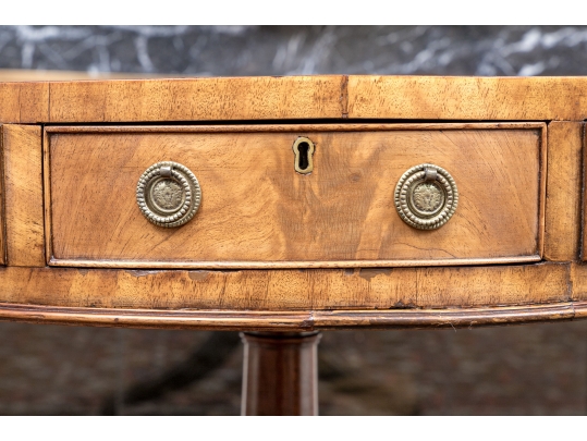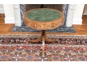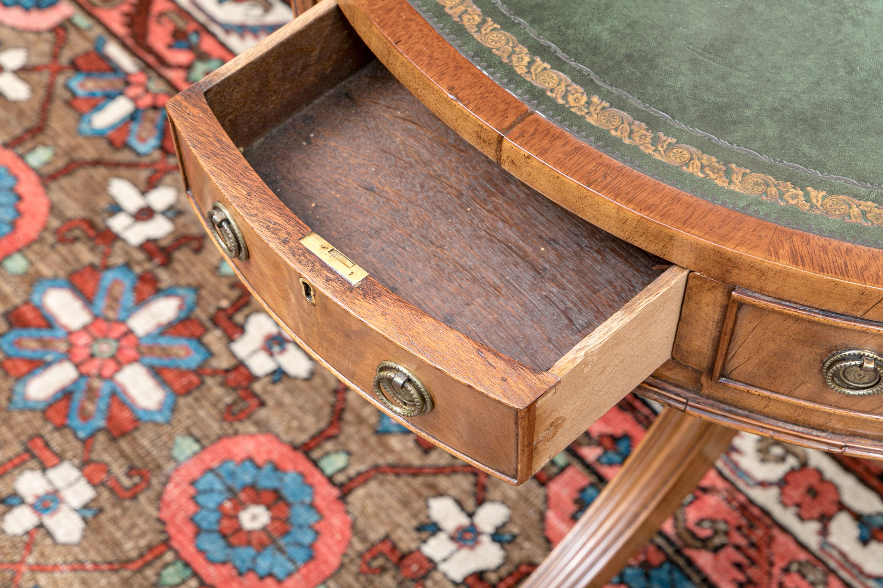 A beautifully crafted traditional Georgian Gilt-Embossed Green Leather Drum Table. With very fine Dove-Tailed drawers (Four are real and four are faux) and having delicate Brass Ring Pulls and inset brass Key Escutcheons. The wood is handsome and the drawer front panels utilize very decorative Flame Mahogany. The table top has Gilt-Embossed leather and the color contrasts beautifully with the Mahogany framing. The Pedestal base is comprised of a Classic turned Urn Form Support surmounting three gracefully carved legs terminating in powerful Lion’s Paw feet and riding on Brass Castors. The attention to detail, chosen woods, fine form and great condition all contribute to a most desirable piece of Georgian history.