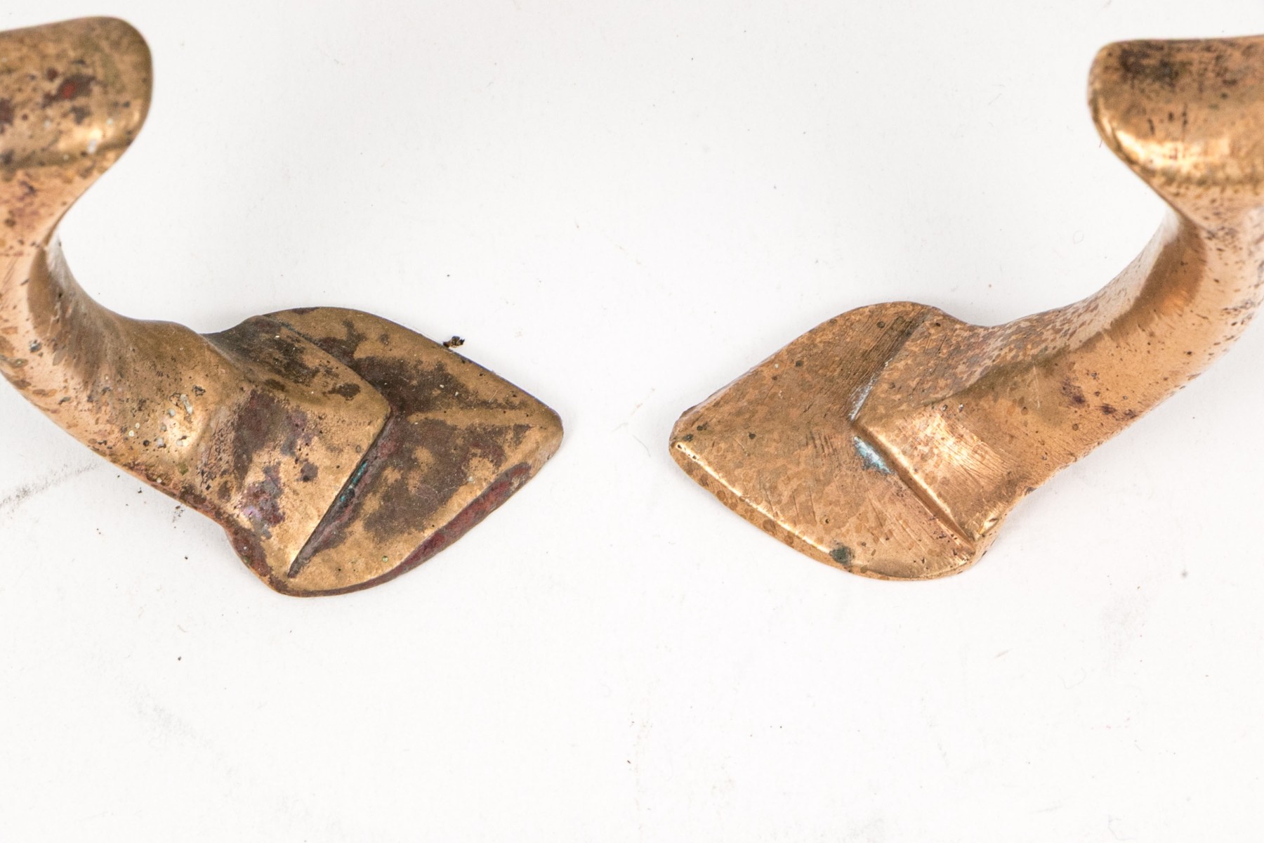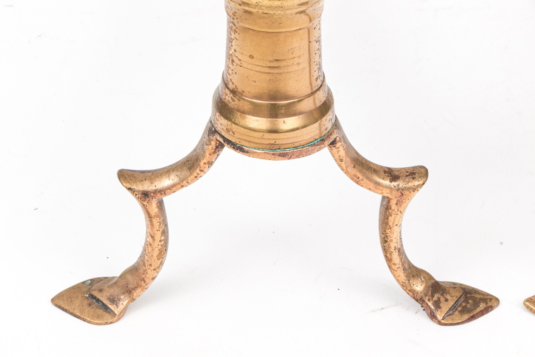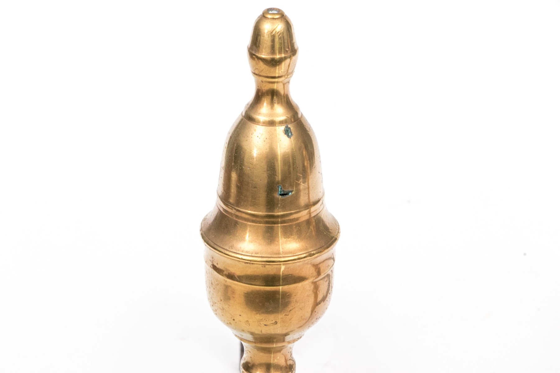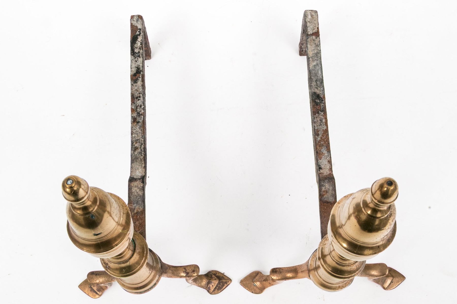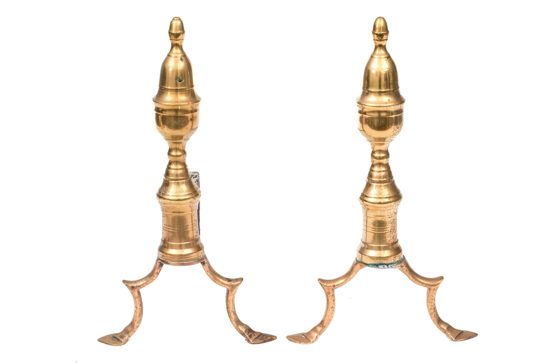An elegant pair of brass fireplace andirons showcasing oblong bell and urn form finials on cylindrical columns raised on bracketed legs with hoof-like feet.
