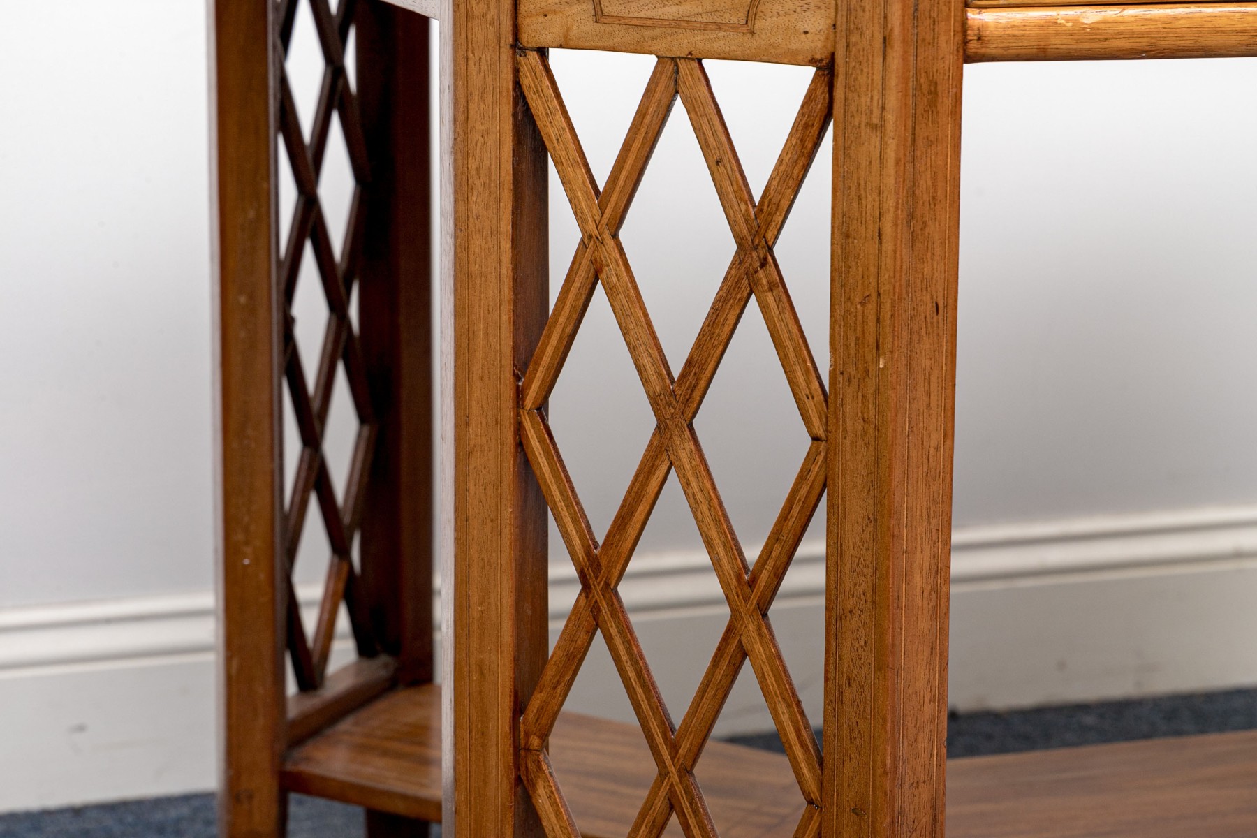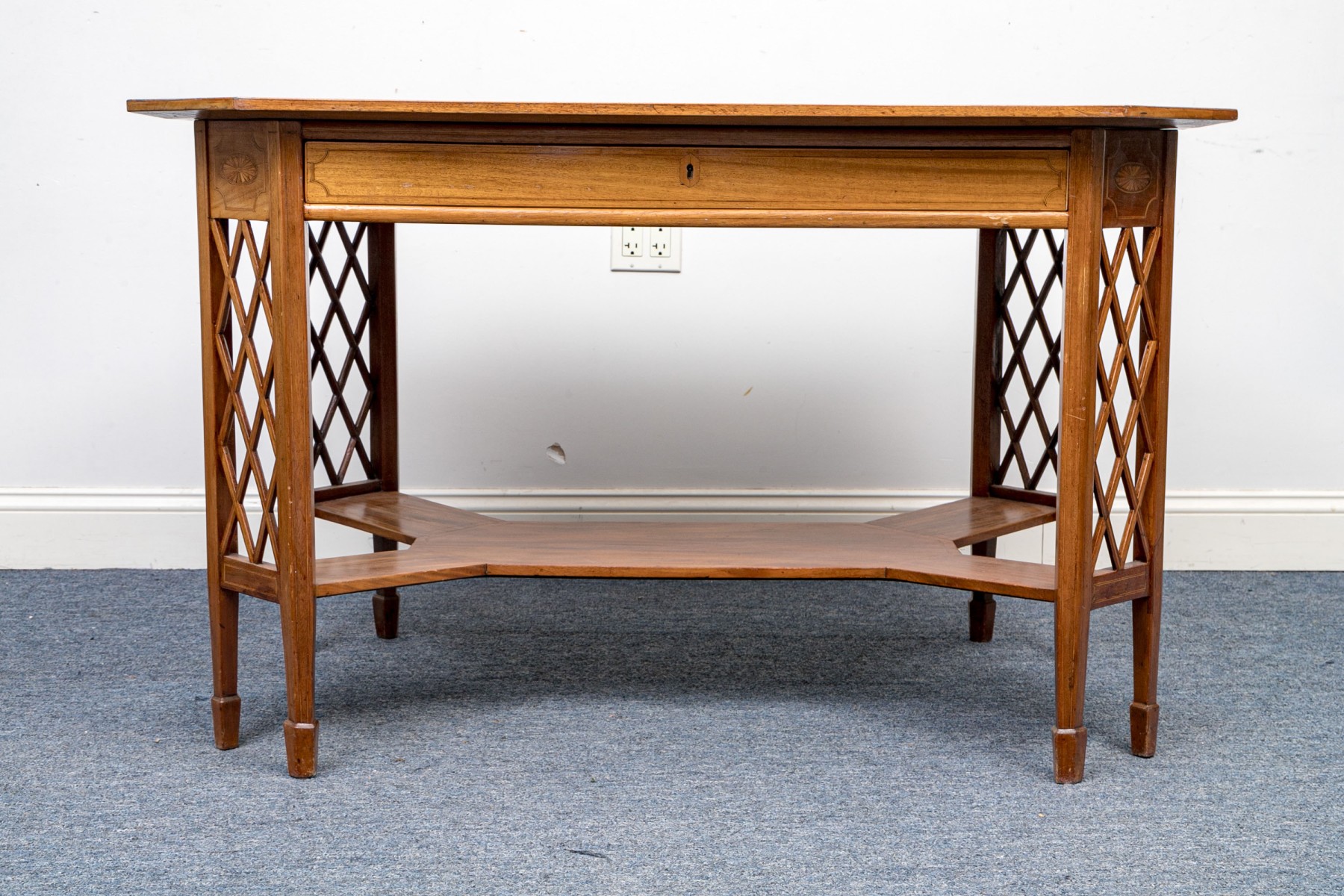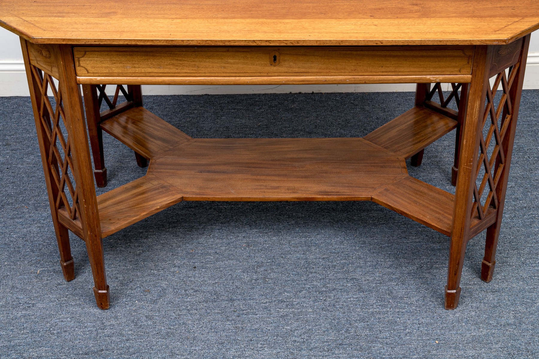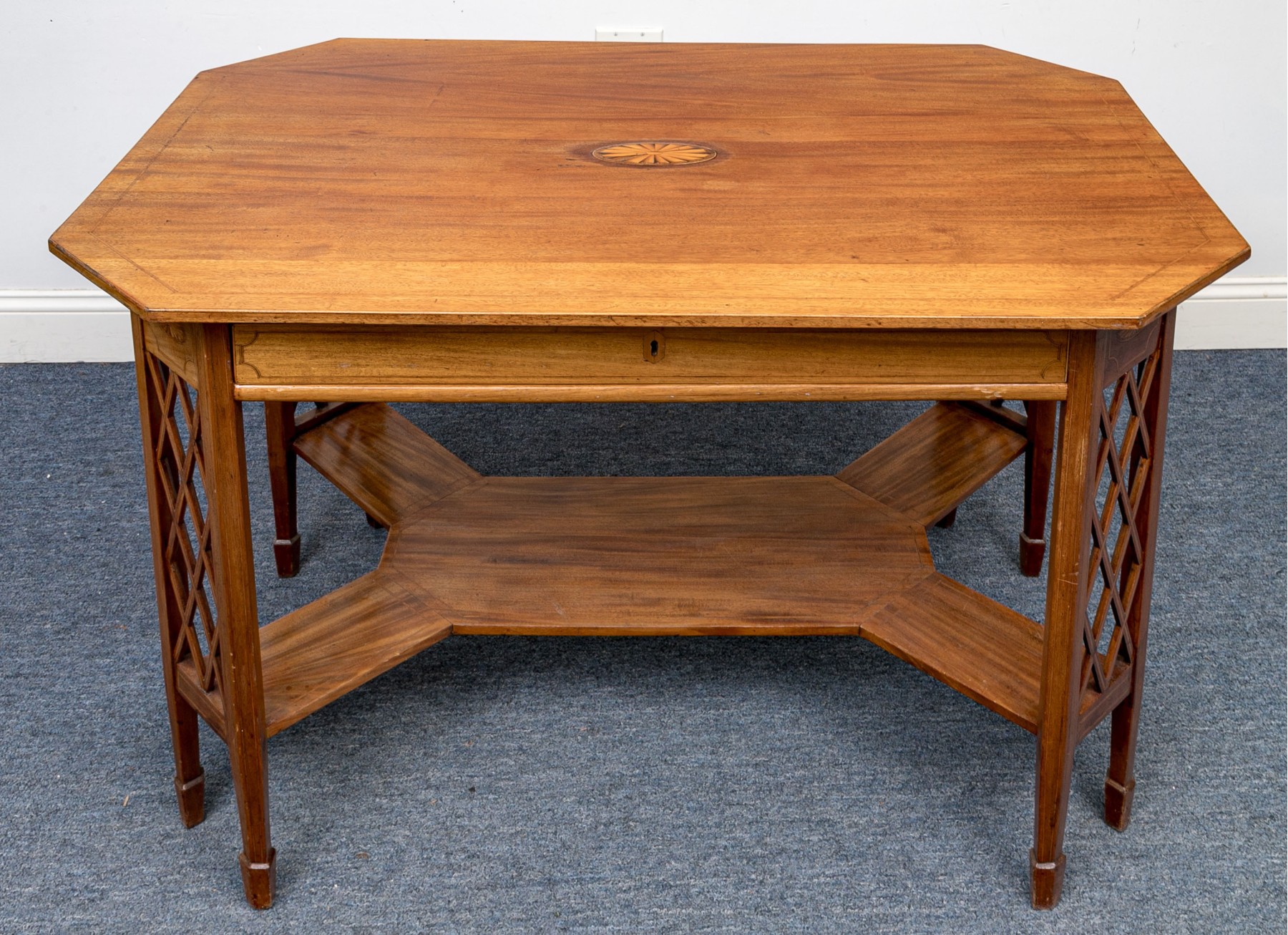 On four end supports with lattice work motif and a trestle support with an octagonal form table top. Central oval inlaid reserve. One drawer.
