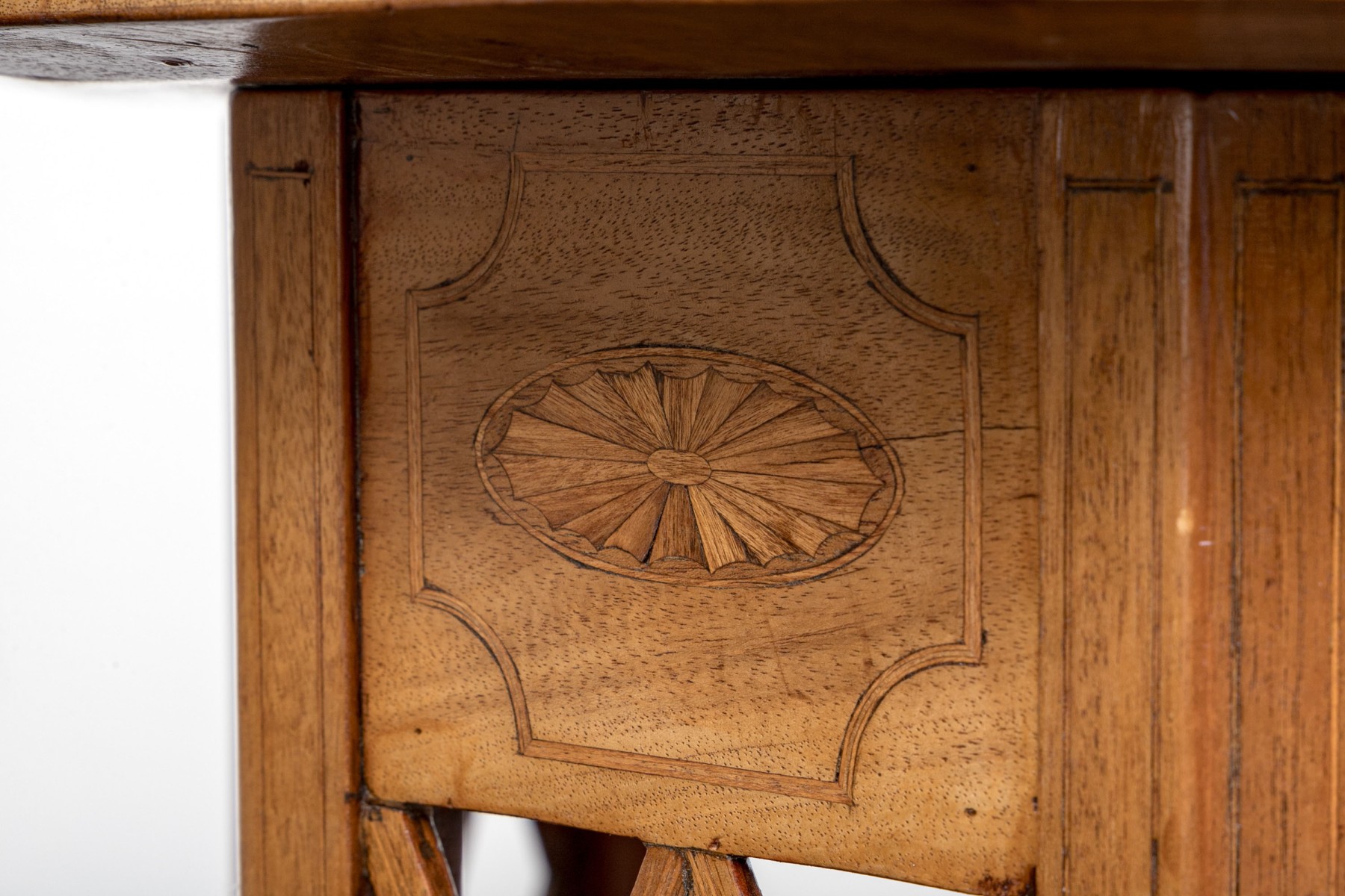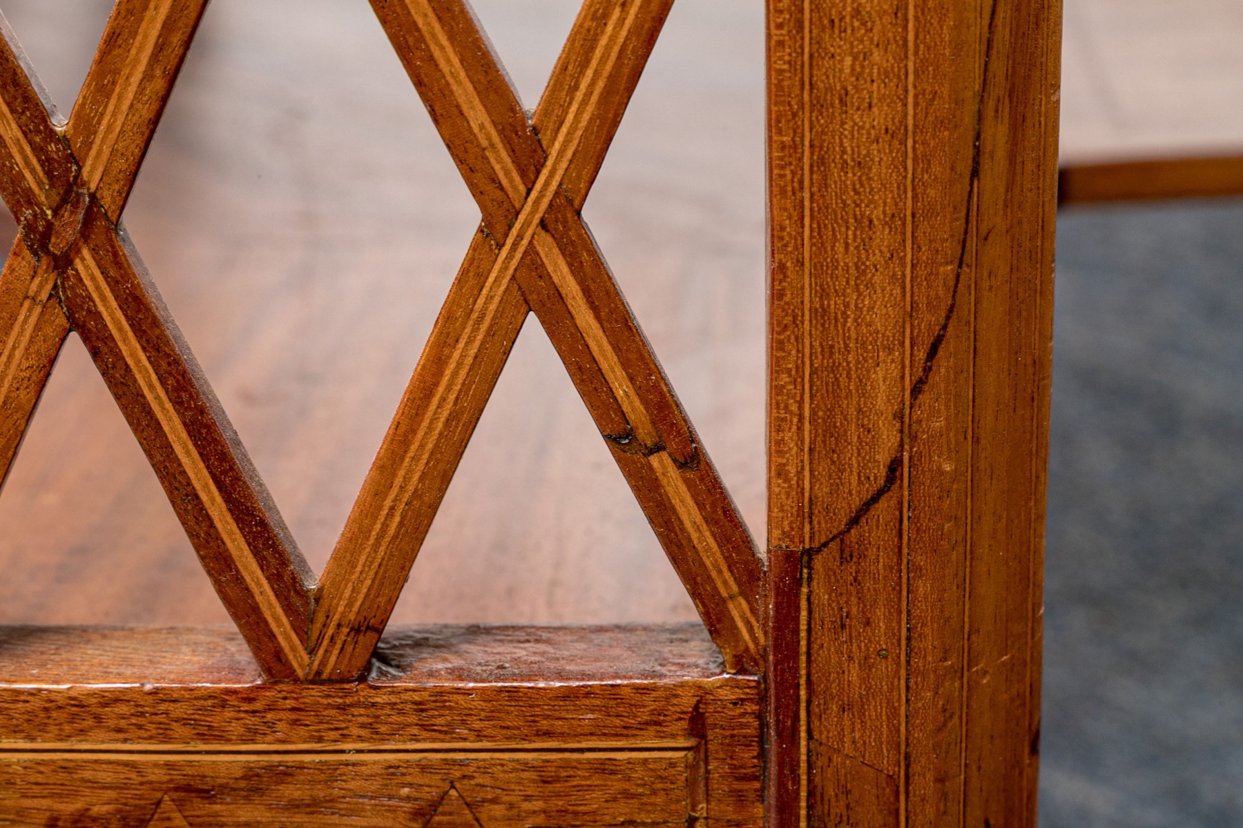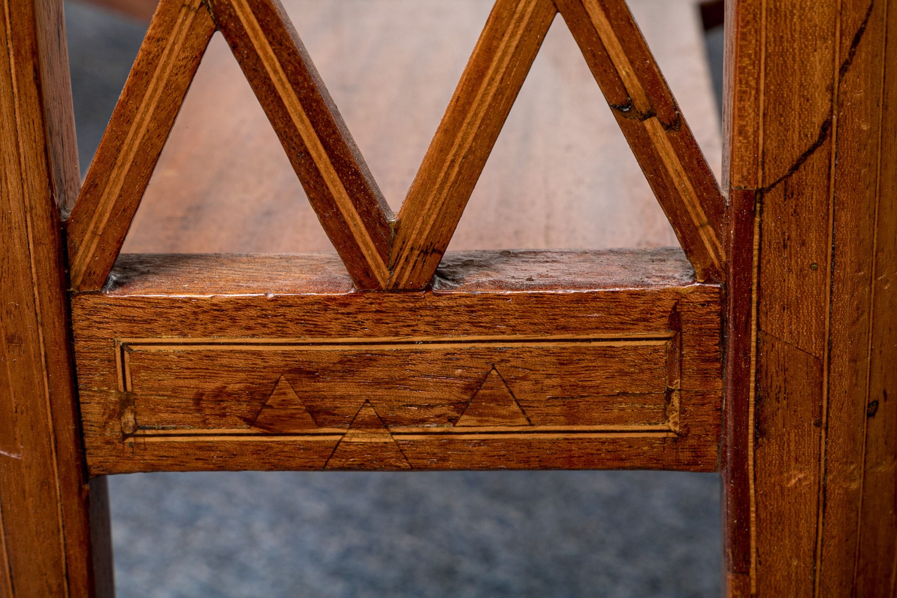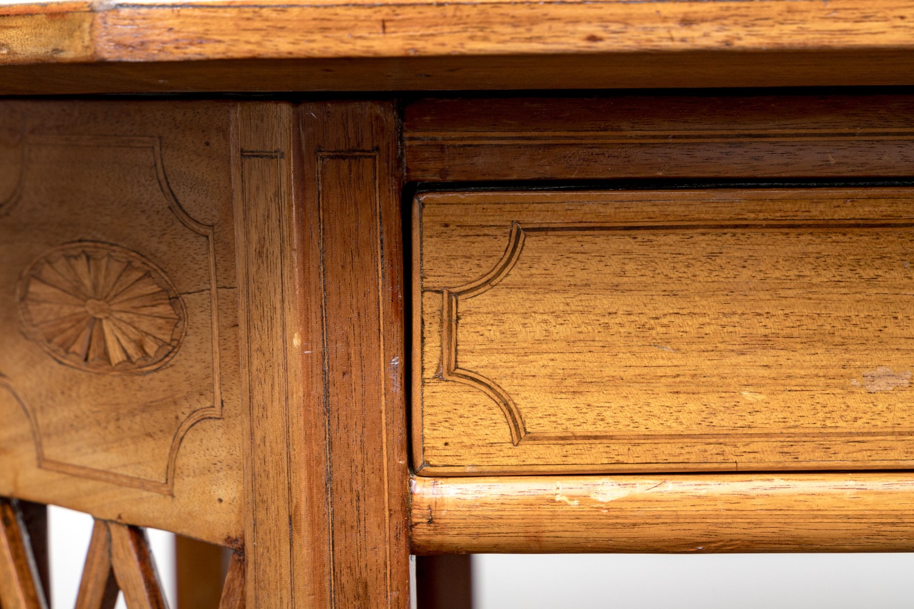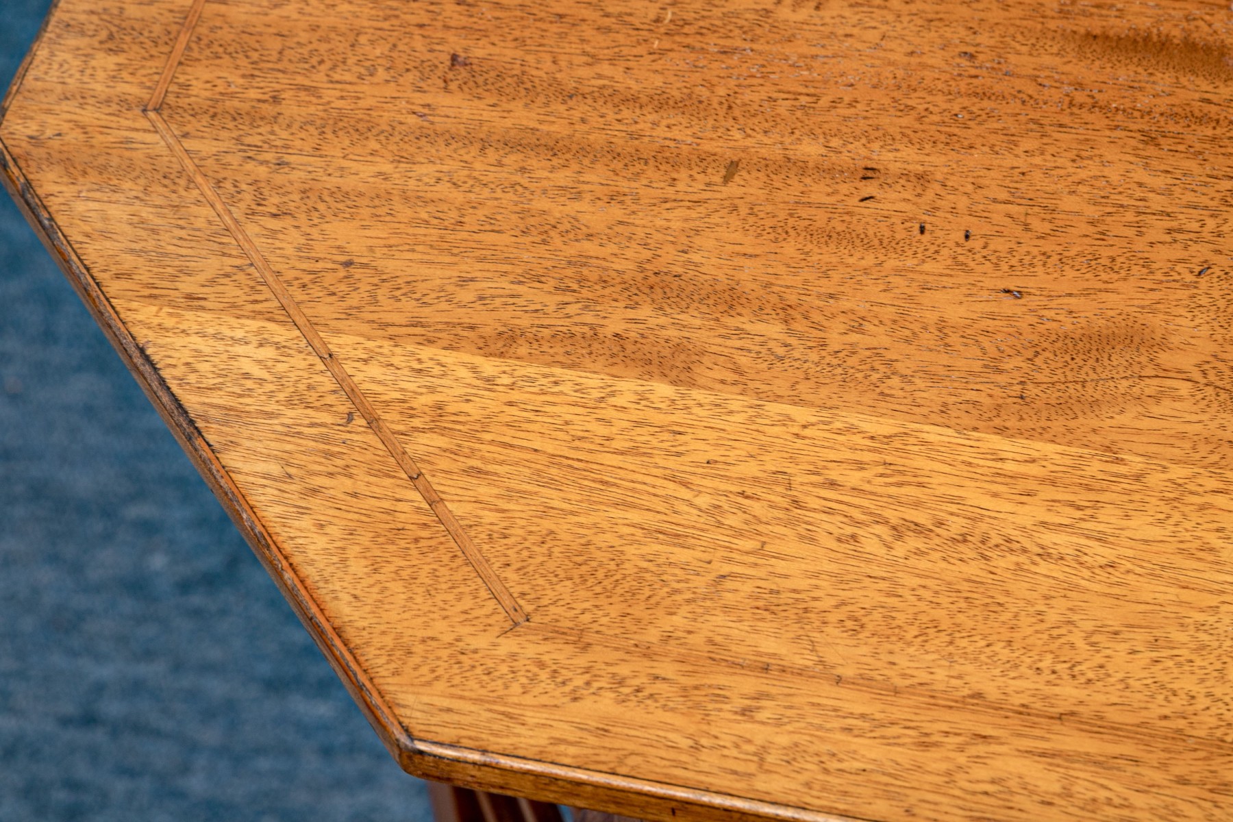 On four end supports with lattice work motif and a trestle support with an octagonal form table top. Central oval inlaid reserve. One drawer.