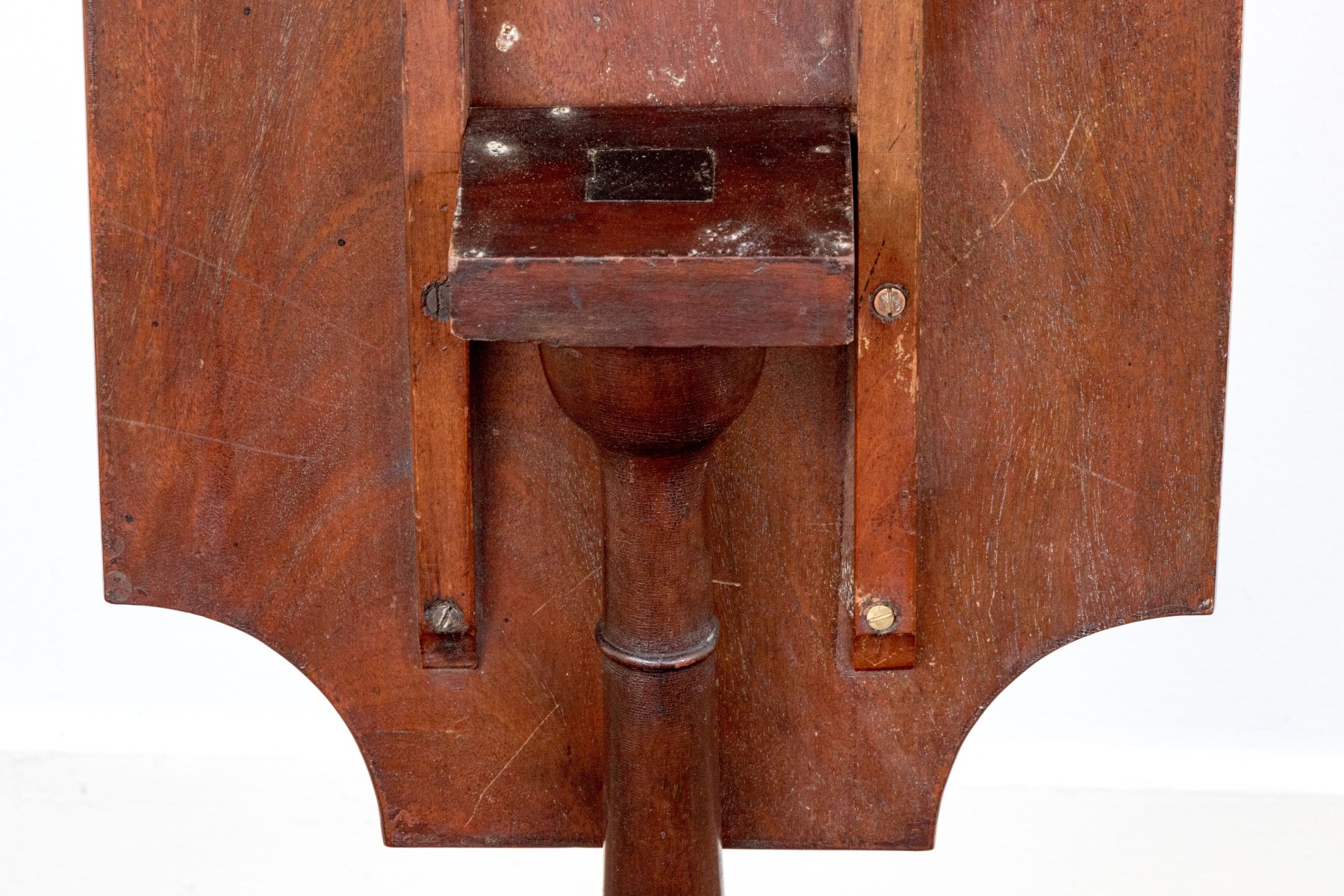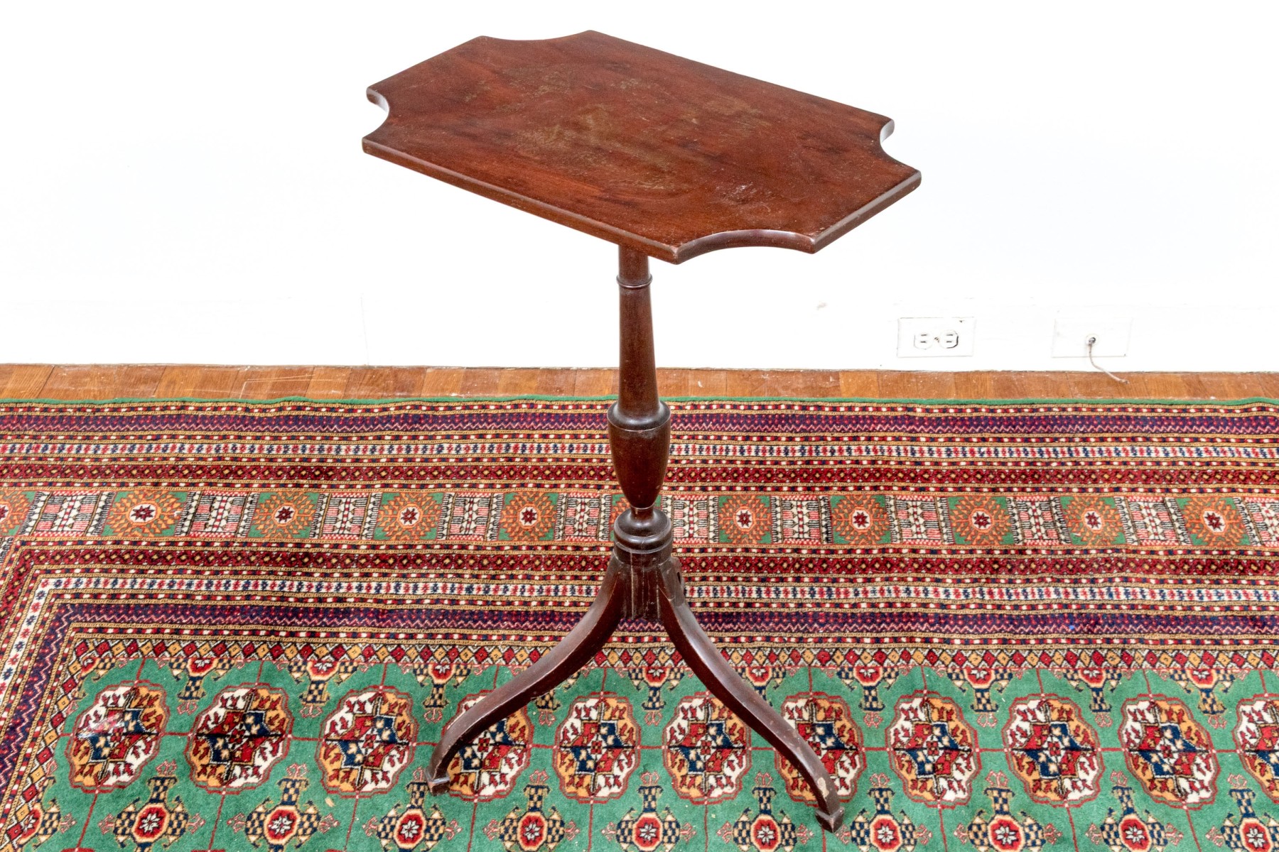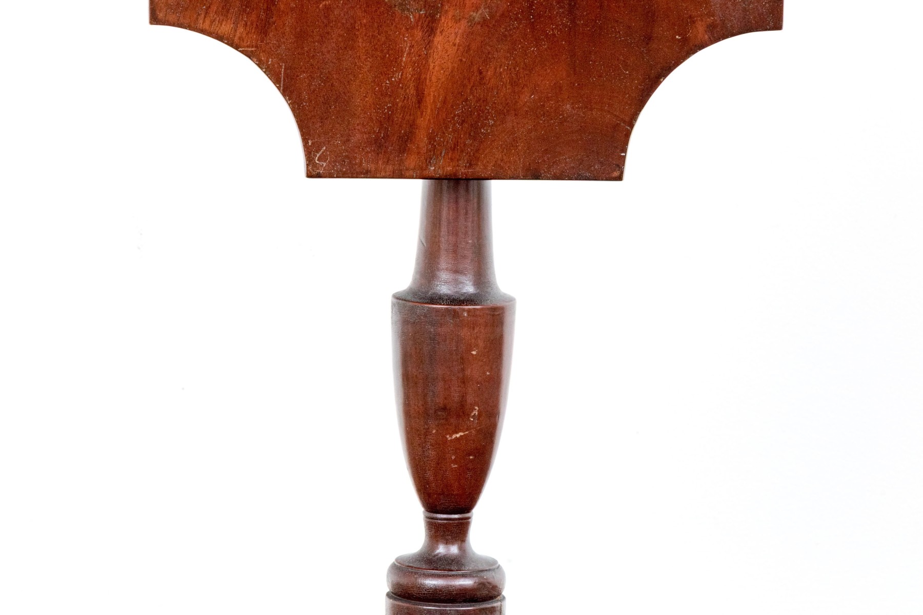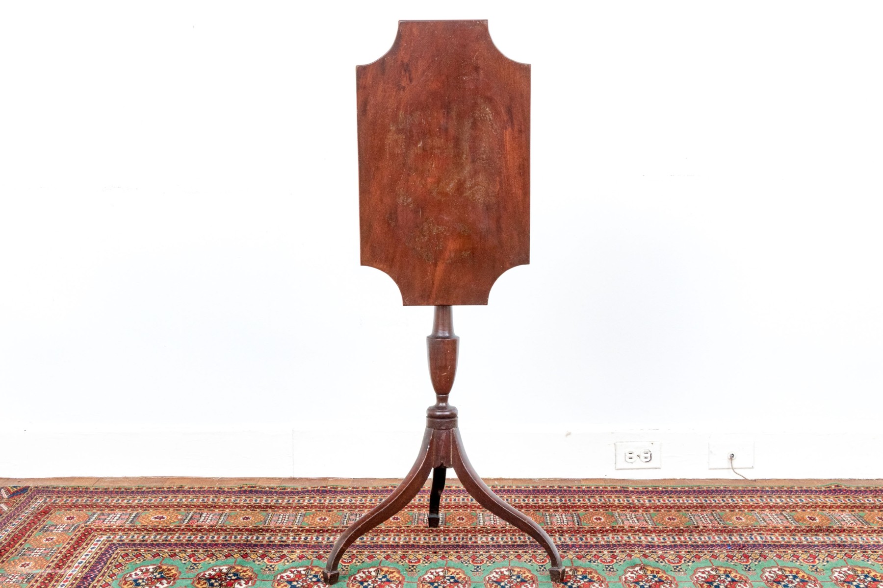 A fine antique tilt top Federal candle stand. Sporting a rectangular top with dramatically concave curved corners. The table is supported by a pedestal with an urn knop over a tripod of curving legs on spade feet.