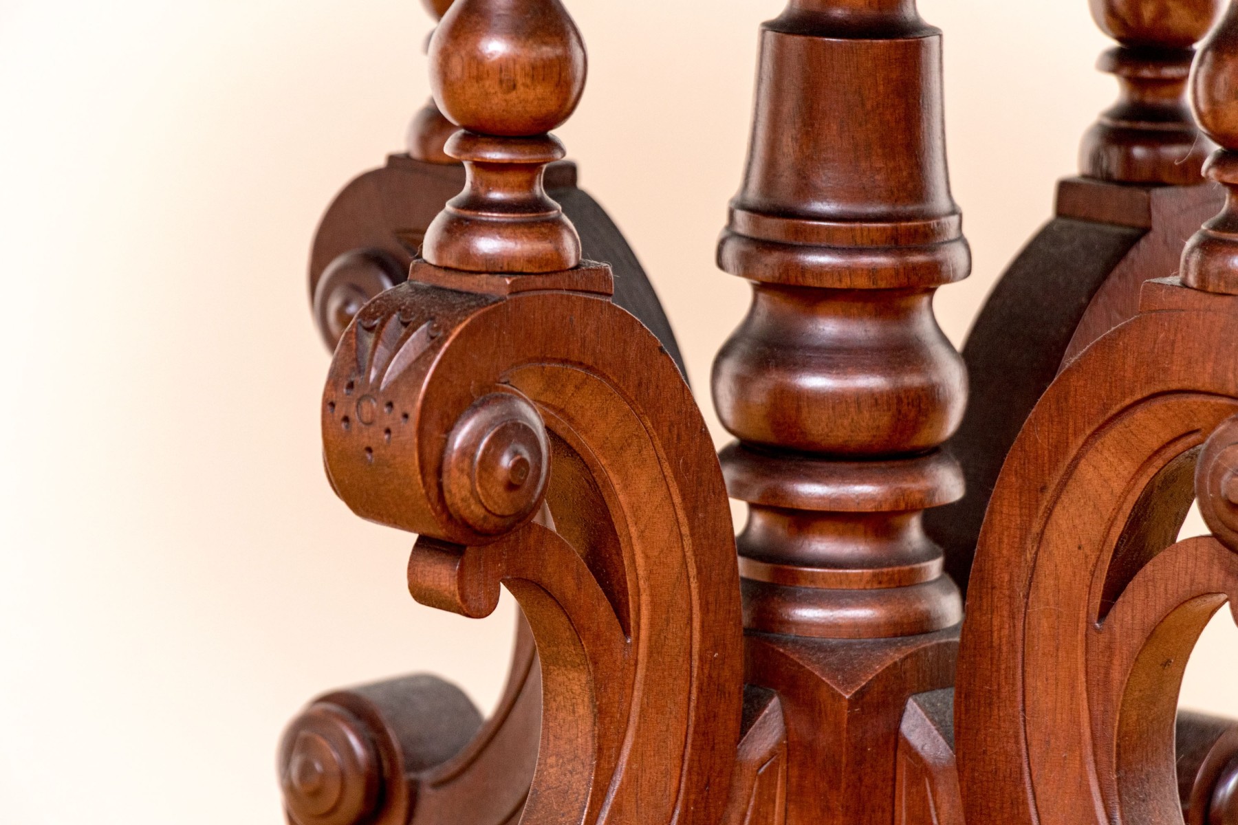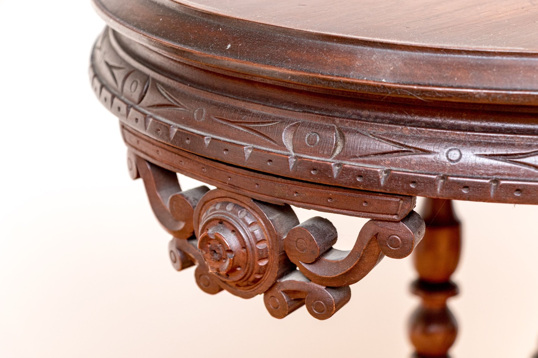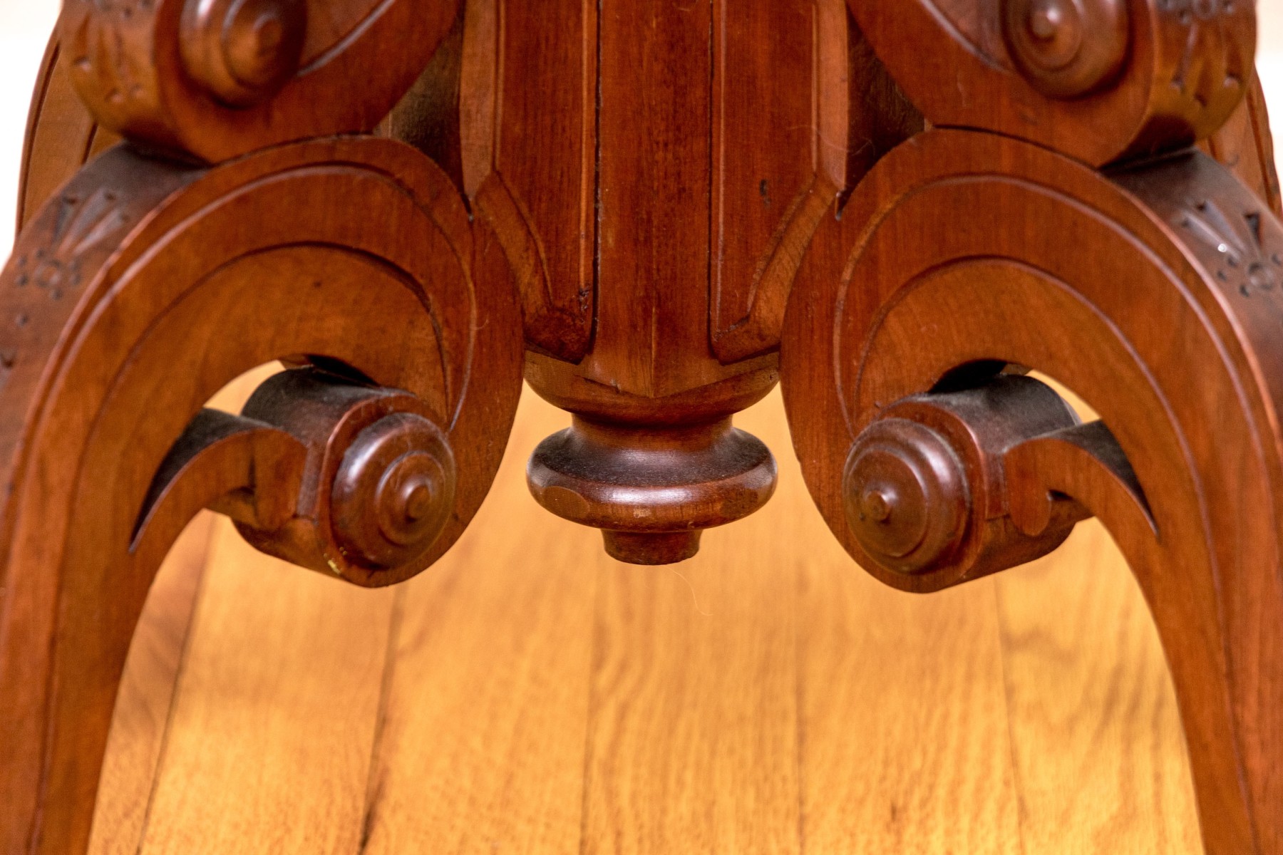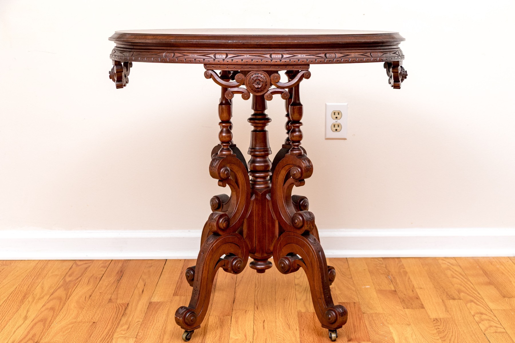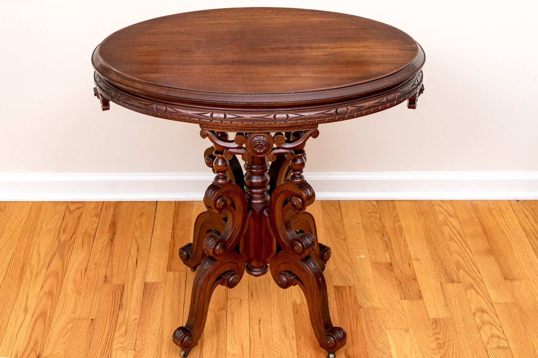 A delightful Victorian parlor table circa 1860-1880 well crafted in warm-toned medium brown walnut wood. The table sports an oval beveled top with an elegantly carved apron detailed with concentrically patterned rosettes flanked by scrolled flourishes. The table is supported by a center column surrounded by four urn or baluster supports atop scrolled arms leading to cabriole legs on scrolled feet. Raised over casters for easy mobility.