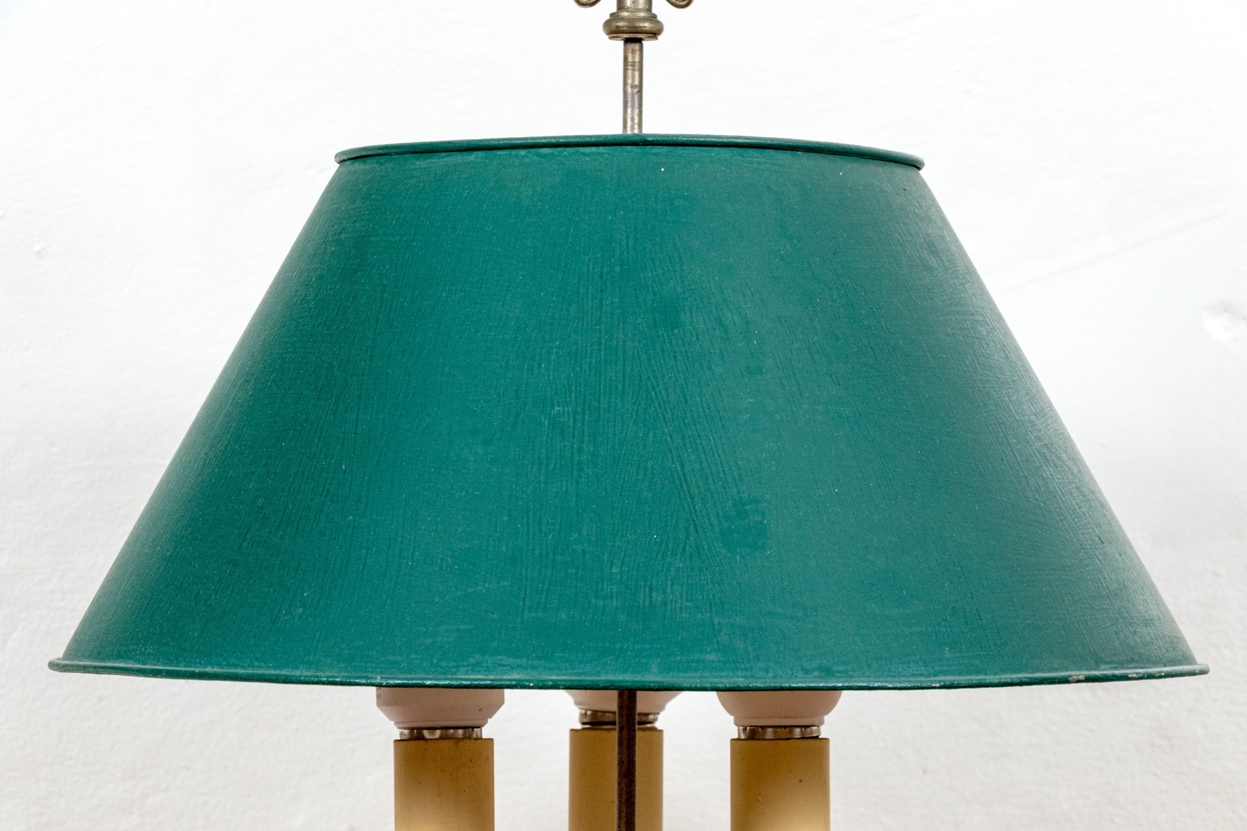 Each with tole adjustable shades with circular bases and urn forms with three scrolled arms with faux candles sleeves with three bulbs.