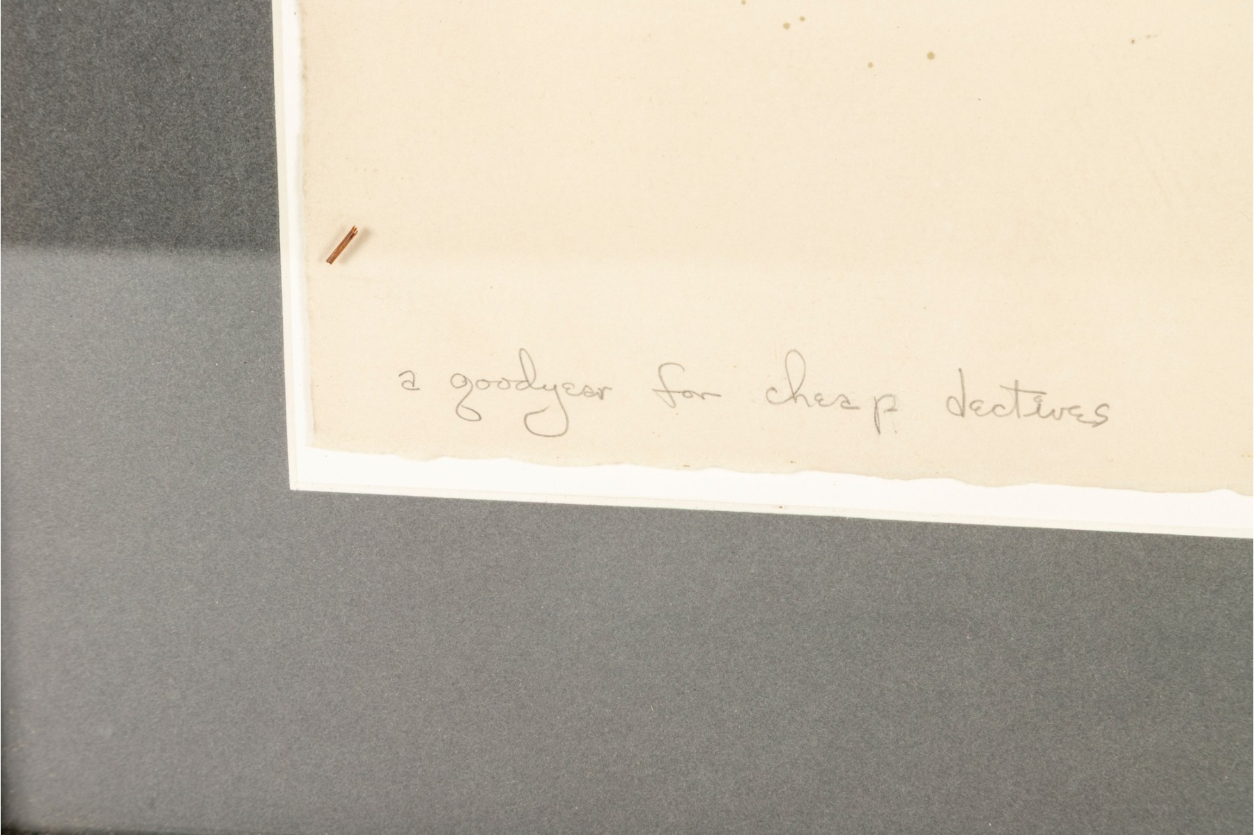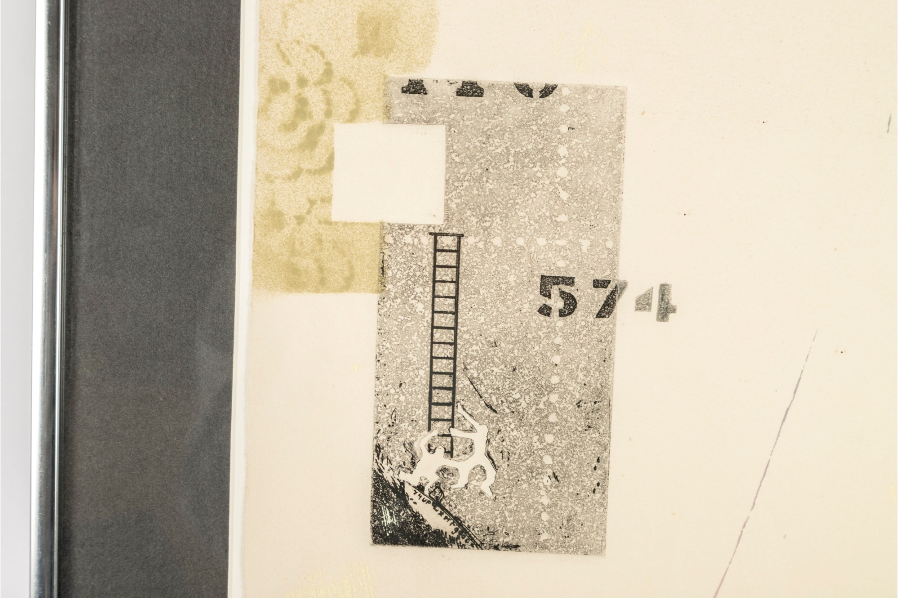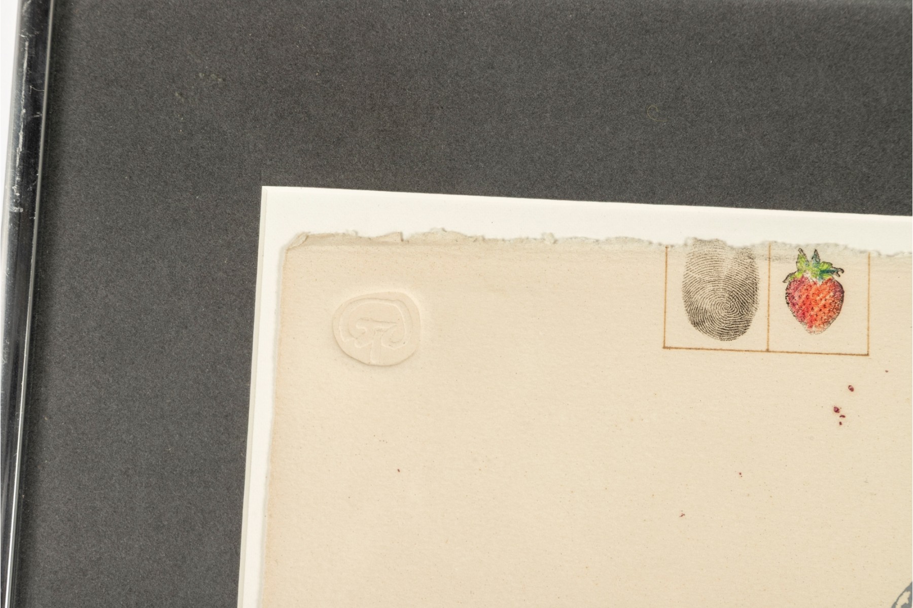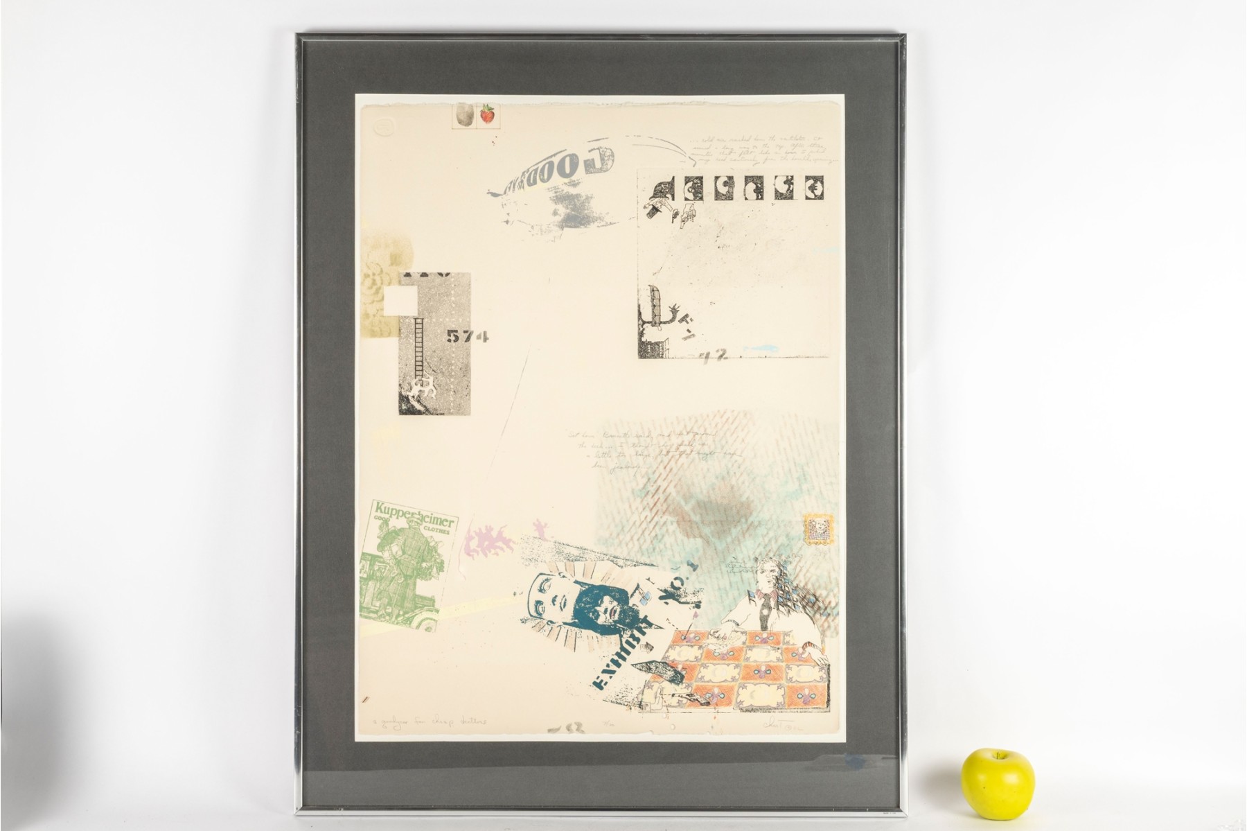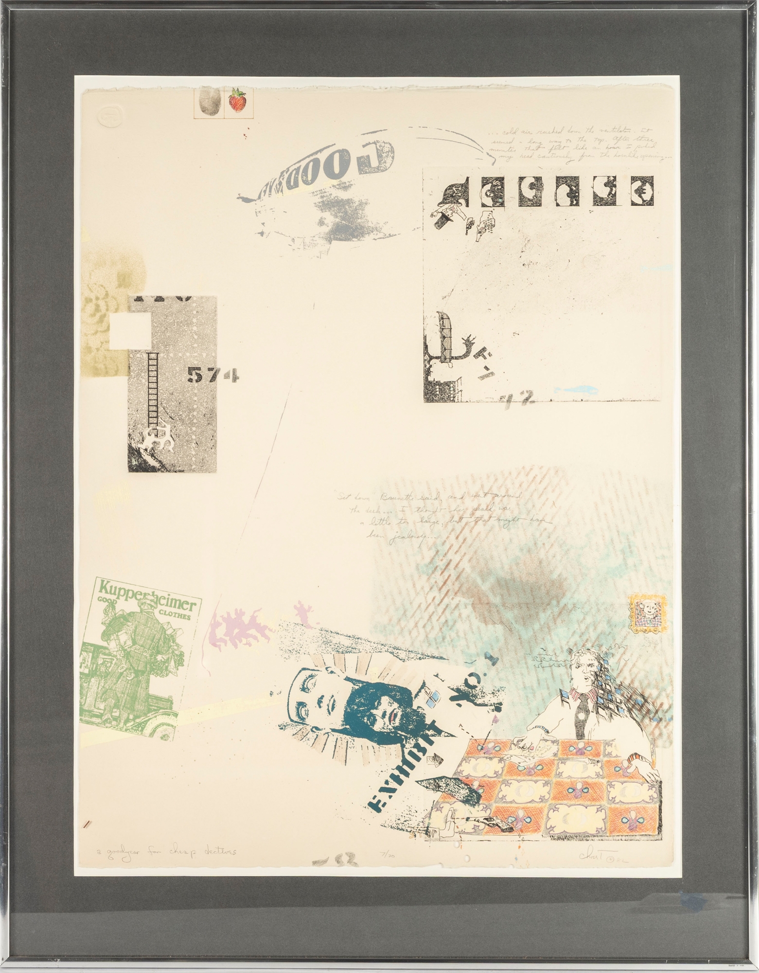 This piece is a mixed media print titled “A Goodyear for Cheap Detectives”, signed and dated 1982 by the artist in the lower right corner. The work combines screenprint, etching, and collage elements, incorporating layered imagery such as fingerprint and strawberry motifs, vintage-style graphic stamps, and hand-drawn details. Edition 7/20.