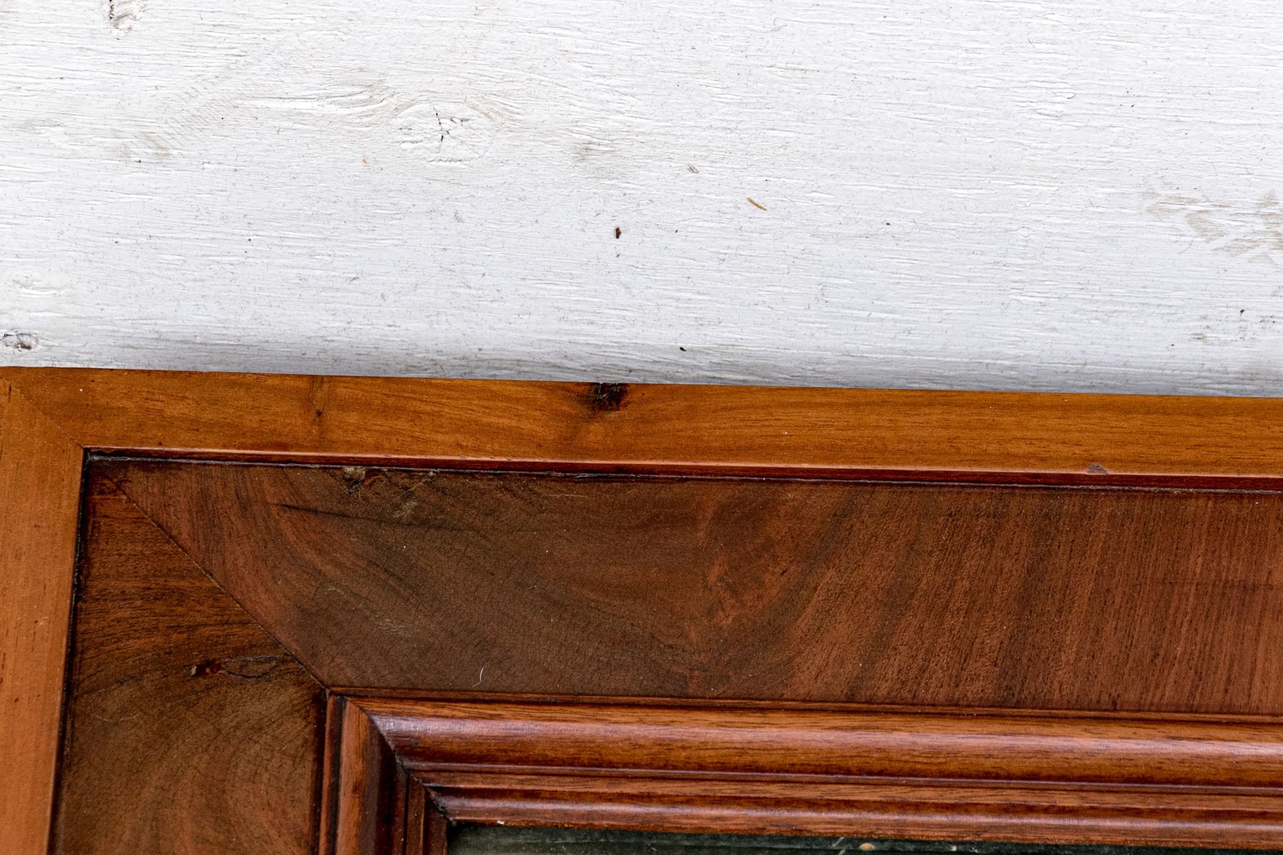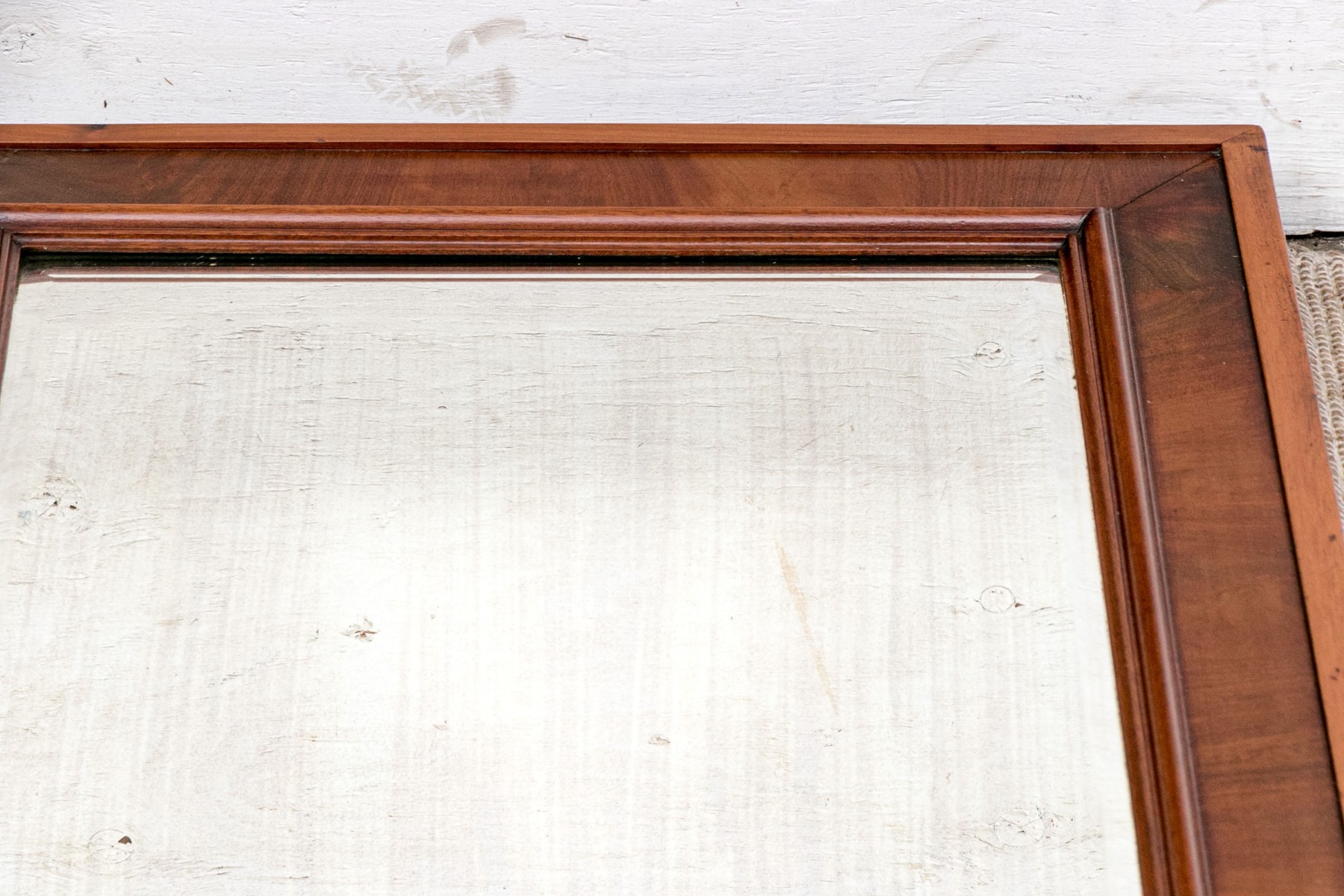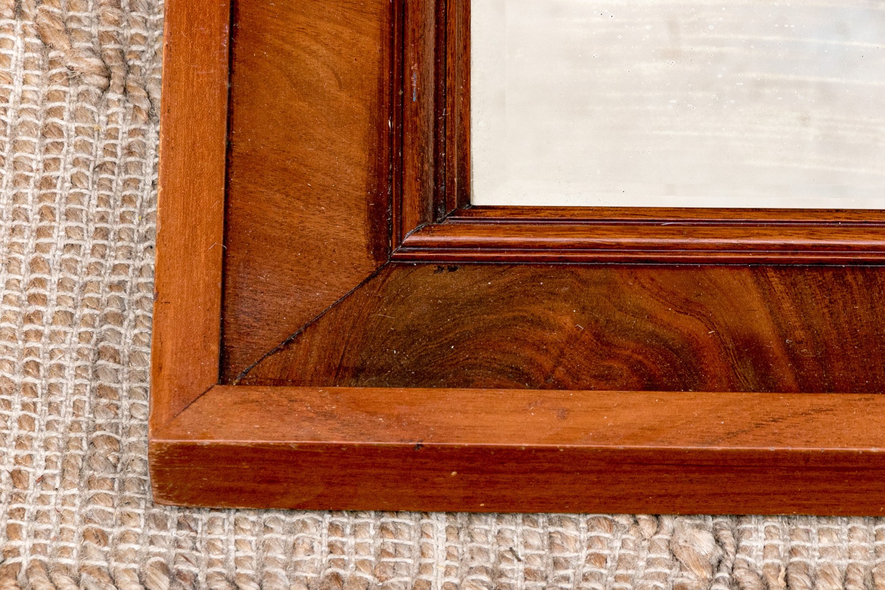 A handsomely framed antique mirror. The handsome and stout carved wooden frame with natural finish presents handsomely and contains the beveled edge mirror plate within.