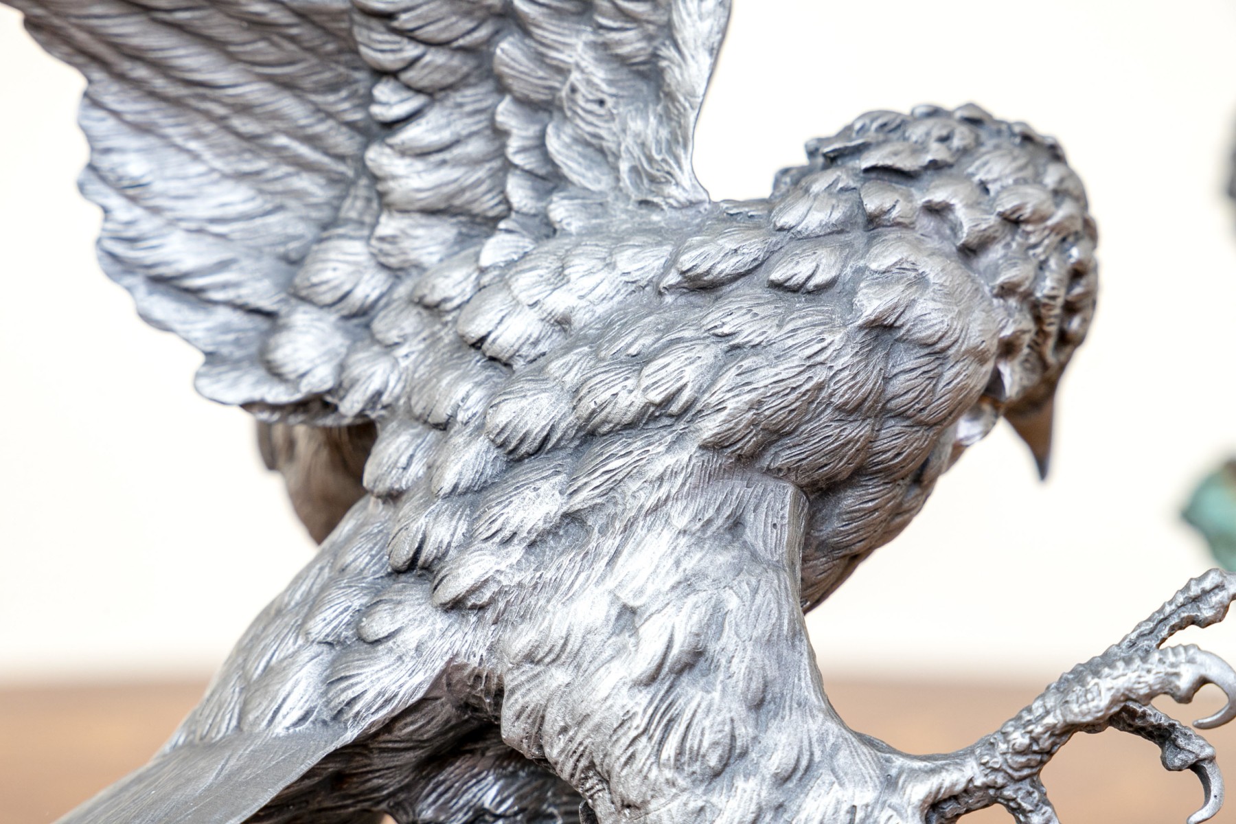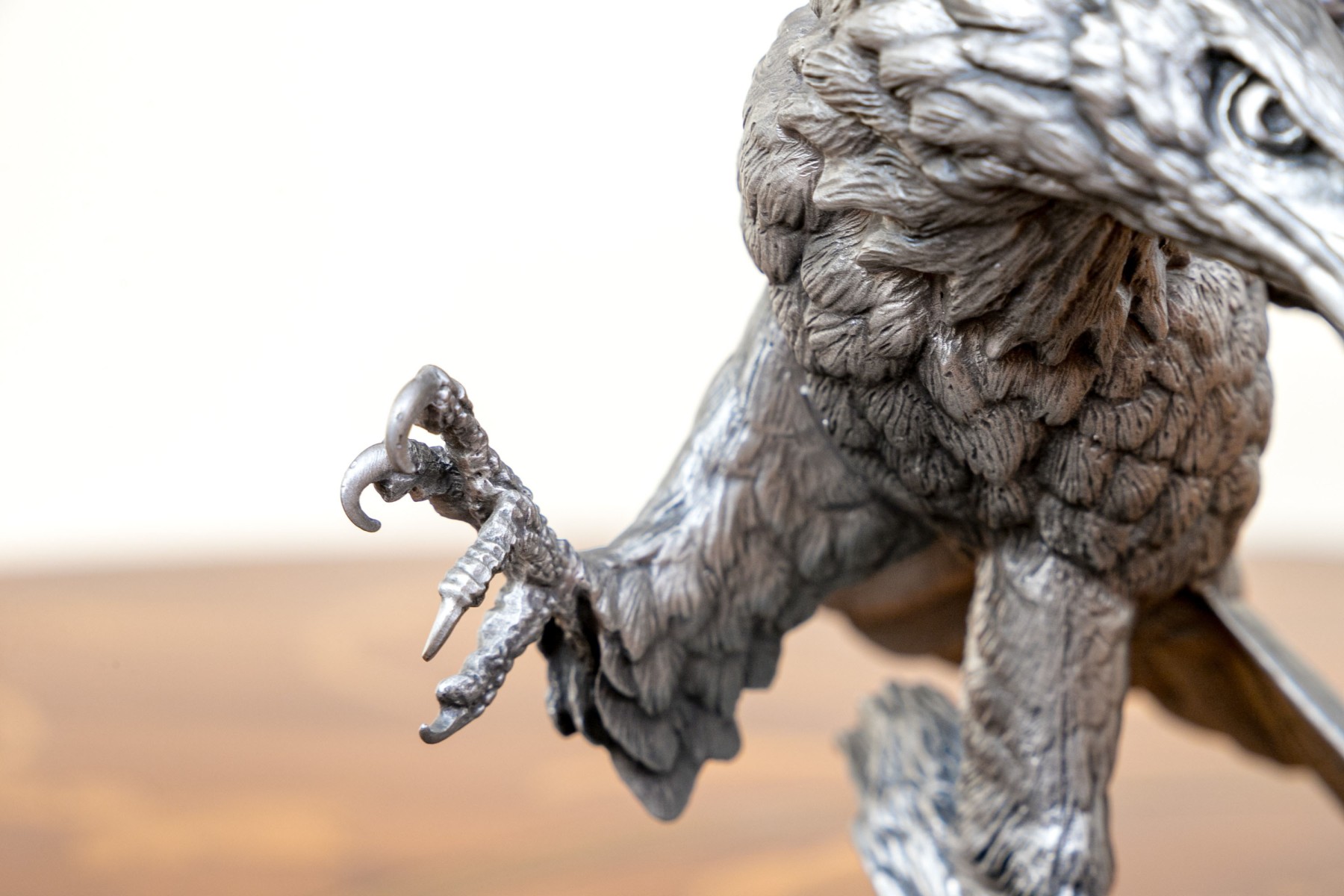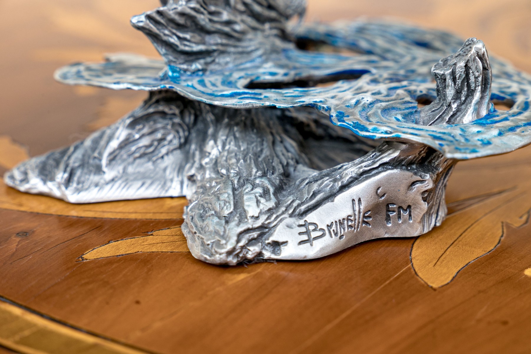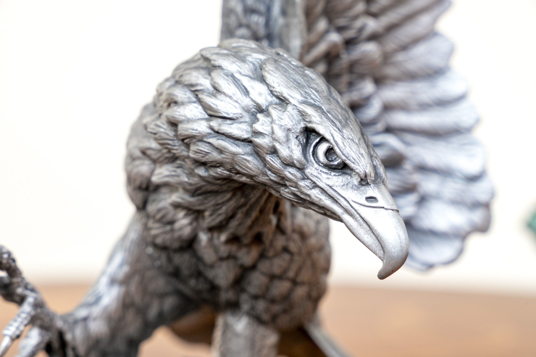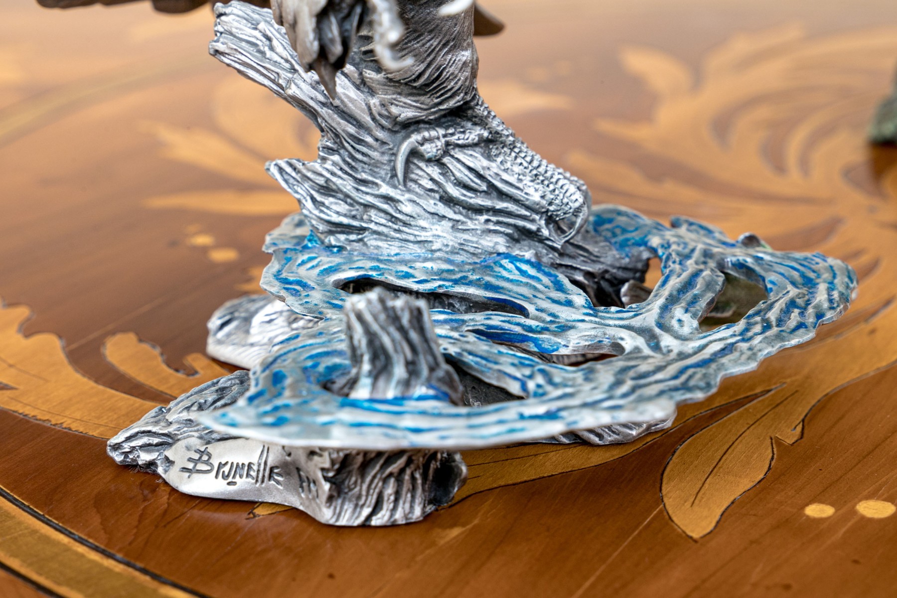 Paul Prunelle for Franklin Mint ""Sovereign of the Northern Sky" pewter sculpture depicting an Alaska Chilkat Bald Eagle in a fierce pose clutching a log over a water-themed pierced base. Cast signature near the base.