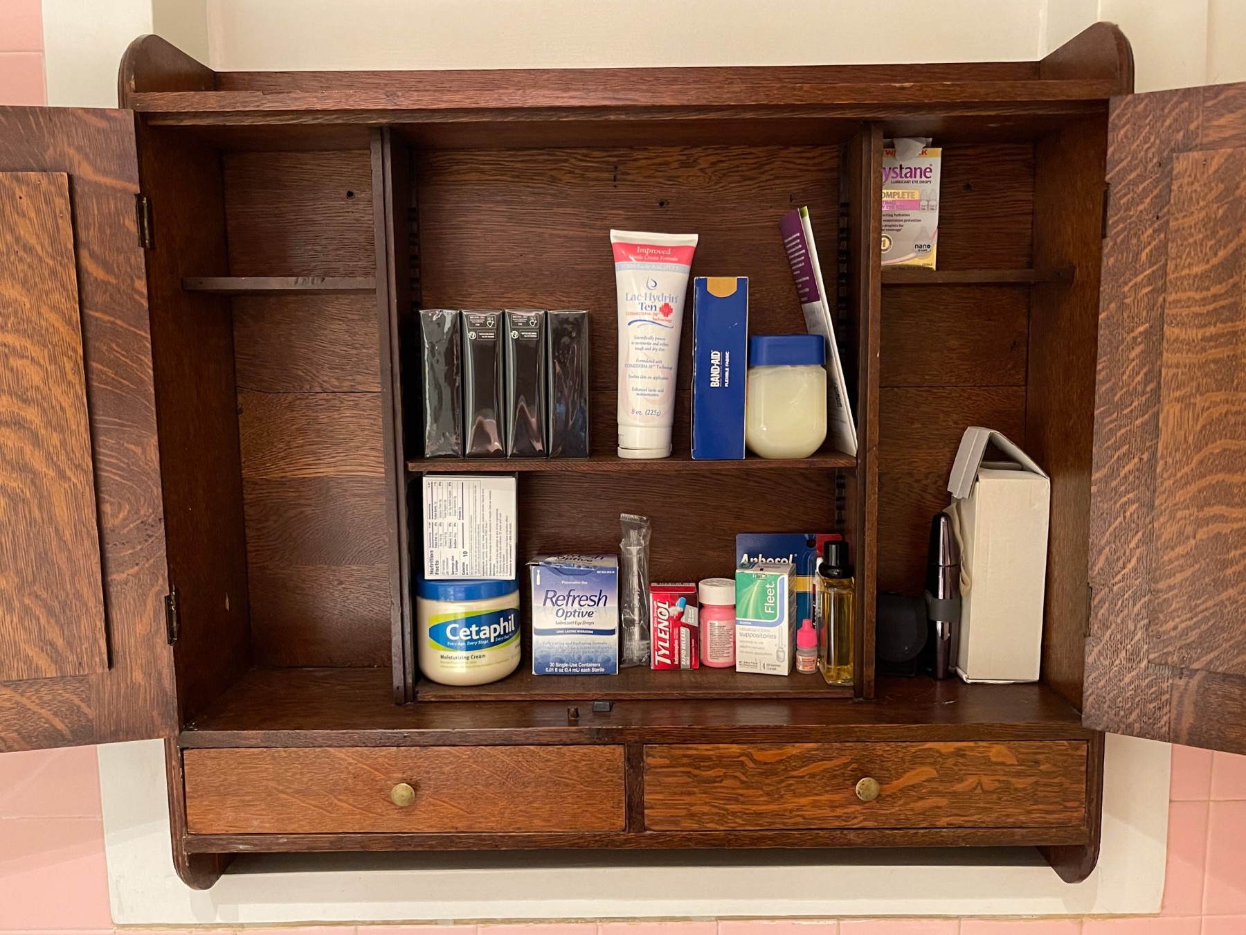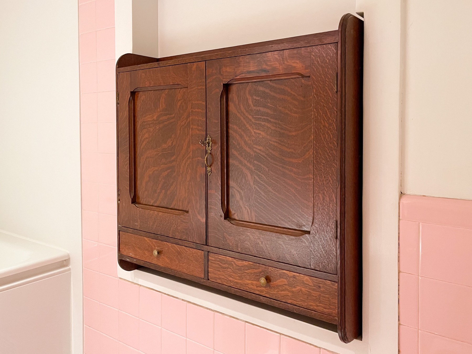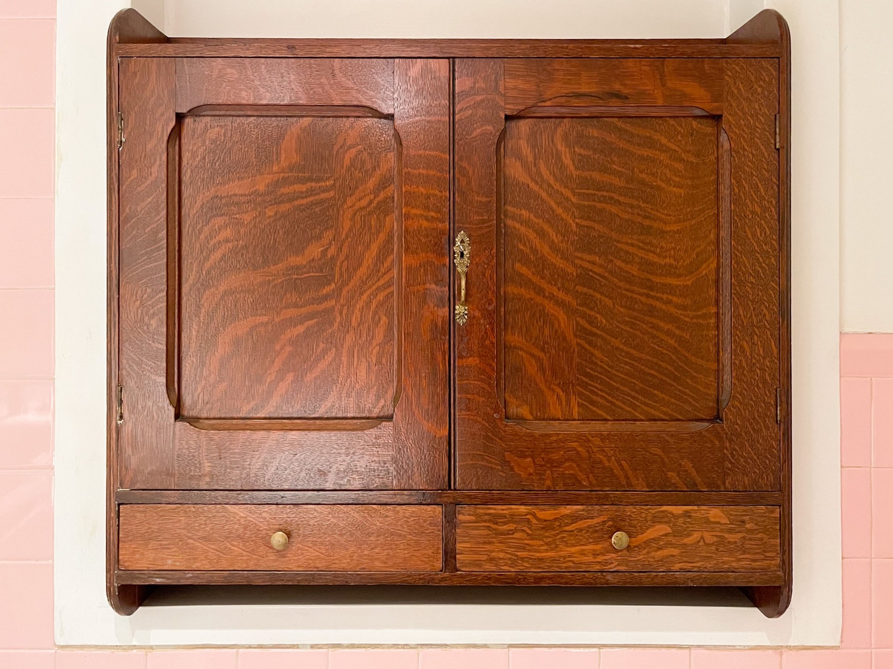 This interesting medicine cabinet has double recessed drawers over two short drawers. The top shelf is fitted with a 3/4 gallery. Perfect for storage!