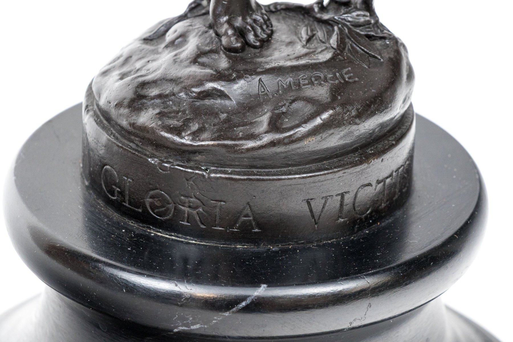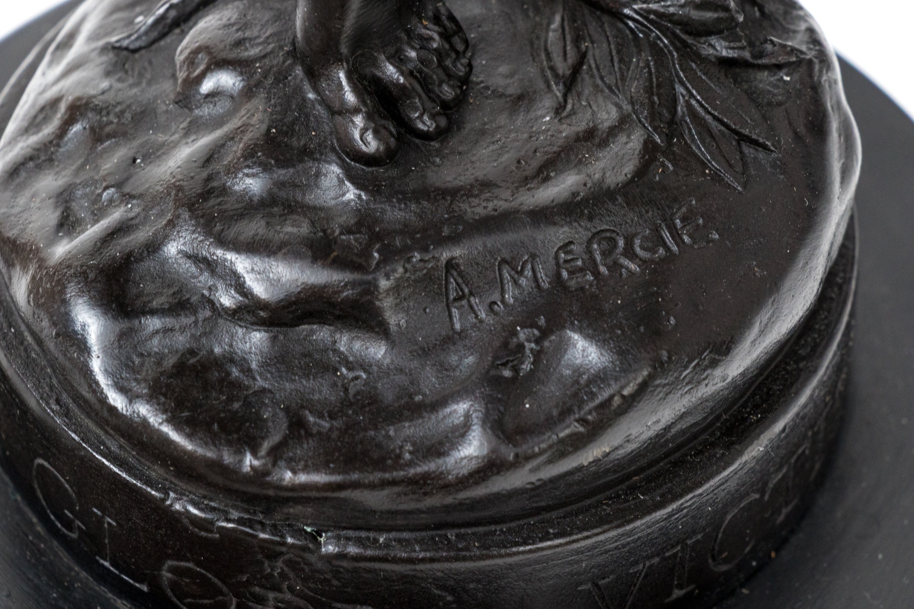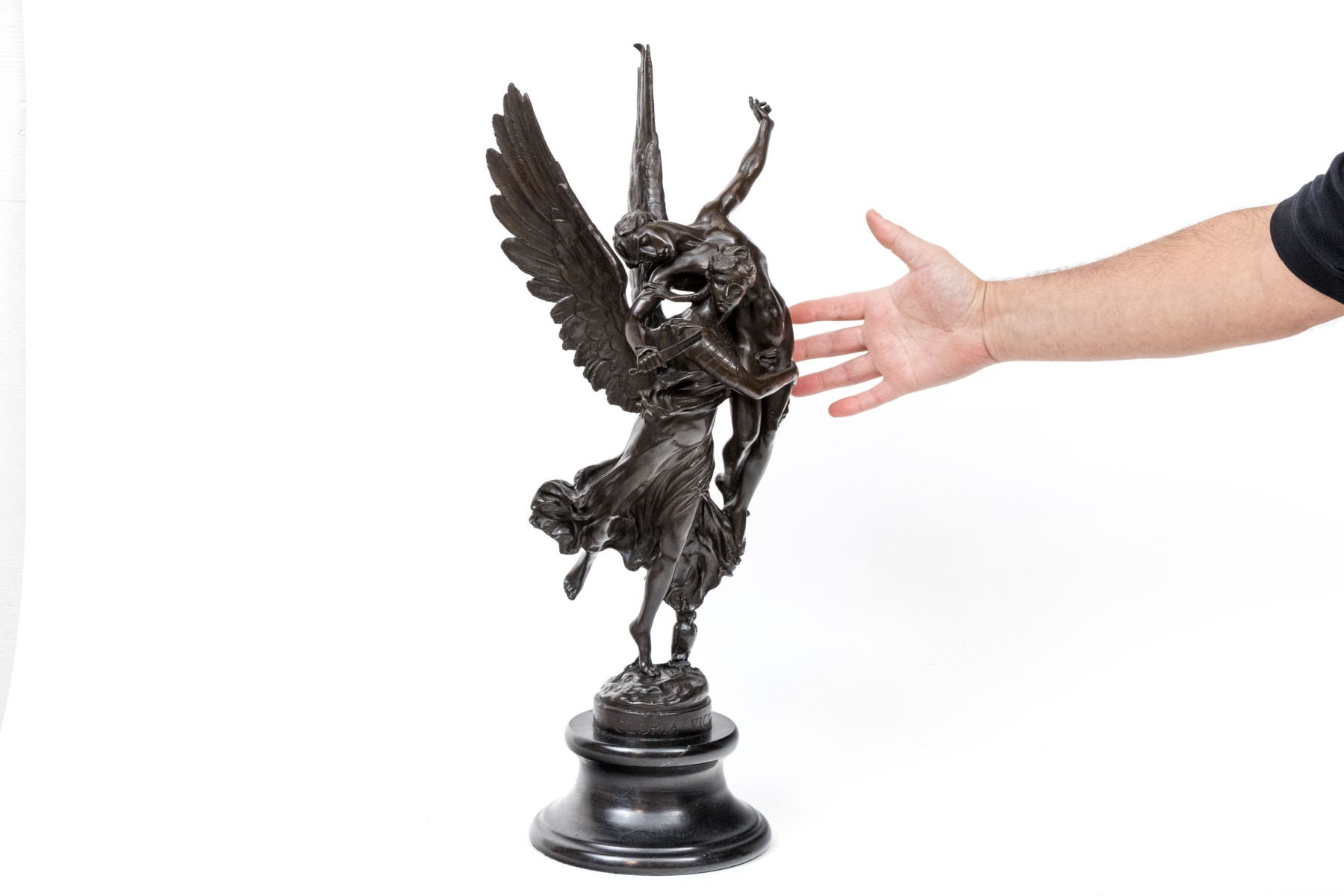 Bronze sculpture sibned to base and titled to base, affixed to a carved and stained wood plinth. The winged figure is holding a second nude figure hoding a broken sword in their hand.