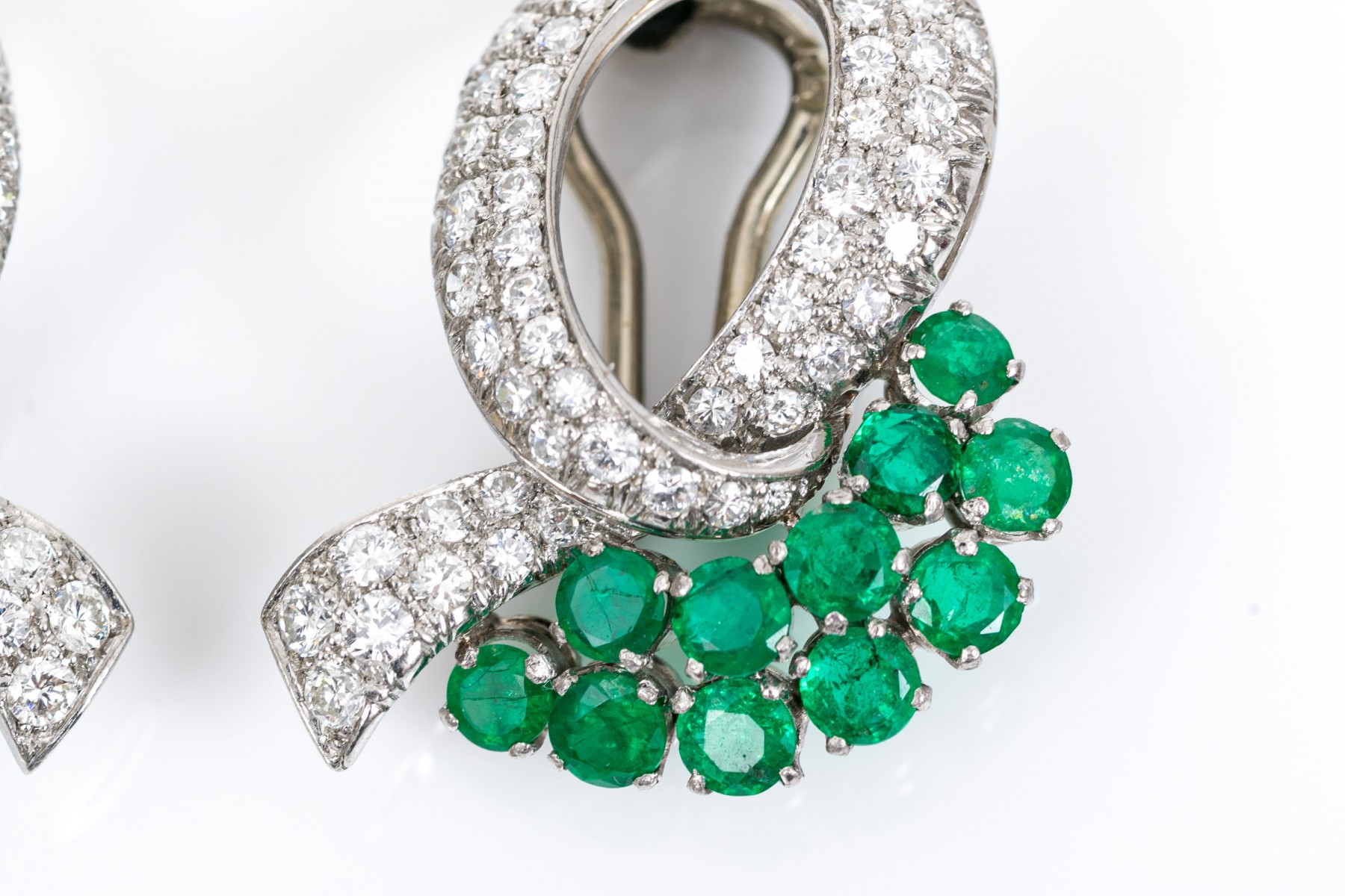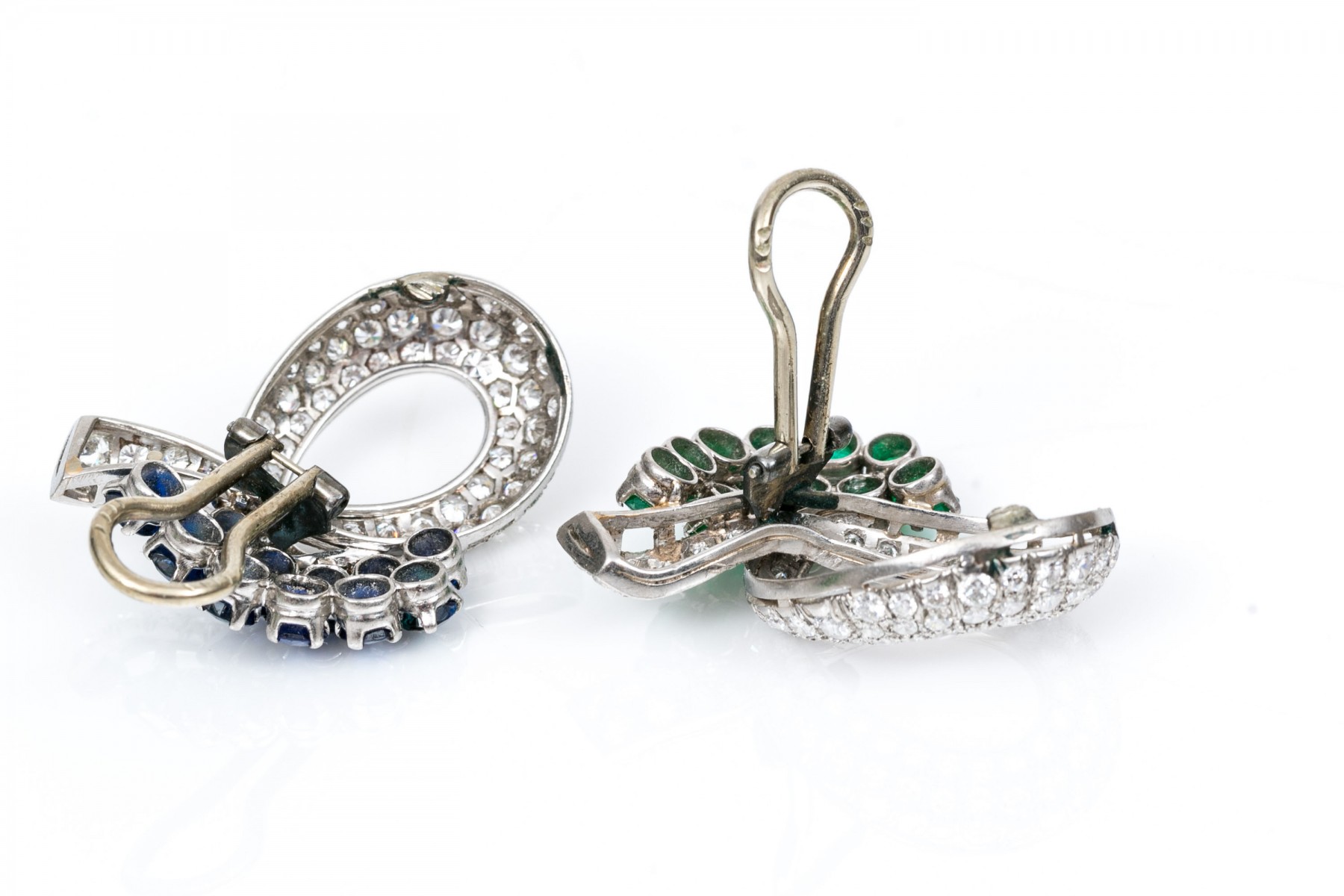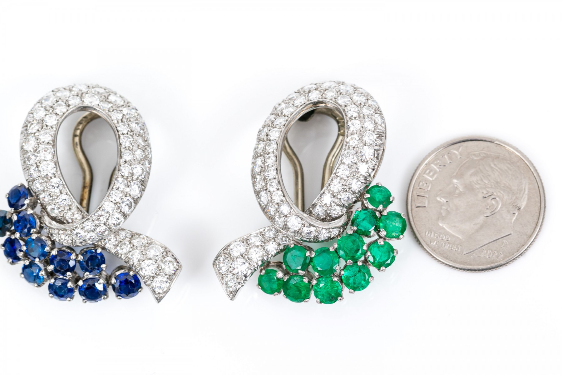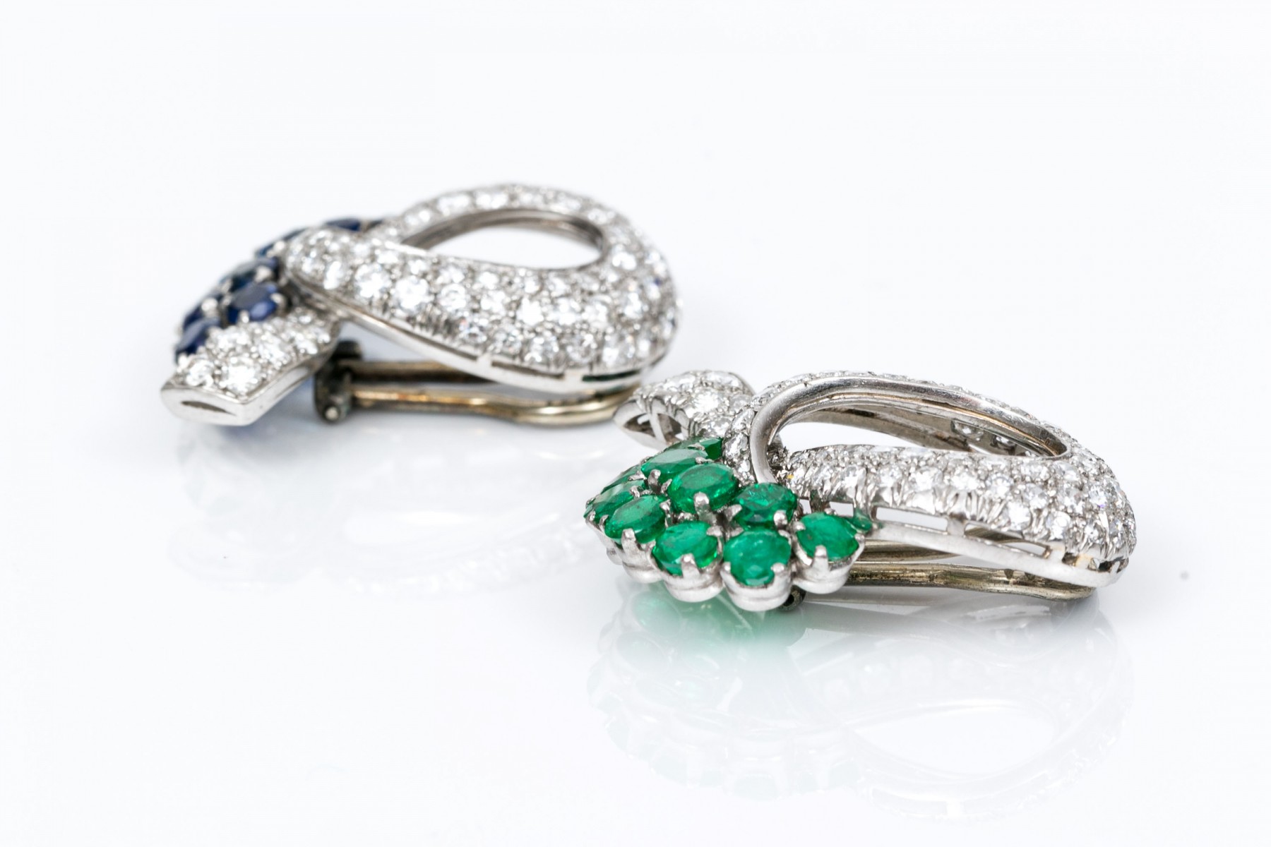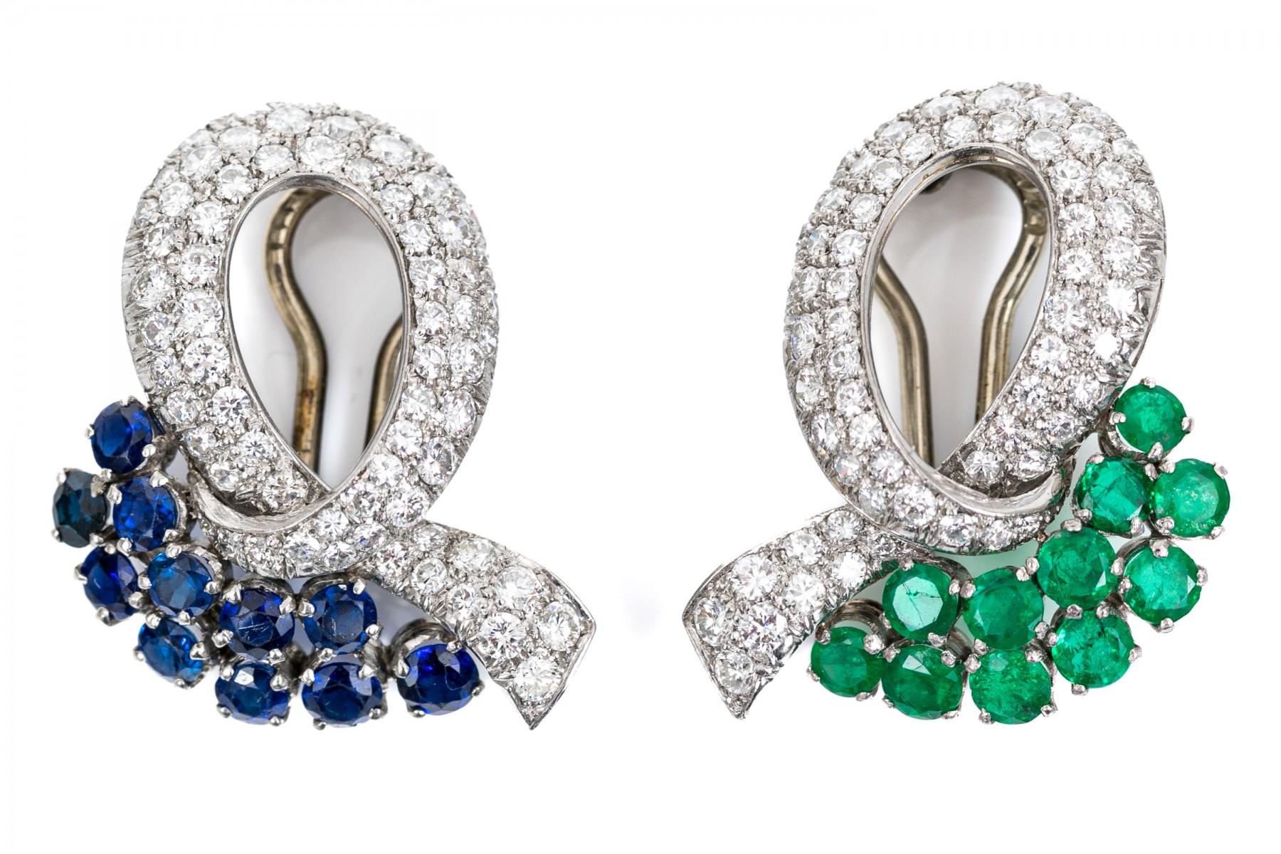 A pair of platinum gem-set ear clips. A pair of opposing crossover ribbon form ear clips, one comprised of sixty-seven round cut diamonds and eleven round cut emeralds, the other of sixty-seven round cut diamonds and eleven round cut sapphires. All gemstones are of fine quality. Please note the omega backs are 14k white gold
