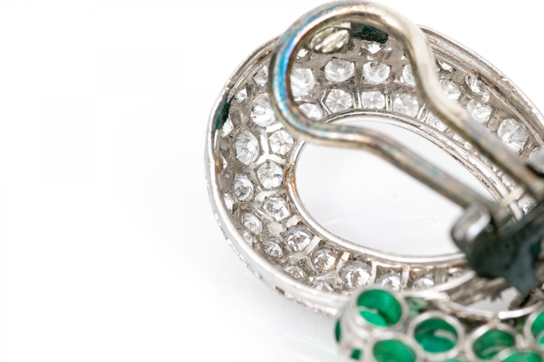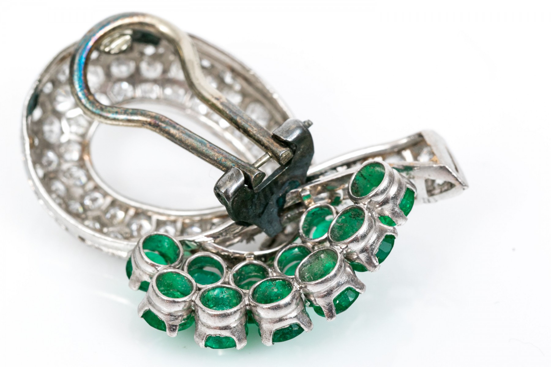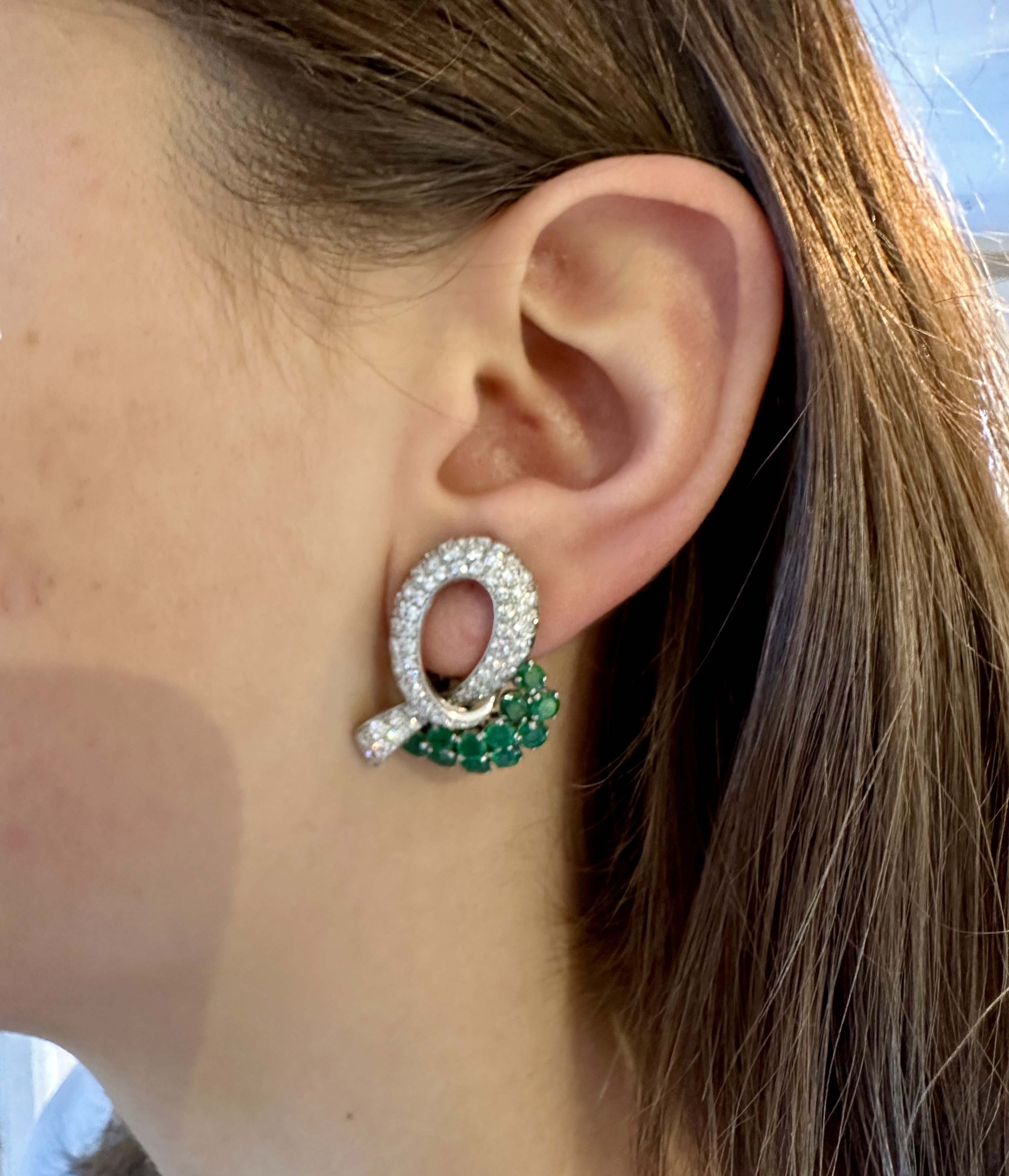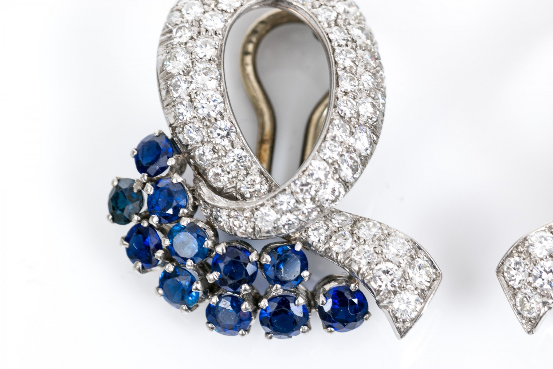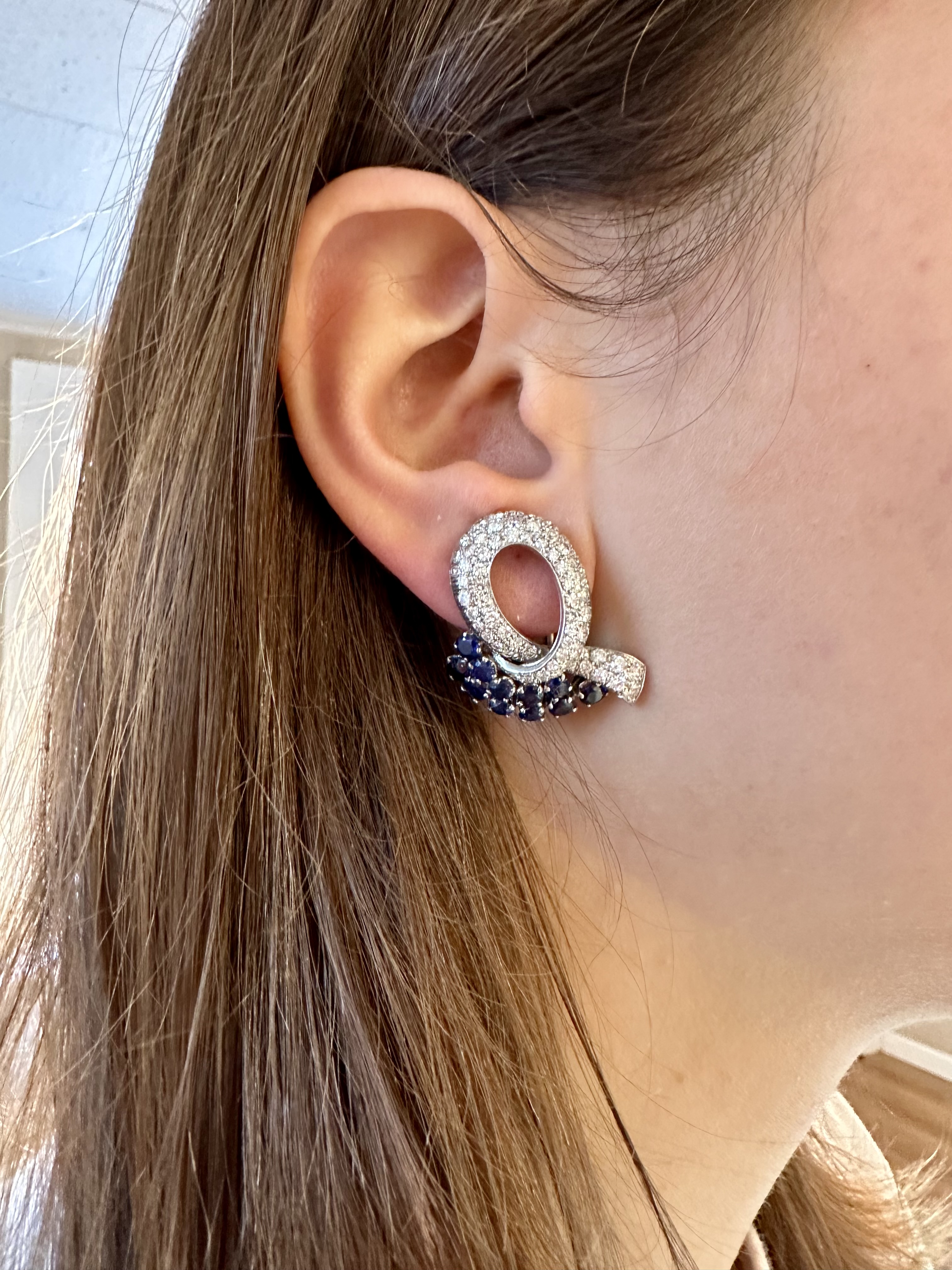 A pair of platinum gem-set ear clips. A pair of opposing crossover ribbon form ear clips, one comprised of sixty-seven round cut diamonds and eleven round cut emeralds, the other of sixty-seven round cut diamonds and eleven round cut sapphires. All gemstones are of fine quality. Please note the omega backs are 14k white gold