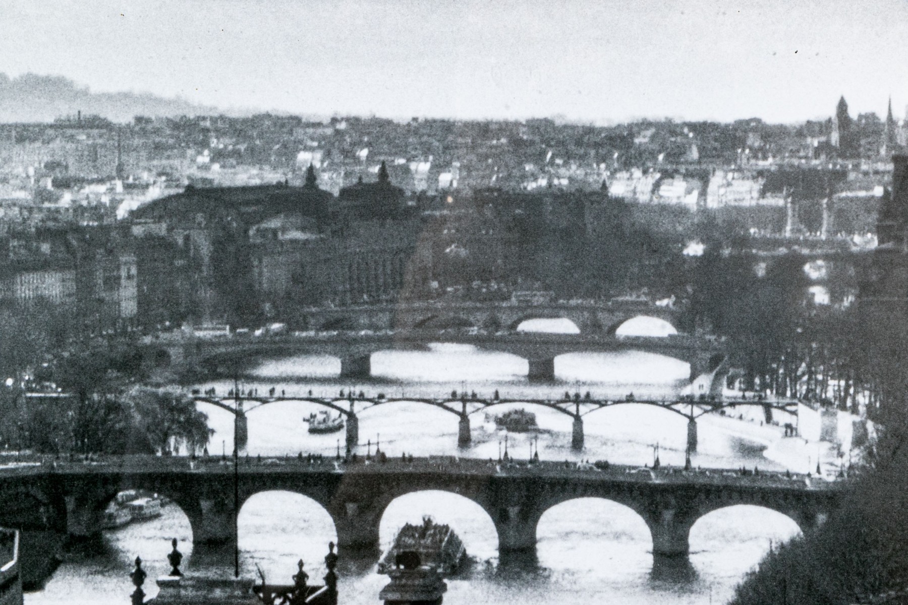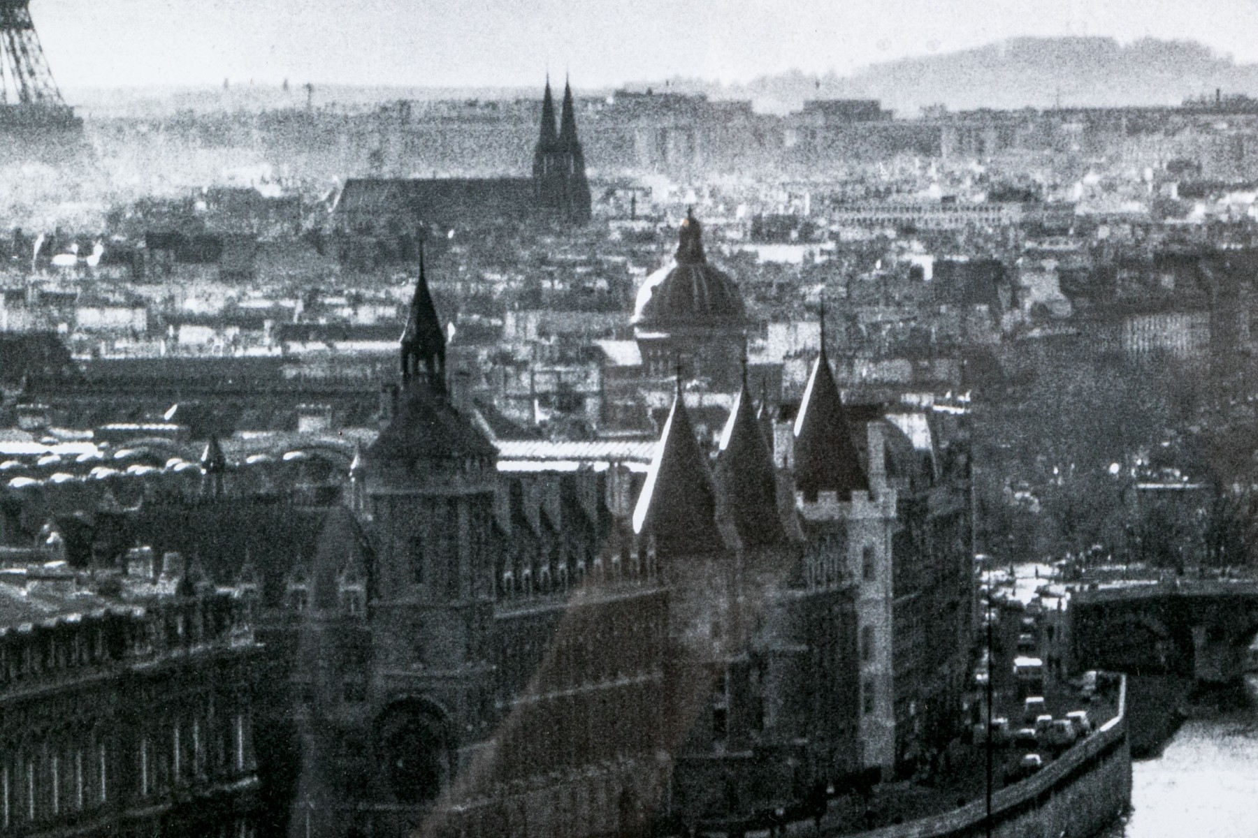 The wonderful landscape photographic print depicting an old photograph of Paris from birds eye perspective displays the Seine with its numerous arched bridges and urban development. Presented framed in a black frame and glazed.