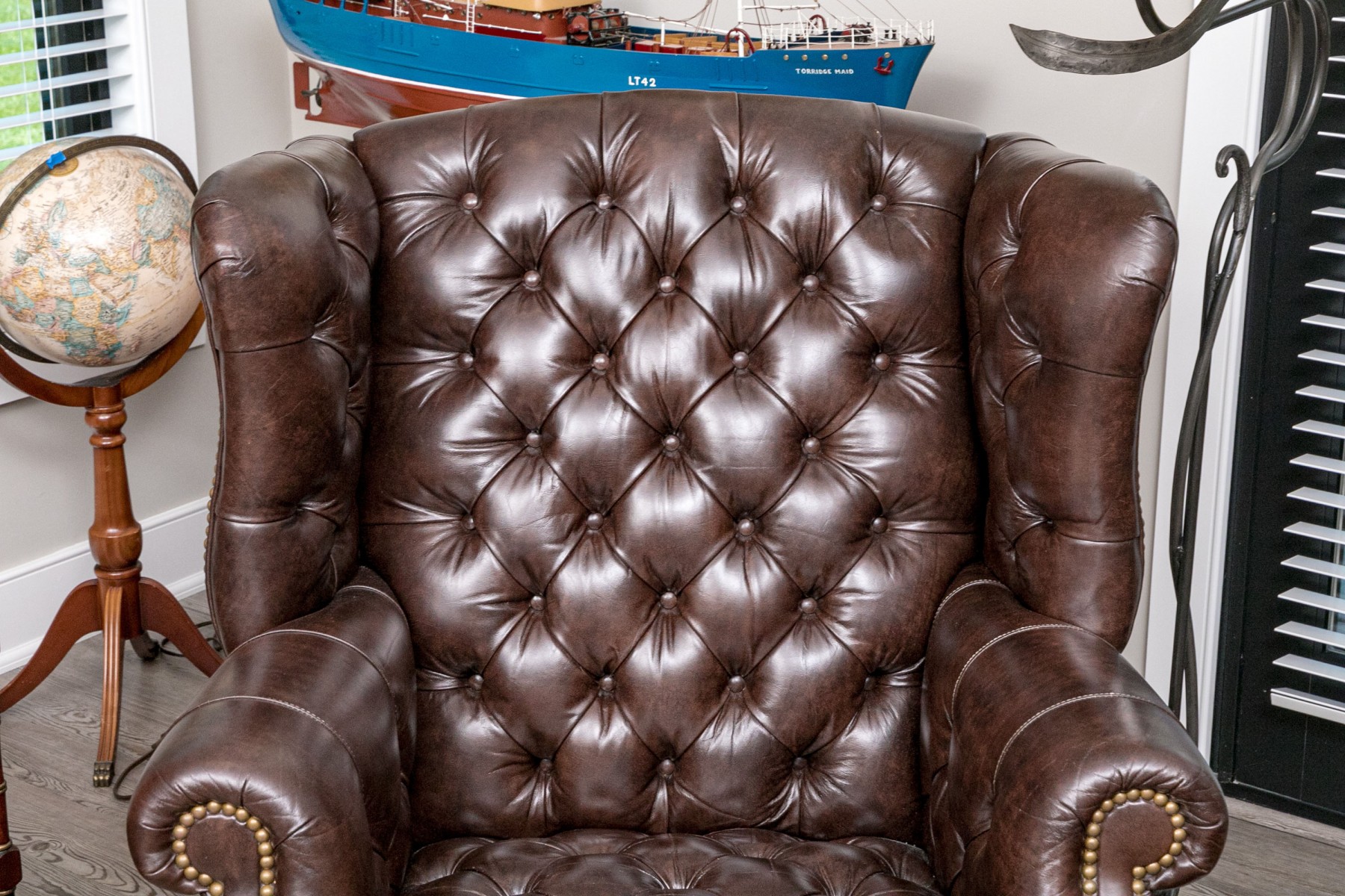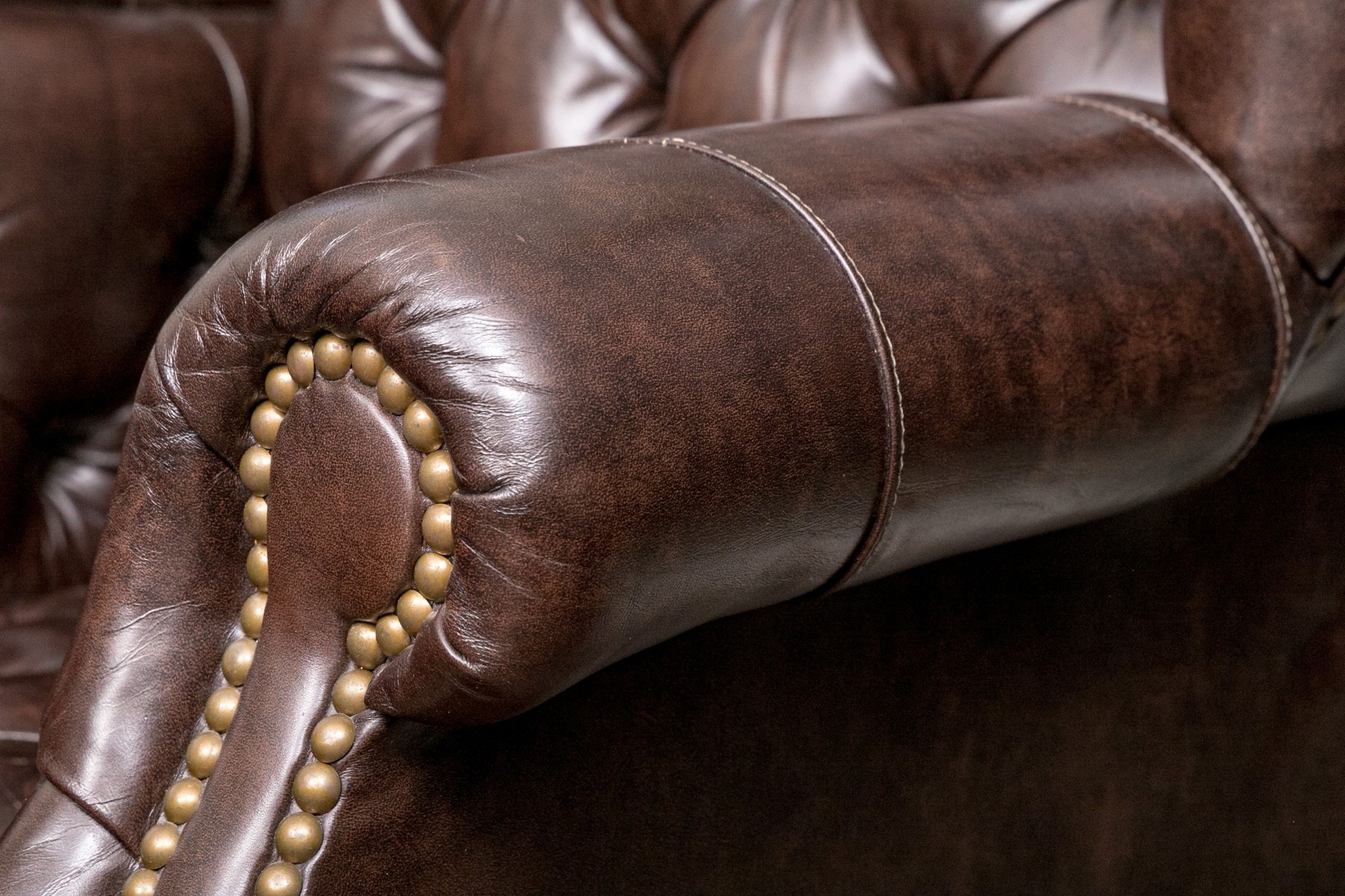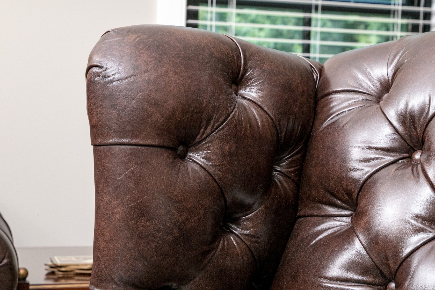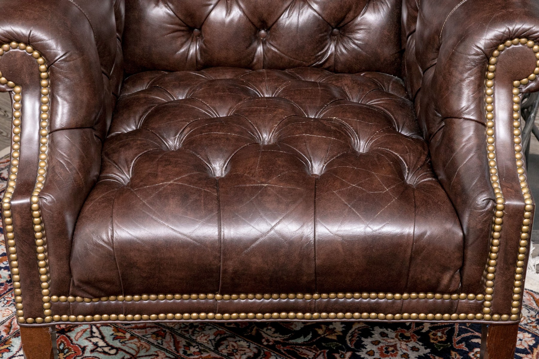 A beautiful button tufted brown leather chair with a brass nail head trim.