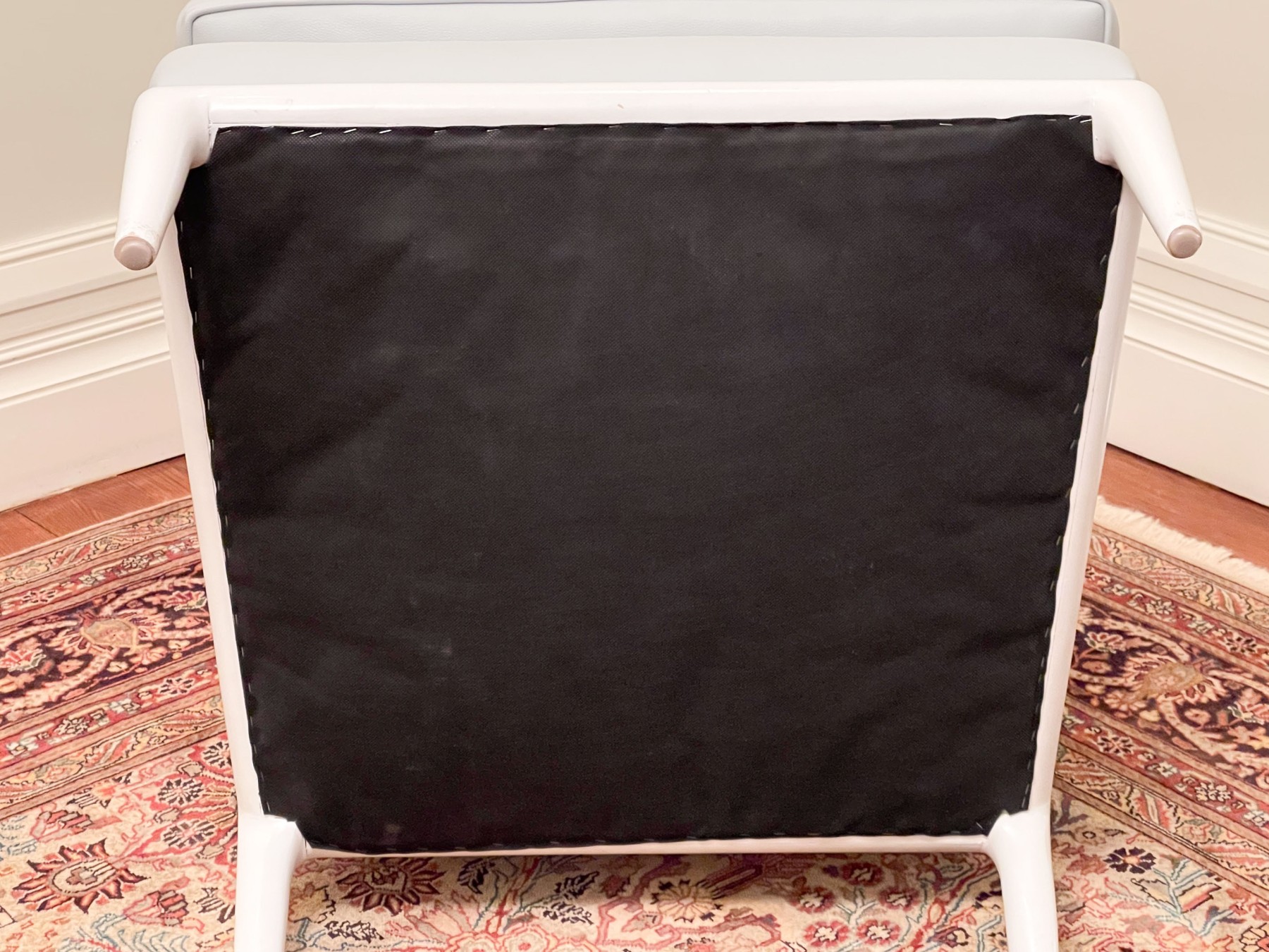 Upholstered slipper chair with rolled back detail. Loose seat cushion and white painted apron/legs.