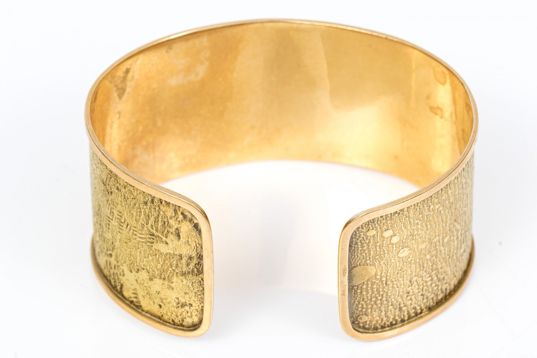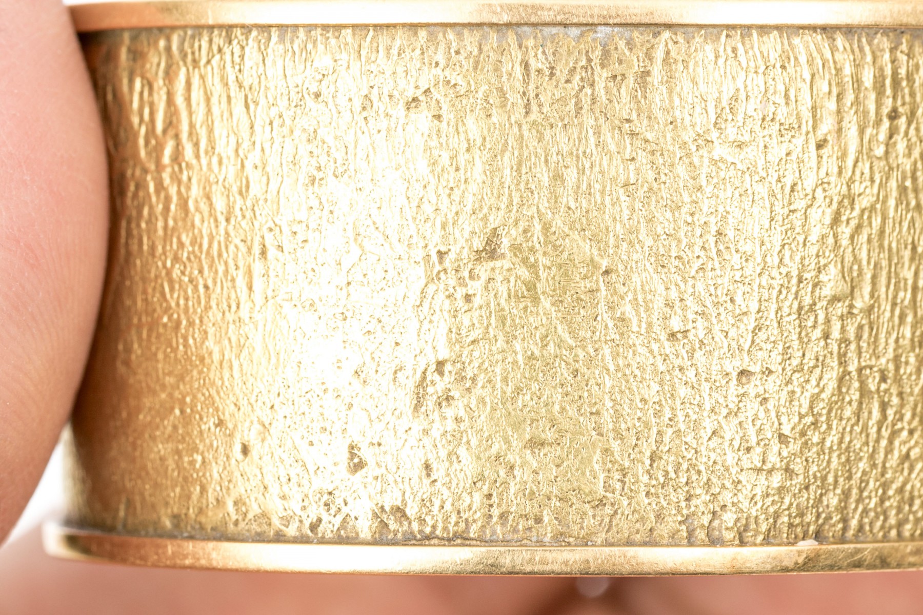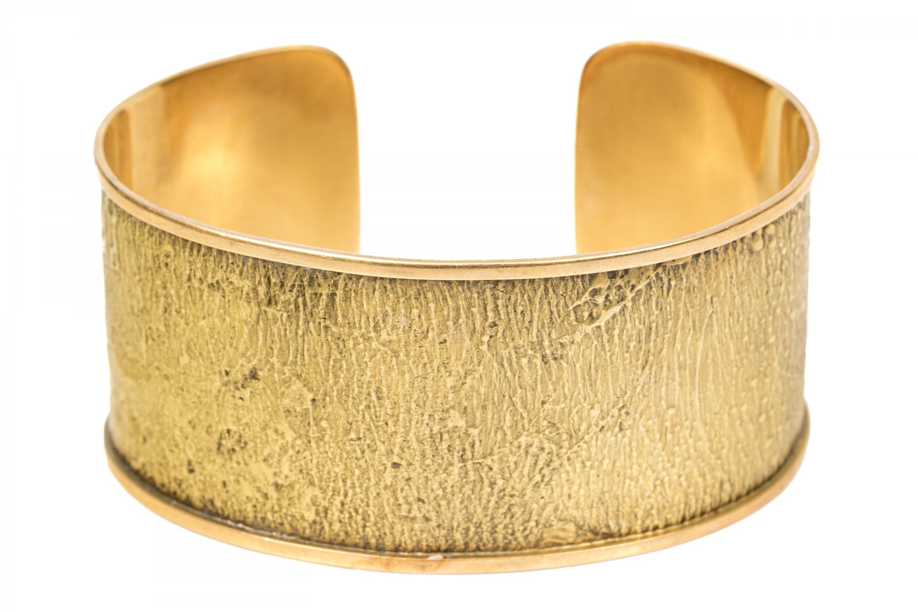 18K yellow gold wide cuff style bracelet with a textured finish.