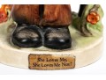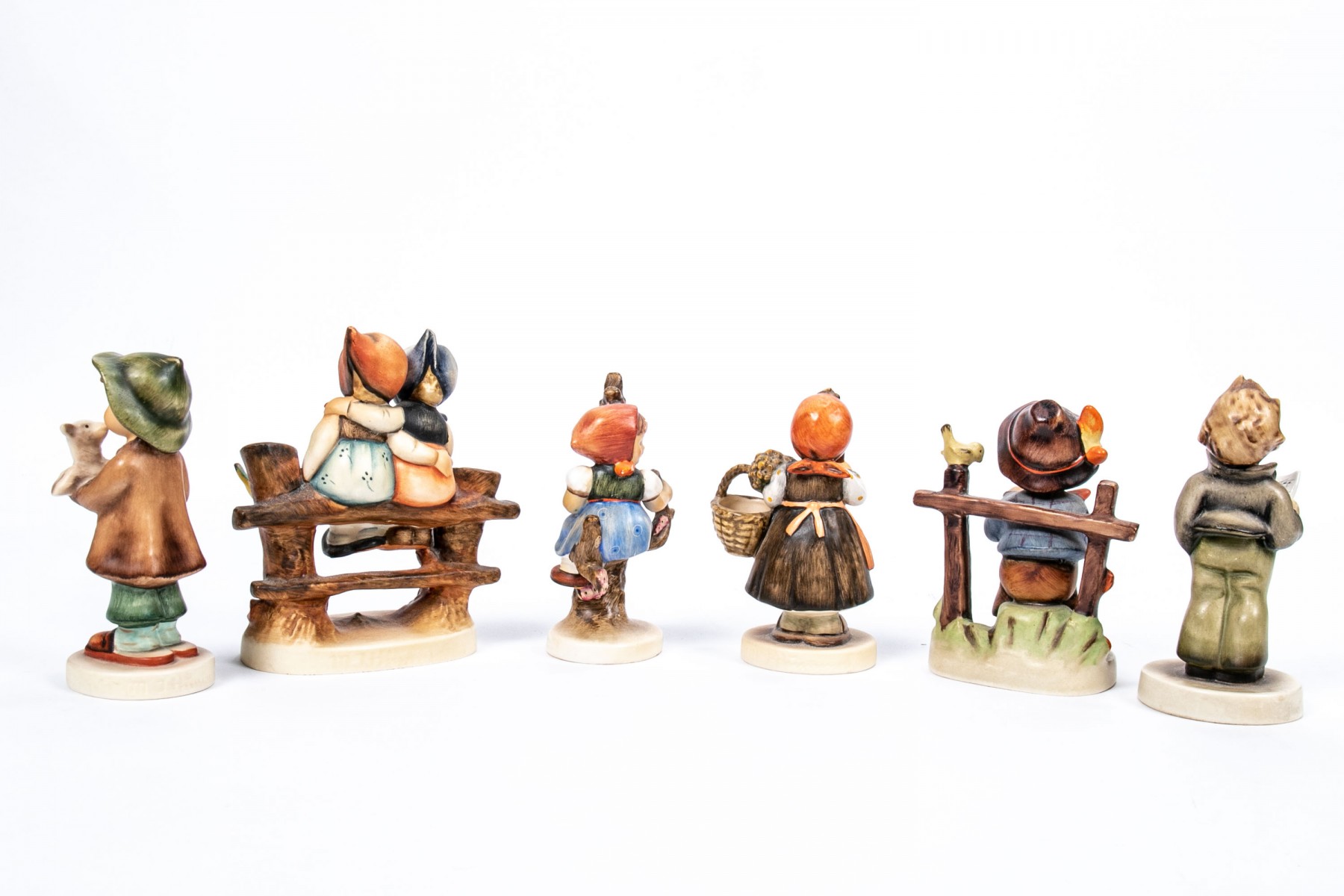 A vintage 6 piece collection of German Goebel hummel porcelain figurines, of assorted sizes and showcasing charming hand painted depictions of children in varying scenes in detailed and sculpted form. Mounted on raised platform bases. Makers mark found verso, marked Goebel - made in Germany.
