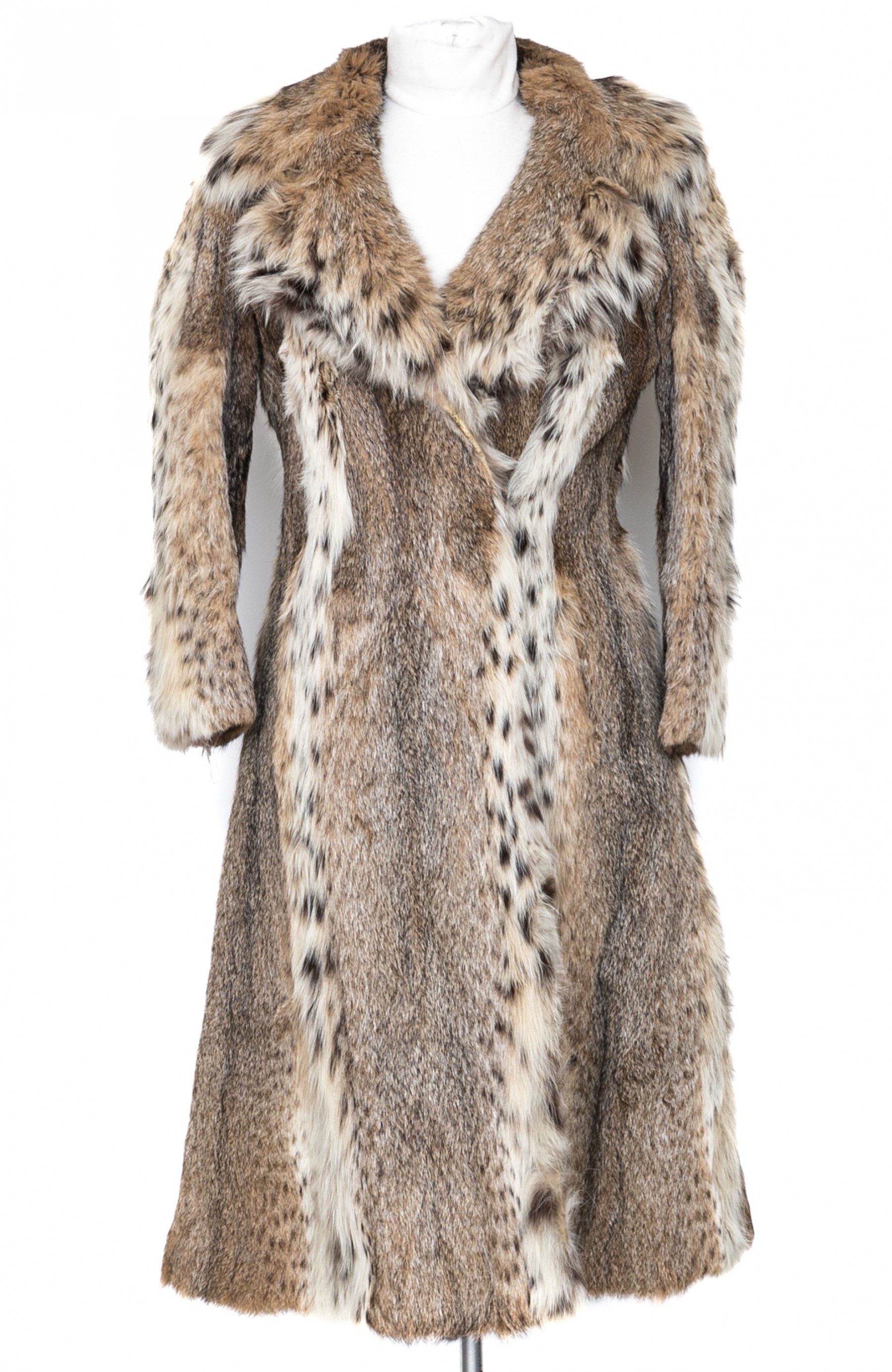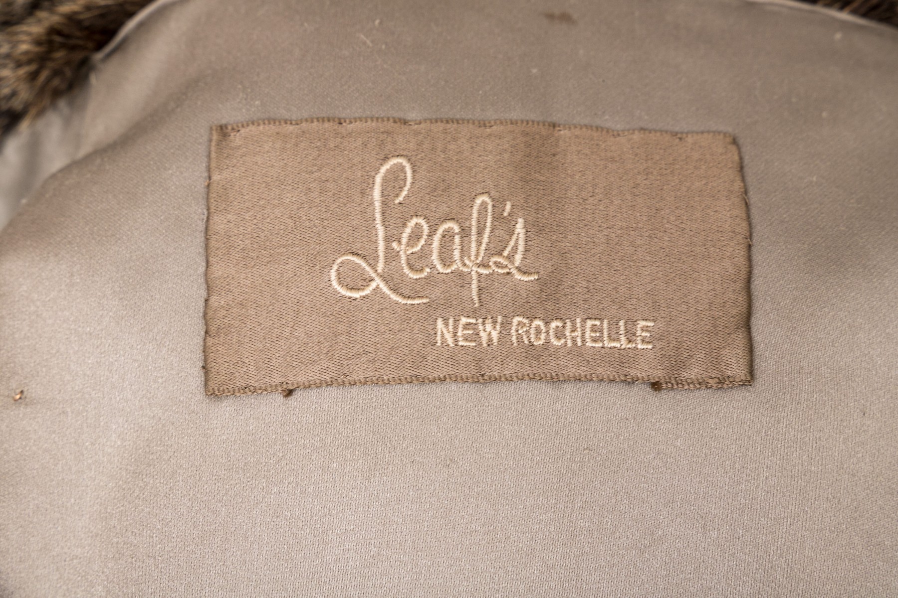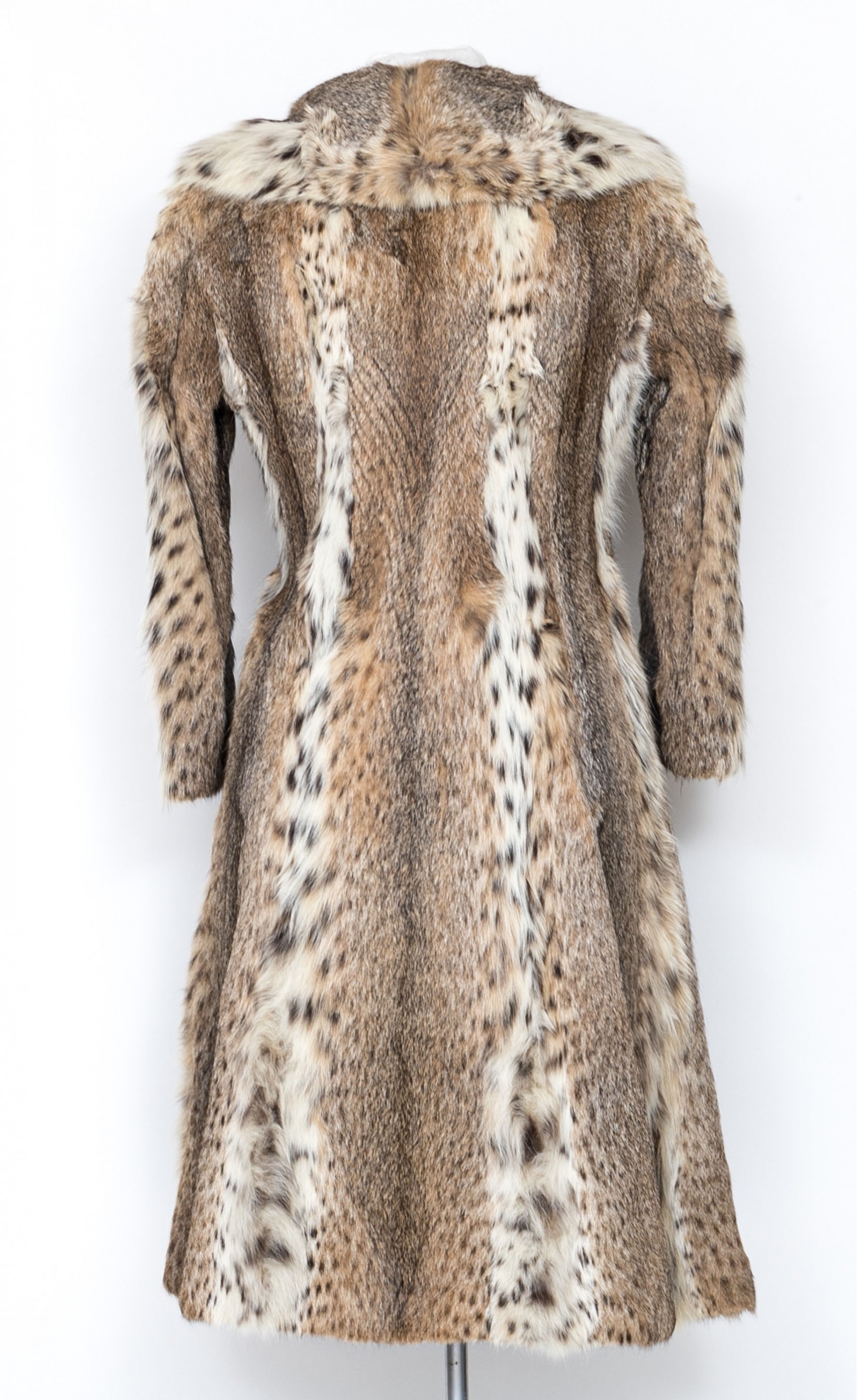 A ladies vintage 3/4 length lynx fur coat having straight sleeves and a shawl collar from Leaf's of New Rochelle.