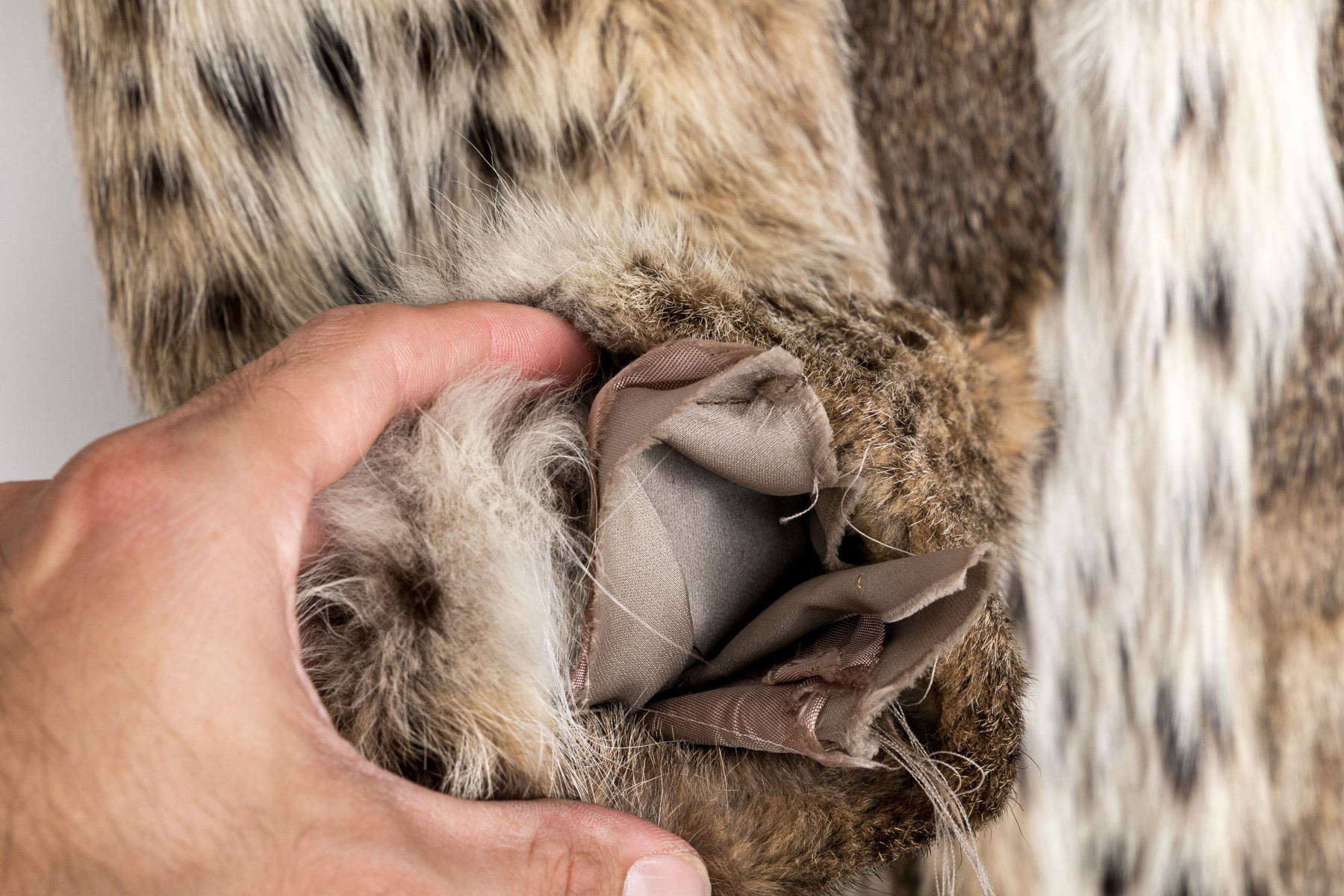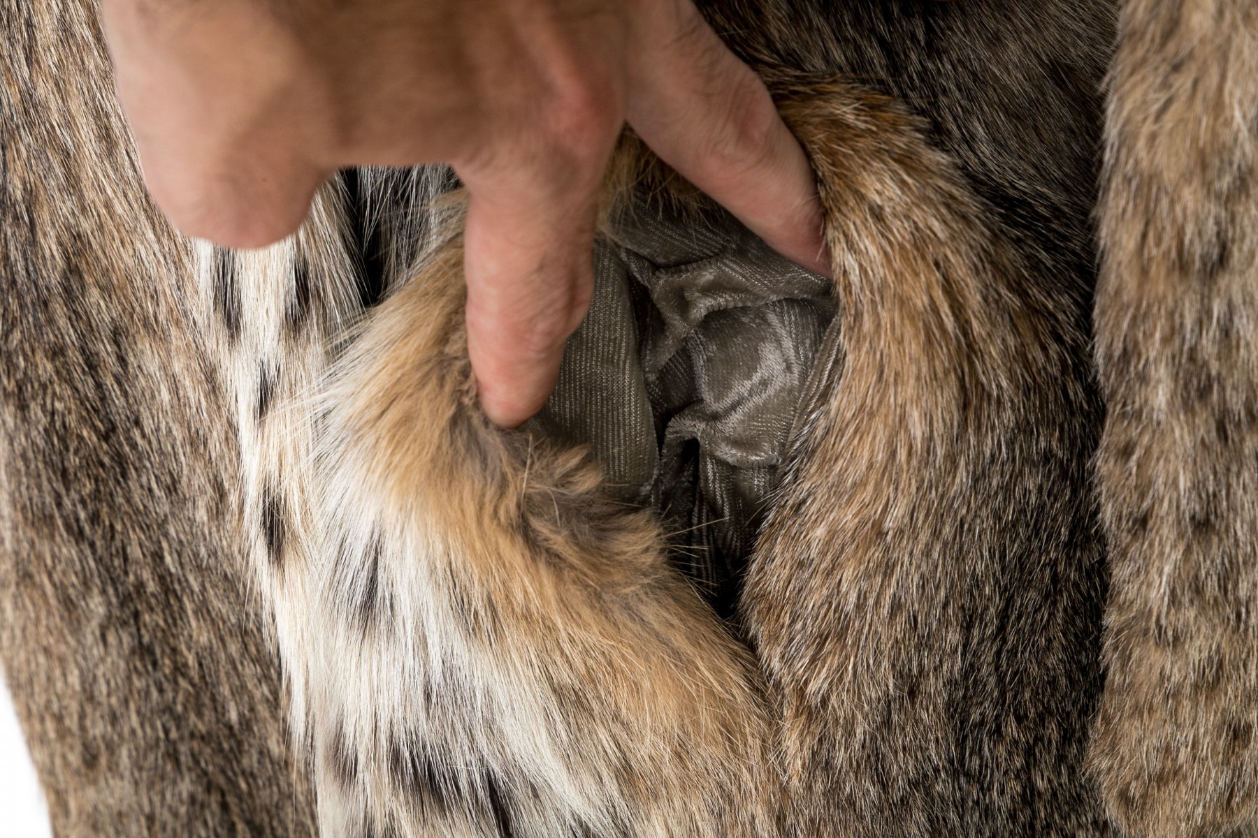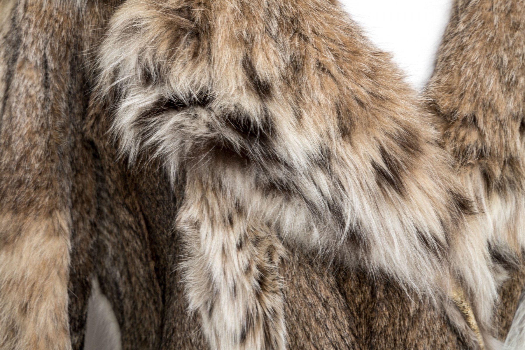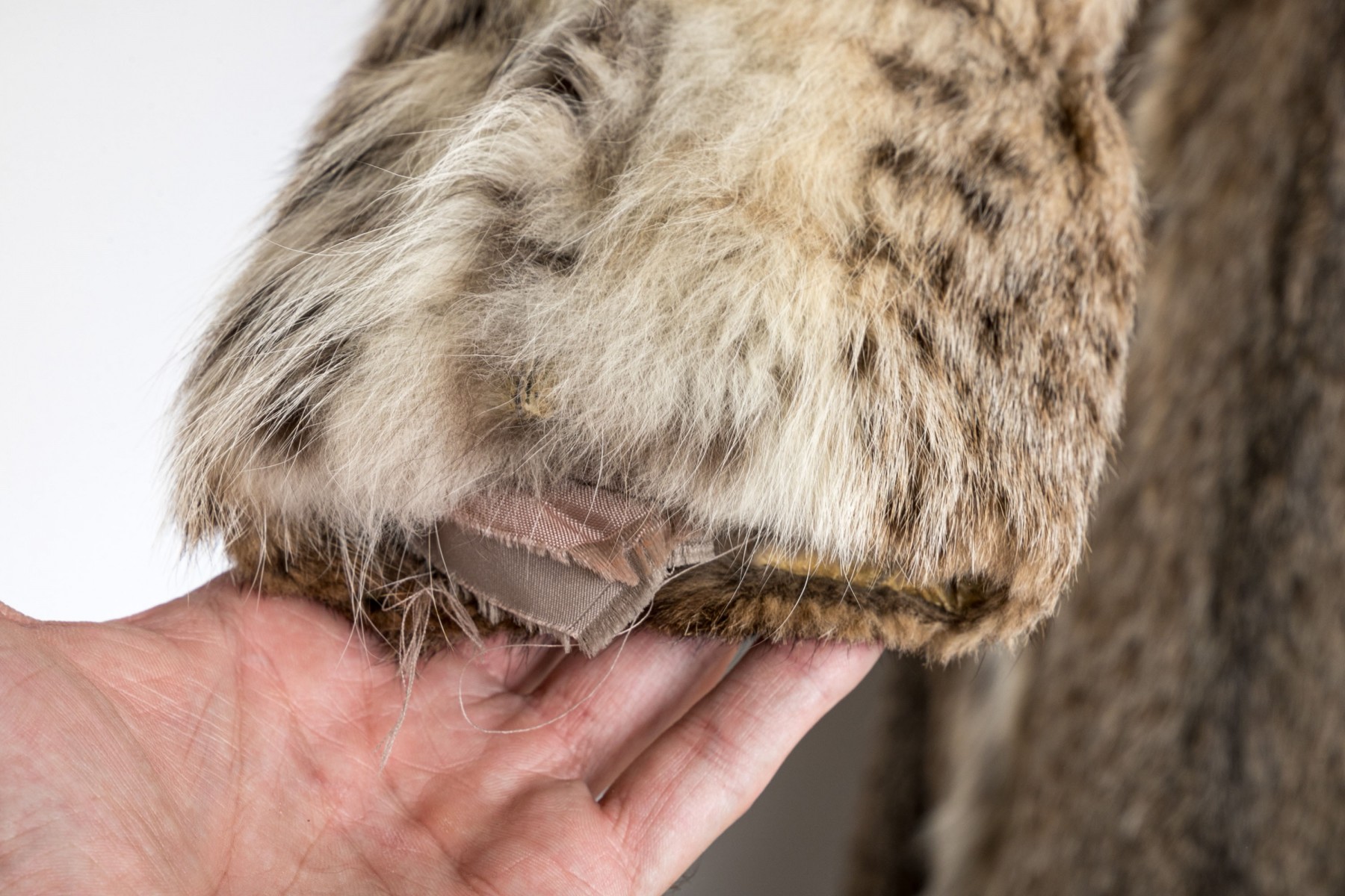 A ladies vintage 3/4 length lynx fur coat having straight sleeves and a shawl collar from Leaf's of New Rochelle.