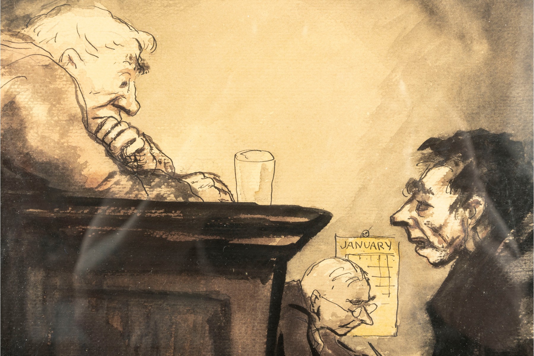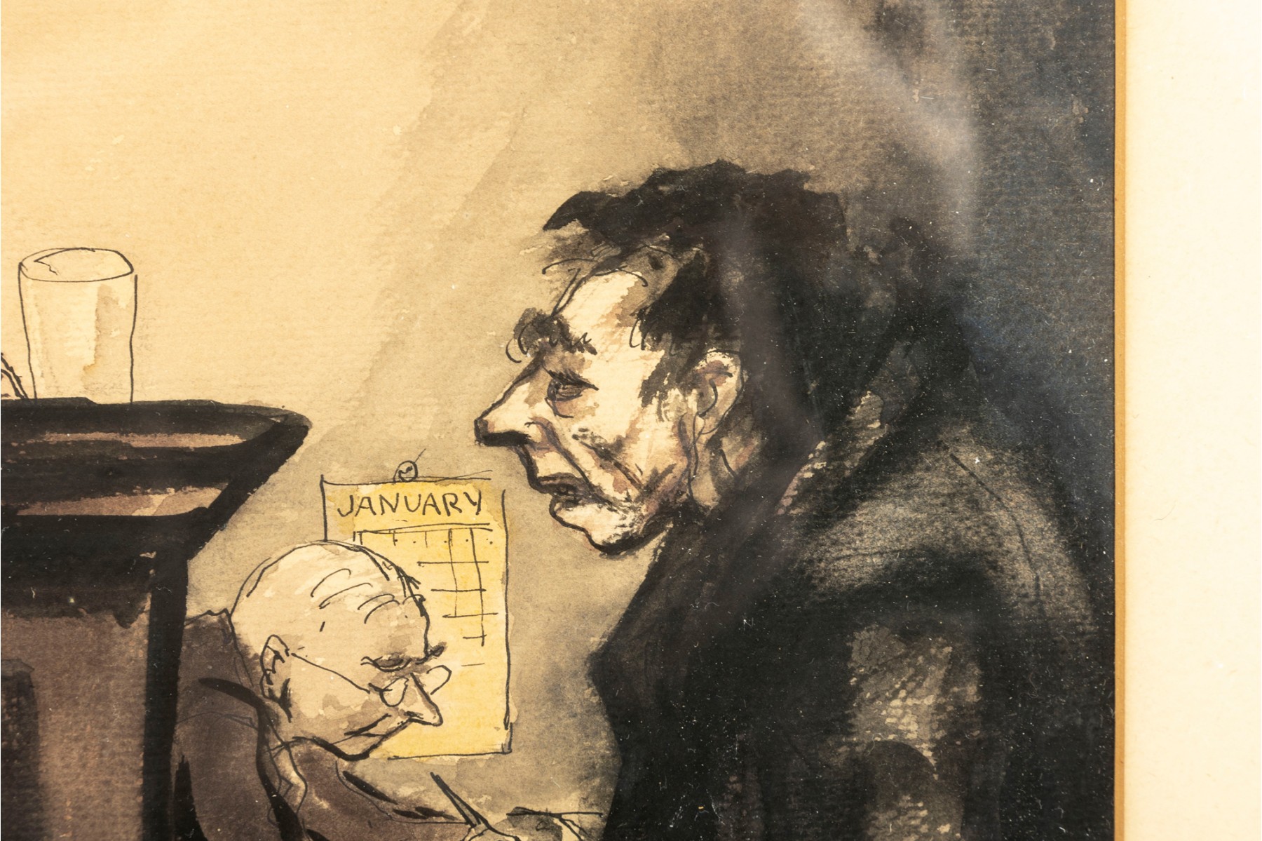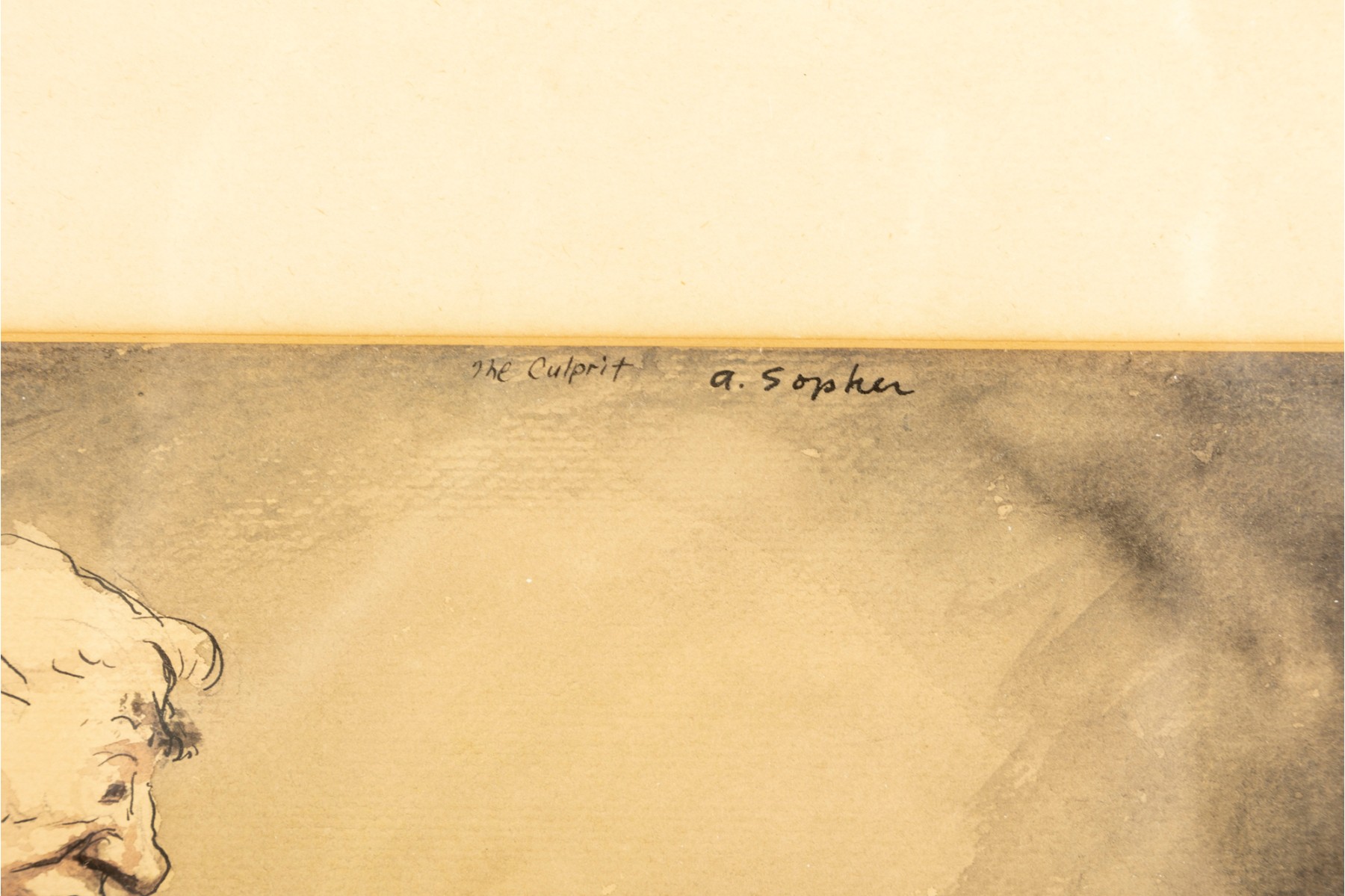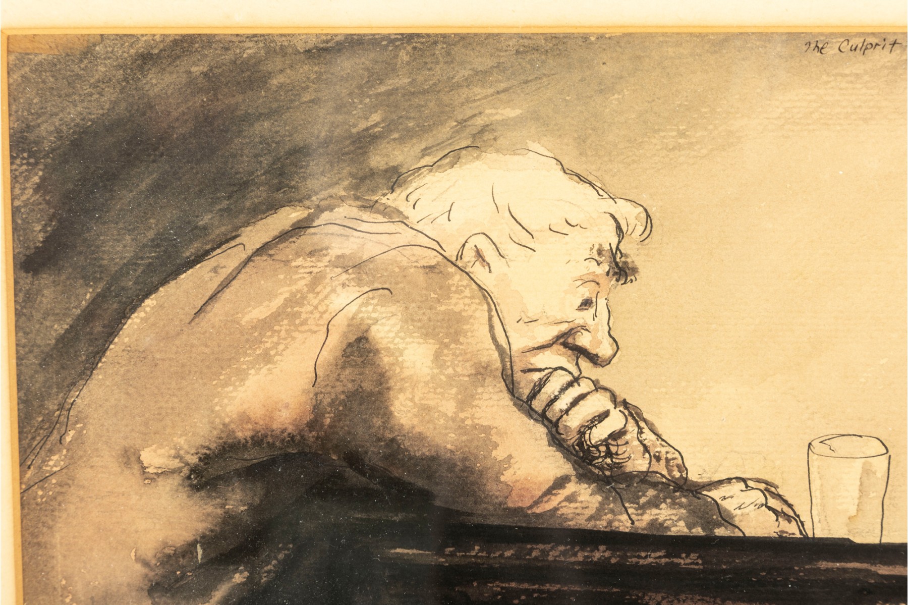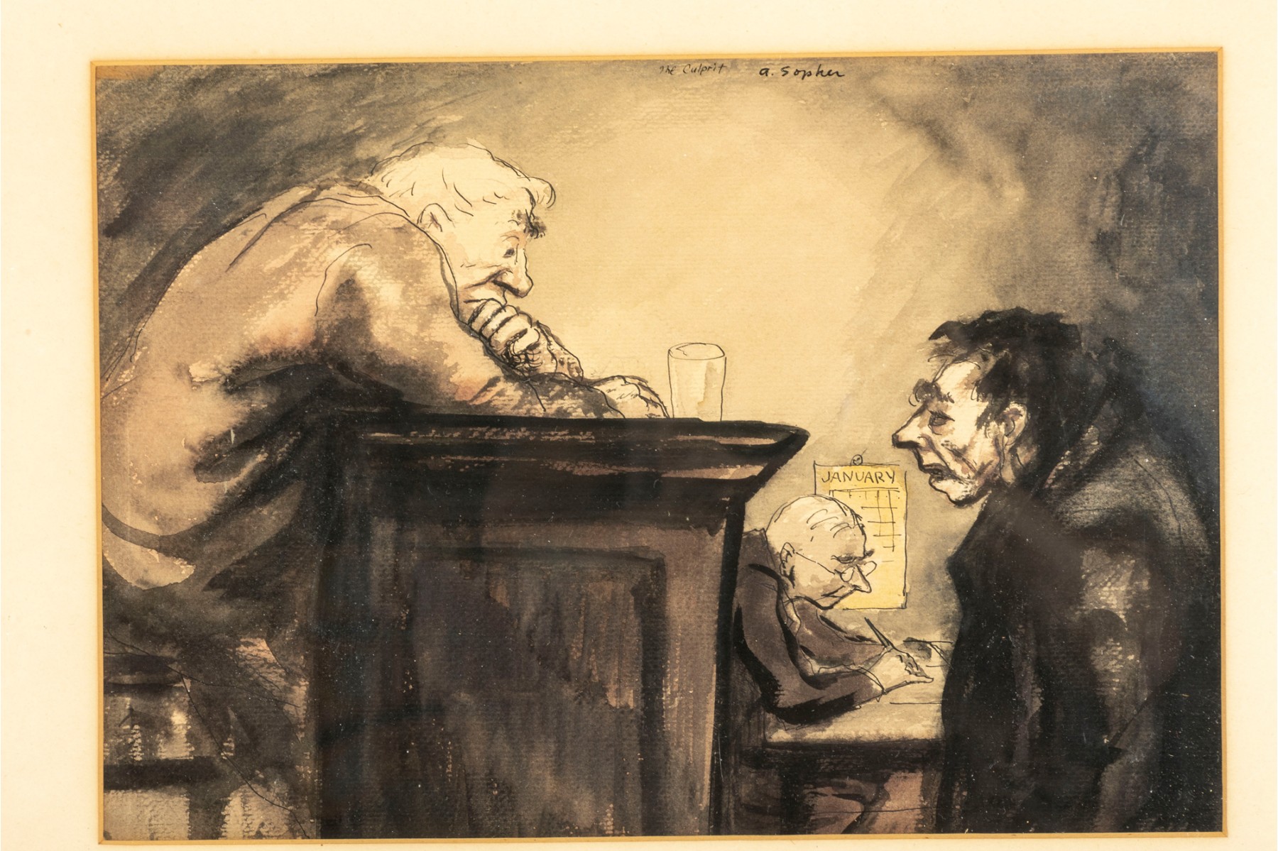 An original piece entitled, "The Culprit" by American artist Aaron Sopher (B. 1905-1972) depicting a court scene derived from an ink wash/watercolor medium. The artwork is presented in a simple wood frame accented with a mat border contained behind glass.