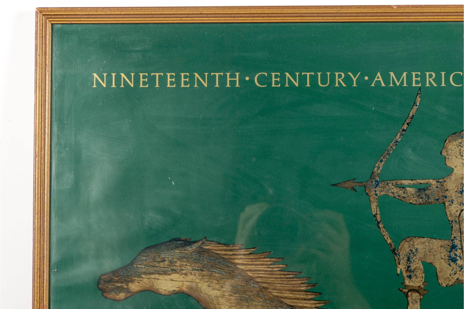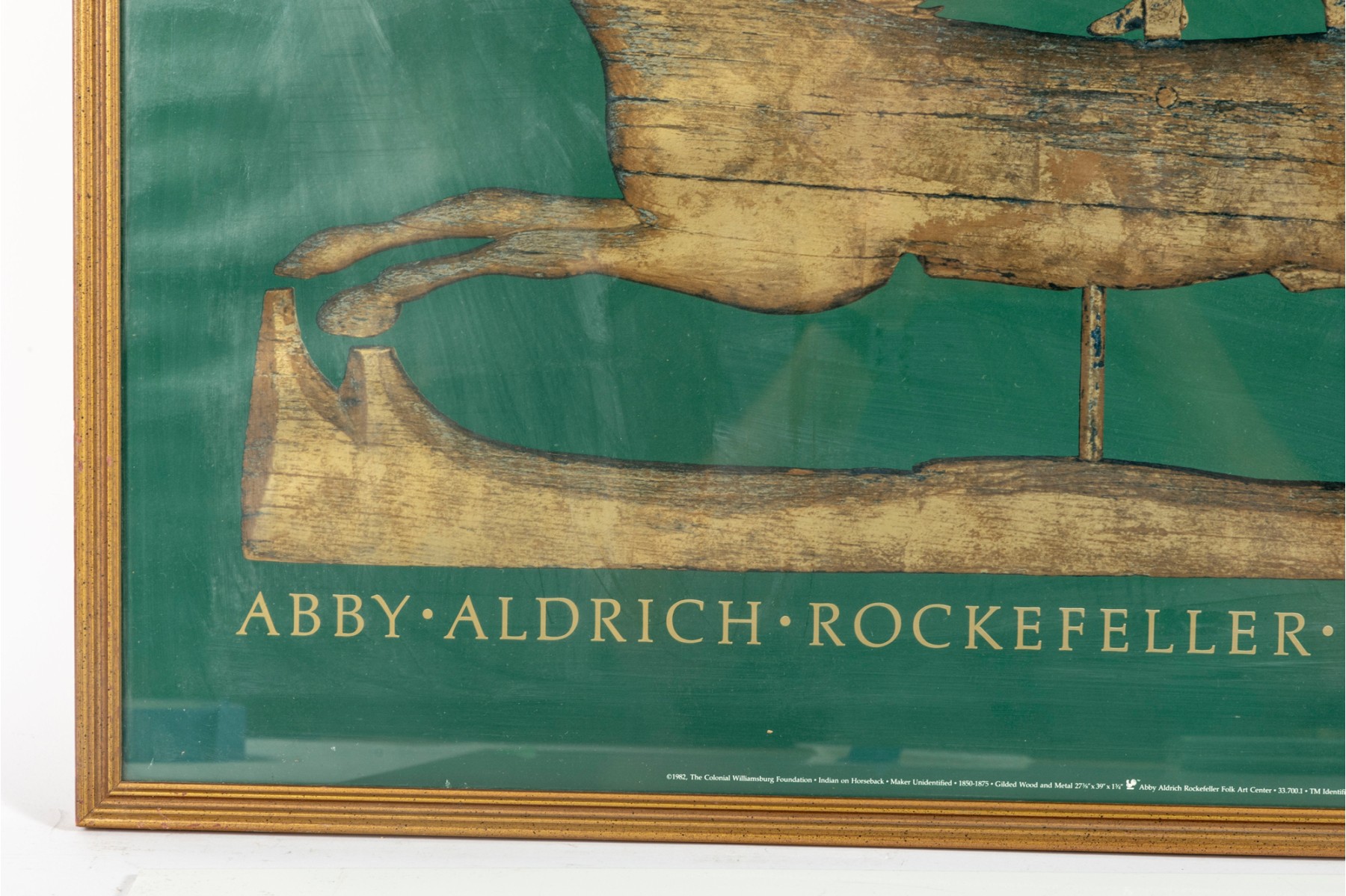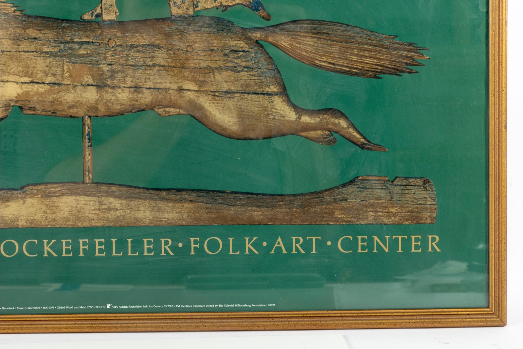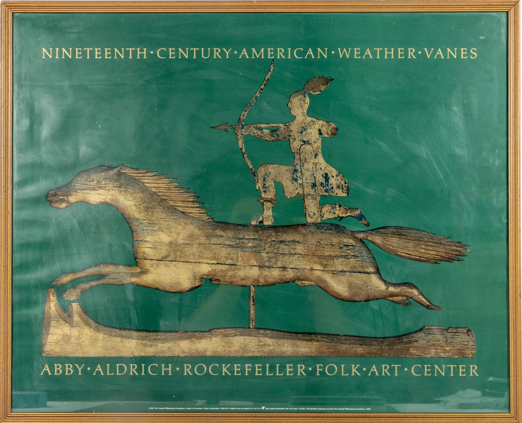 The Abby Aldrich Rockefeller Folk Art Museum is in Colonial Williamsburg, Virginia. This official poster is meant to advertise an exhibit for 19th century weather vanes -- presented in a gold-tone wood frame, and faced with glass.