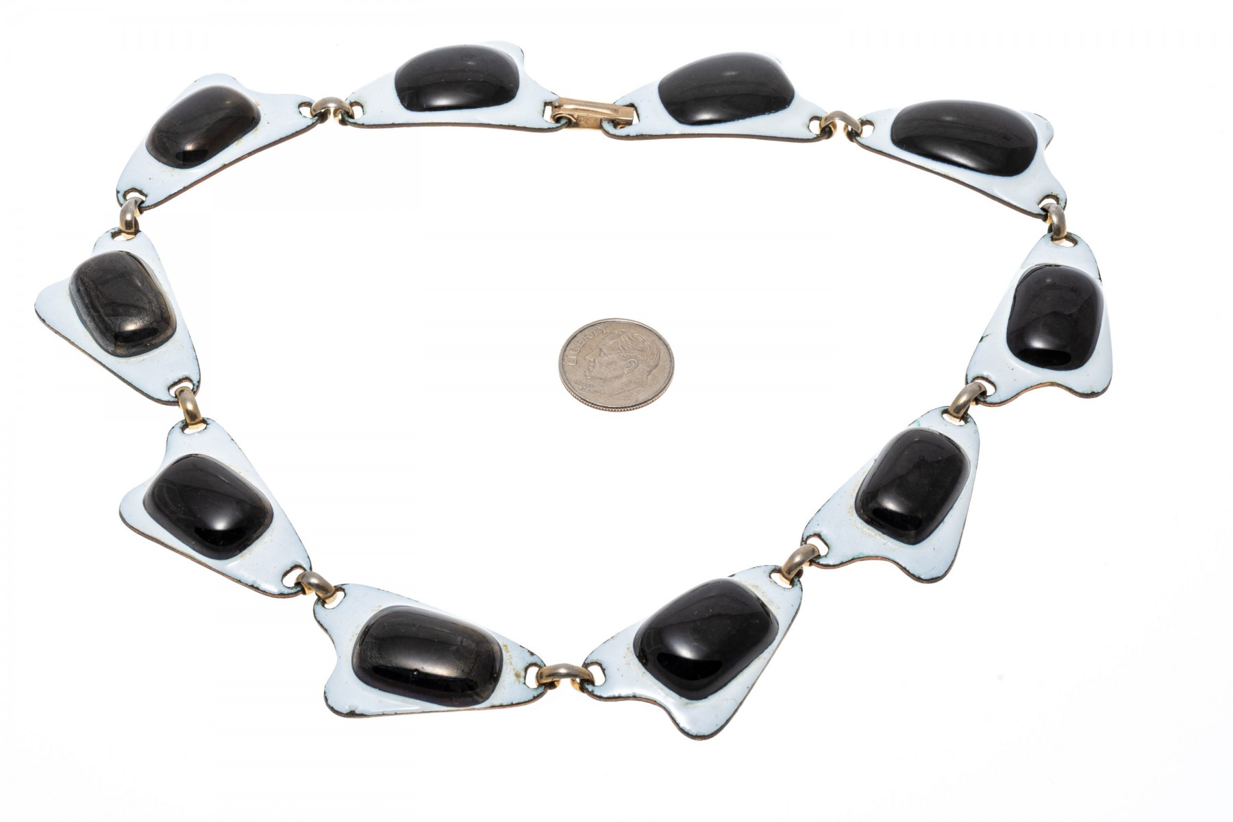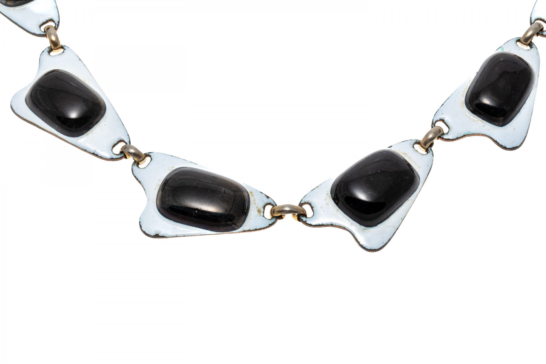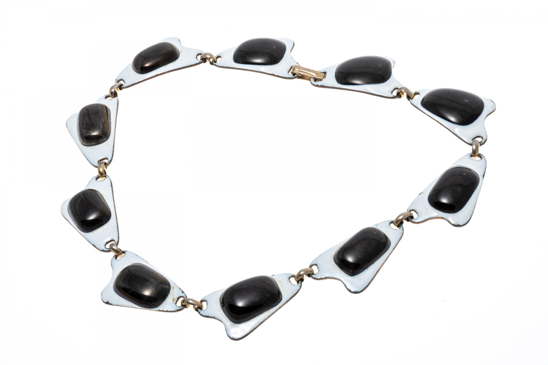 A fashionable necklace by Kay Denning. The links of the necklace have an abstract design with black accents over a white backing. The necklace secures with a latch style clasp