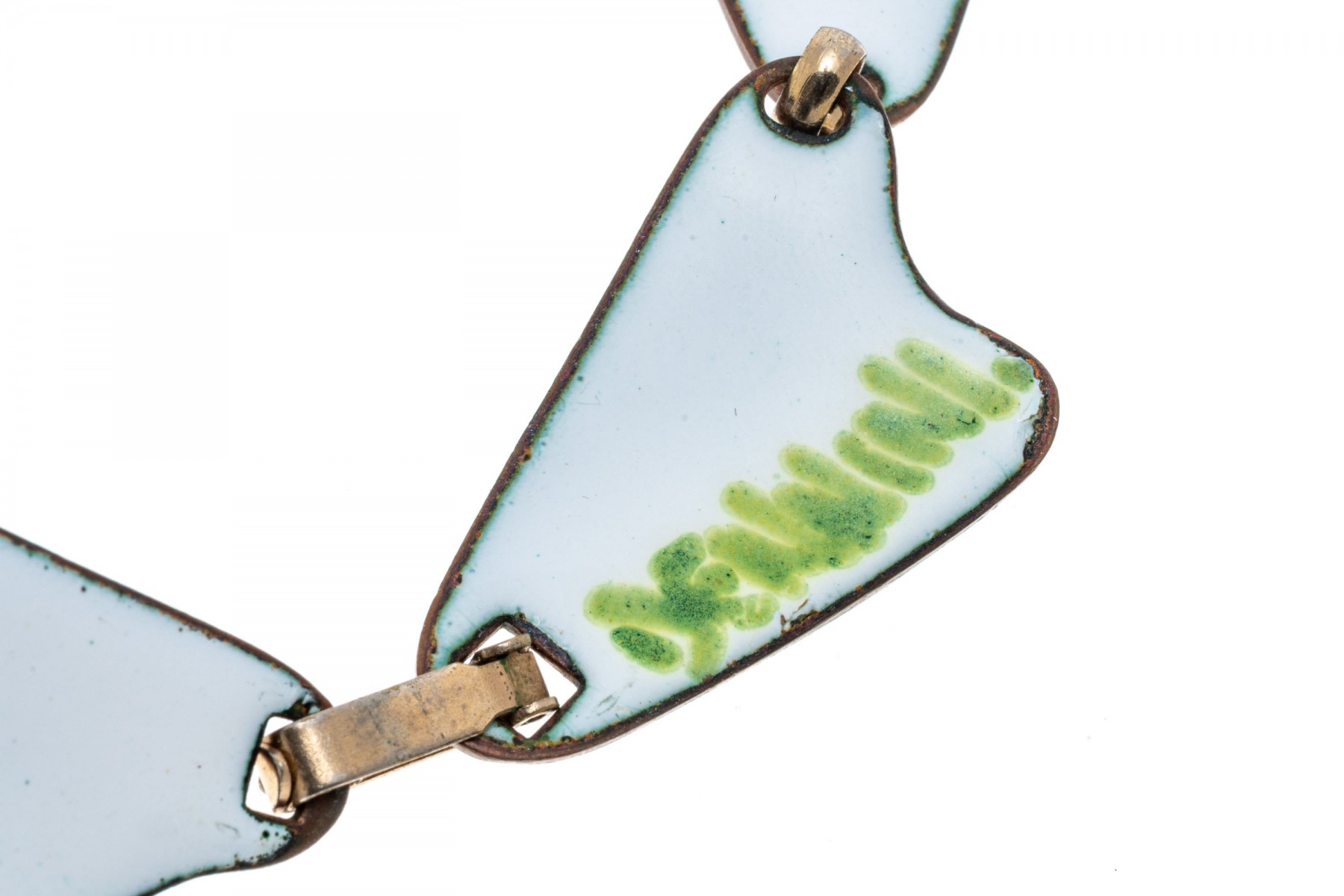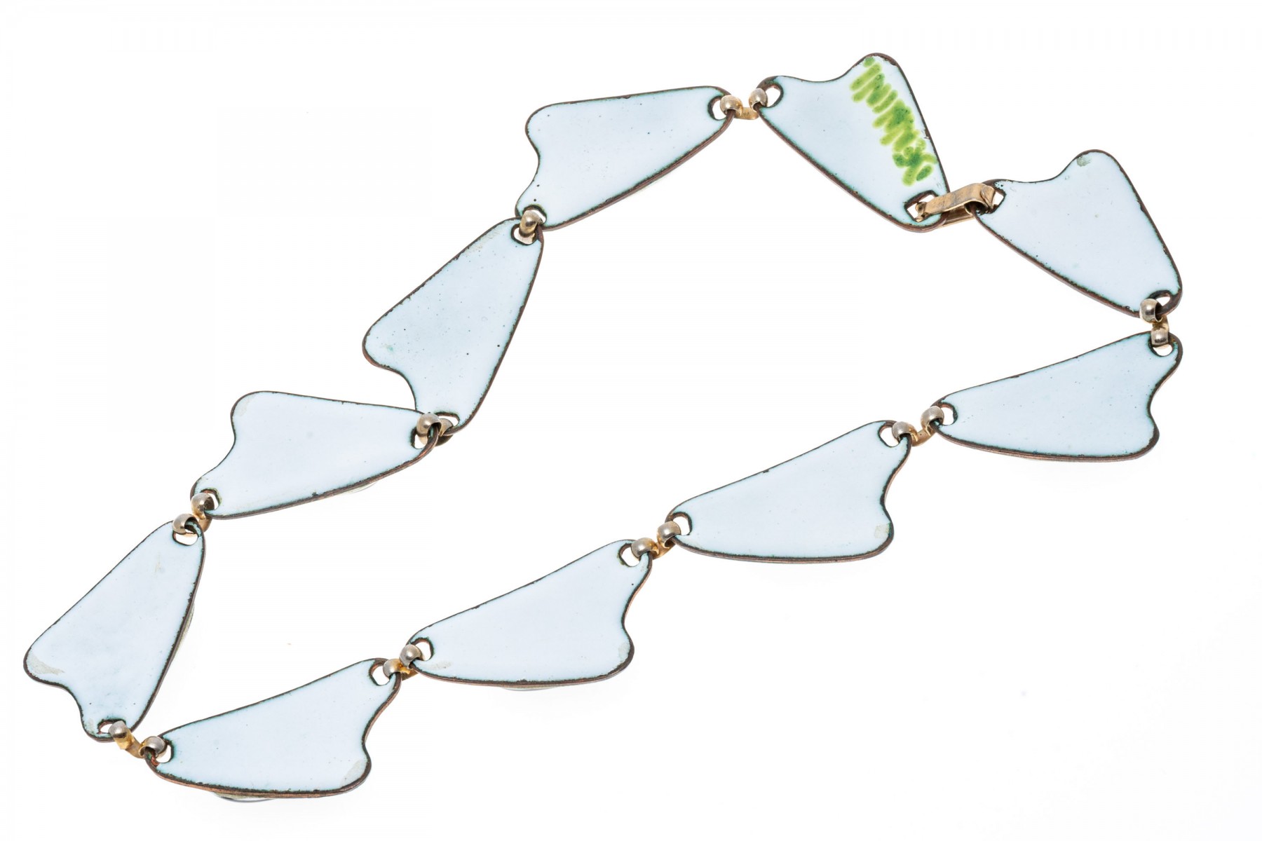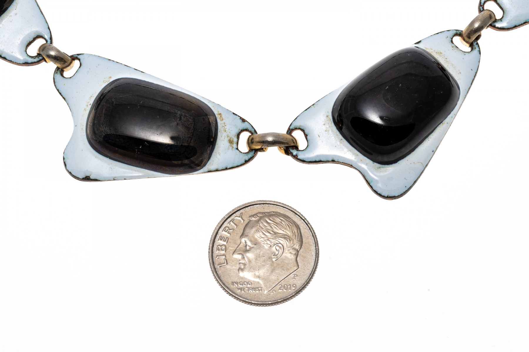 A fashionable necklace by Kay Denning. The links of the necklace have an abstract design with black accents over a white backing. The necklace secures with a latch style clasp