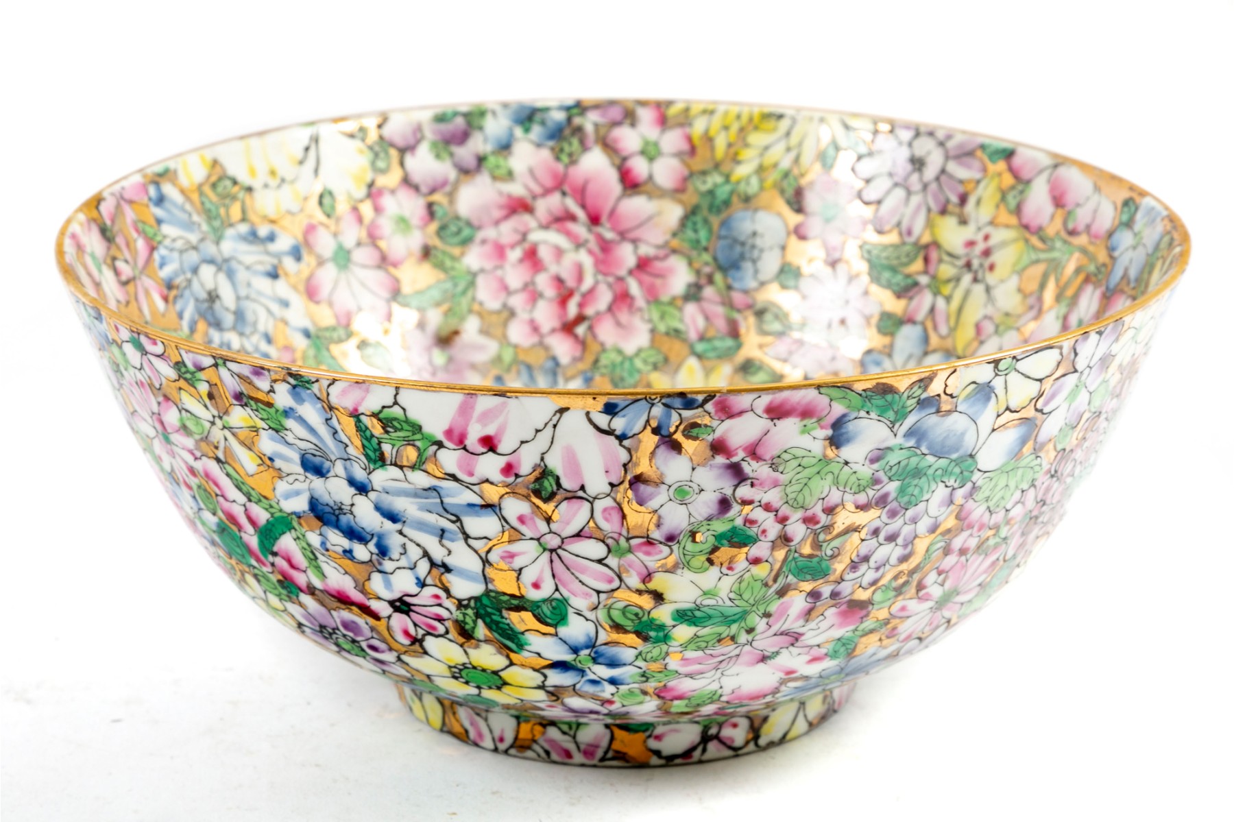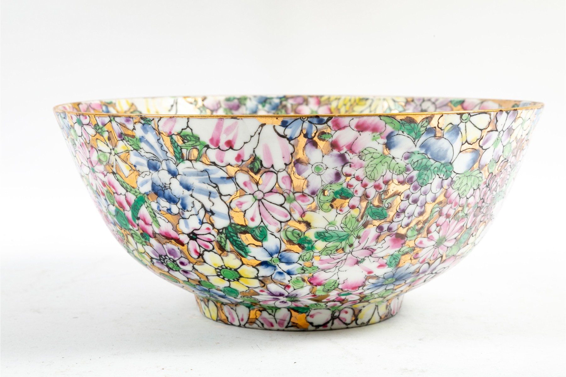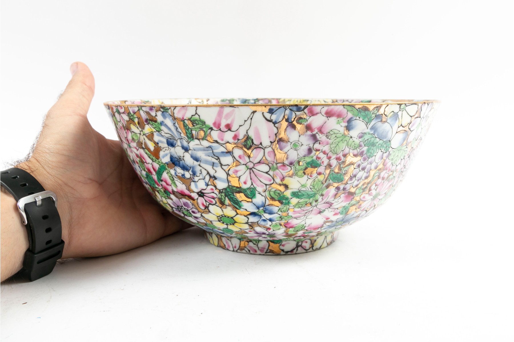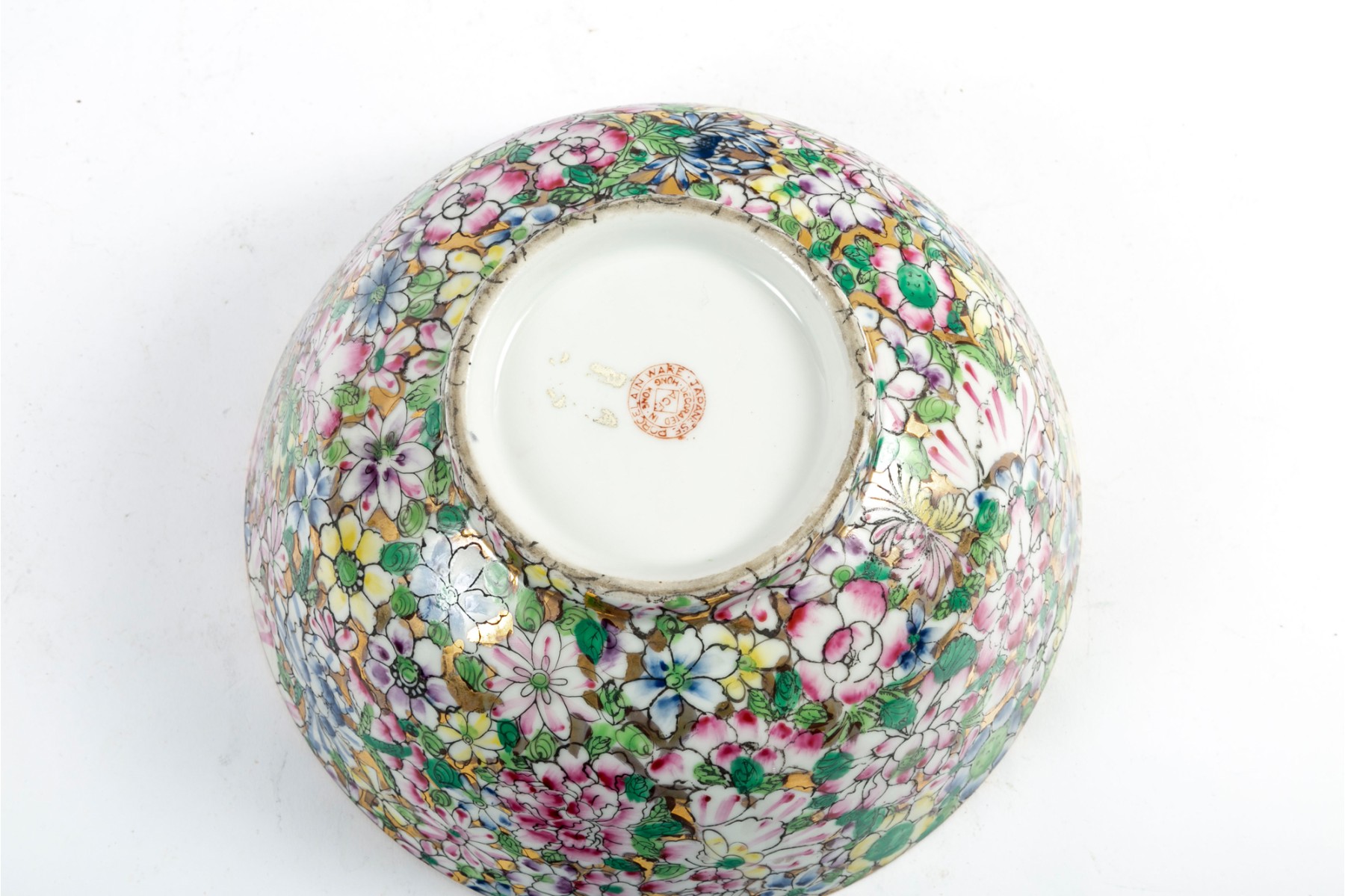 An ornate, hand-painted in Hong Kong Japanese 10" porcelain bowl decorated in rich polychrome florals over metallic gilt.