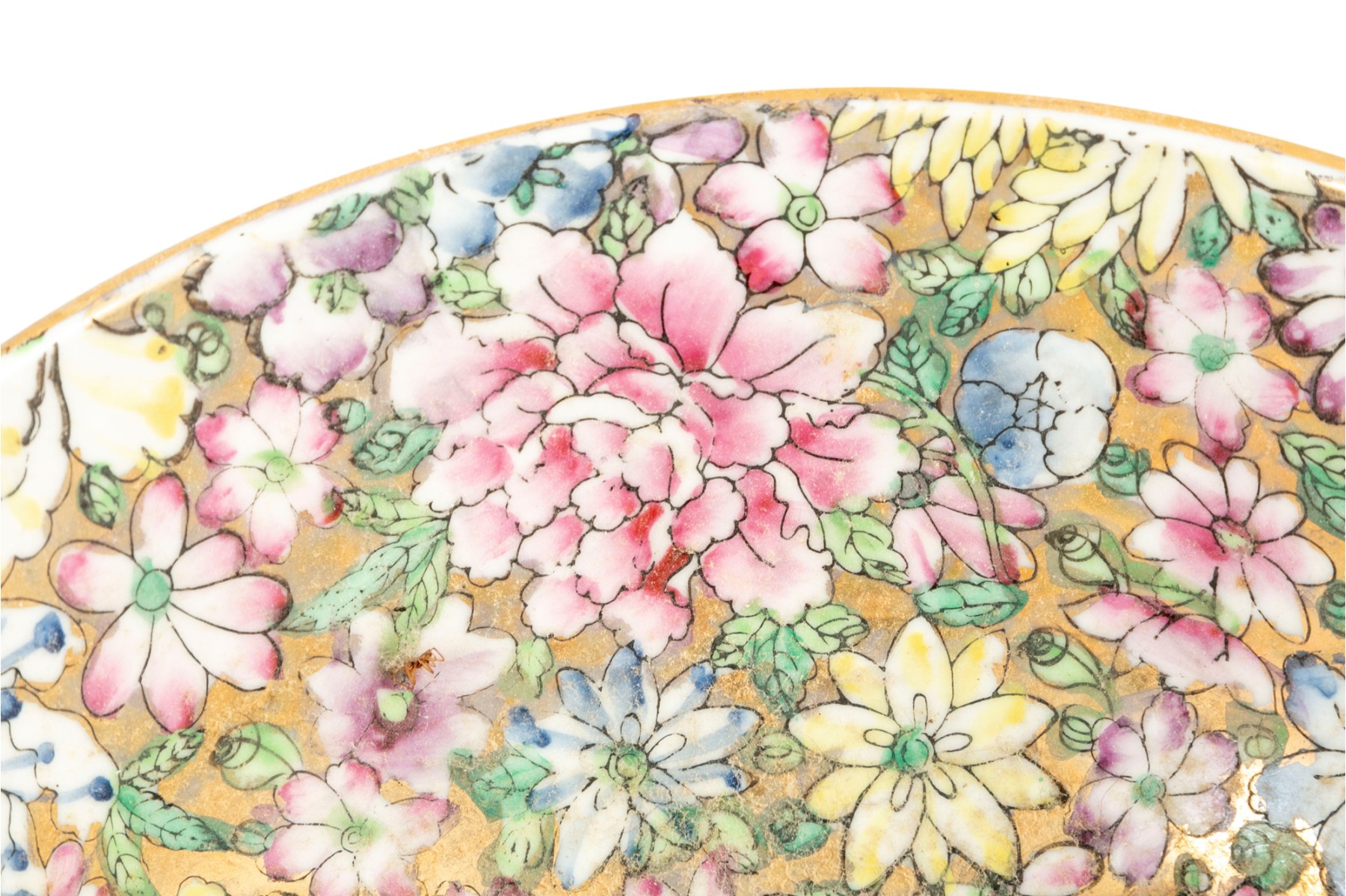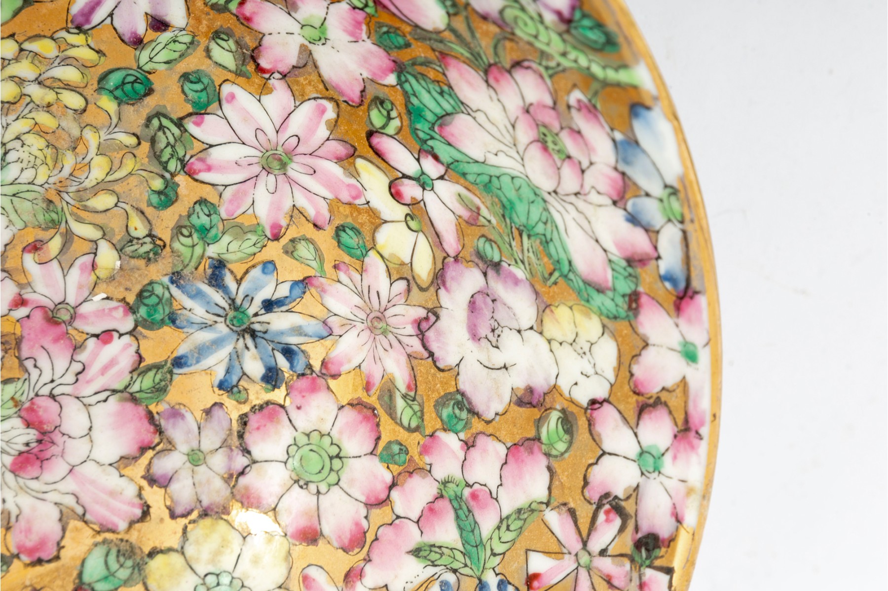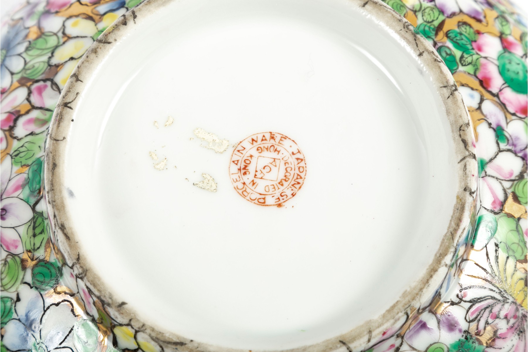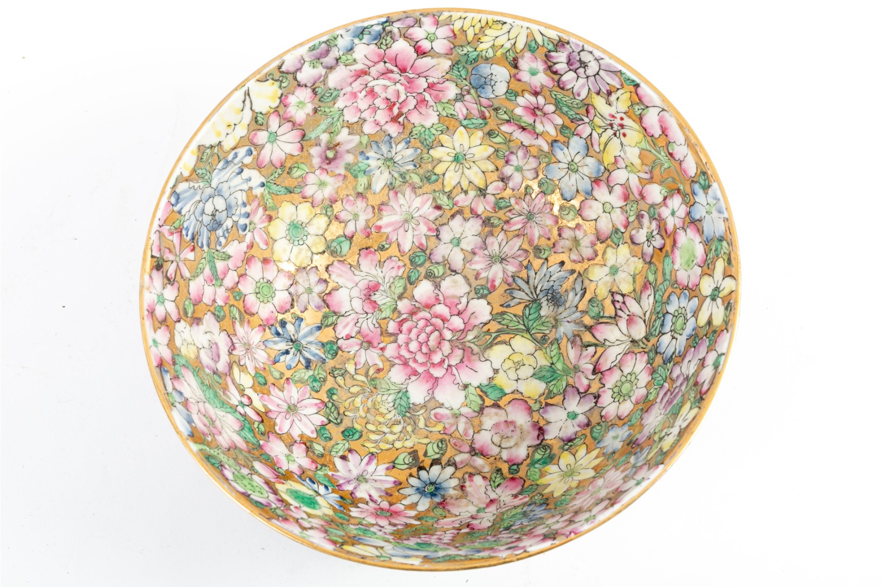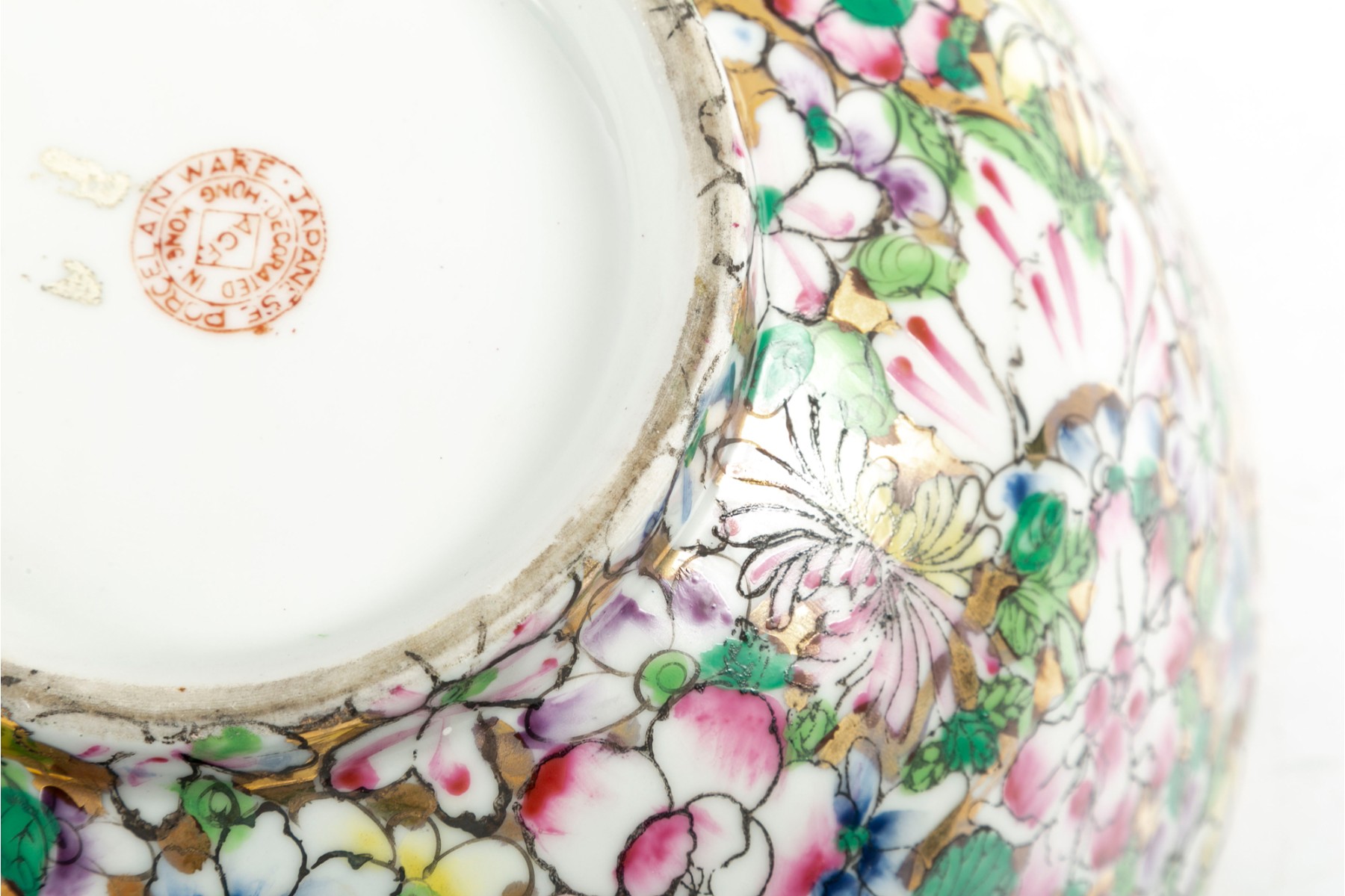 An ornate, hand-painted in Hong Kong Japanese 10" porcelain bowl decorated in rich polychrome florals over metallic gilt.