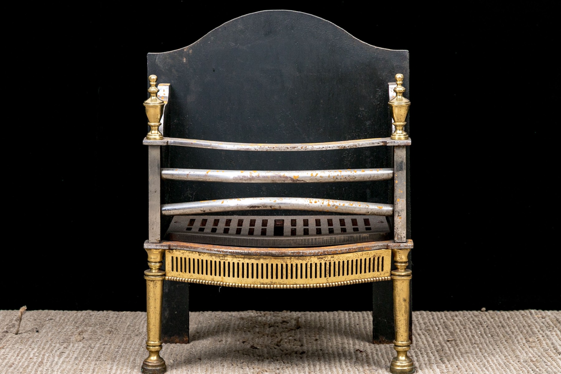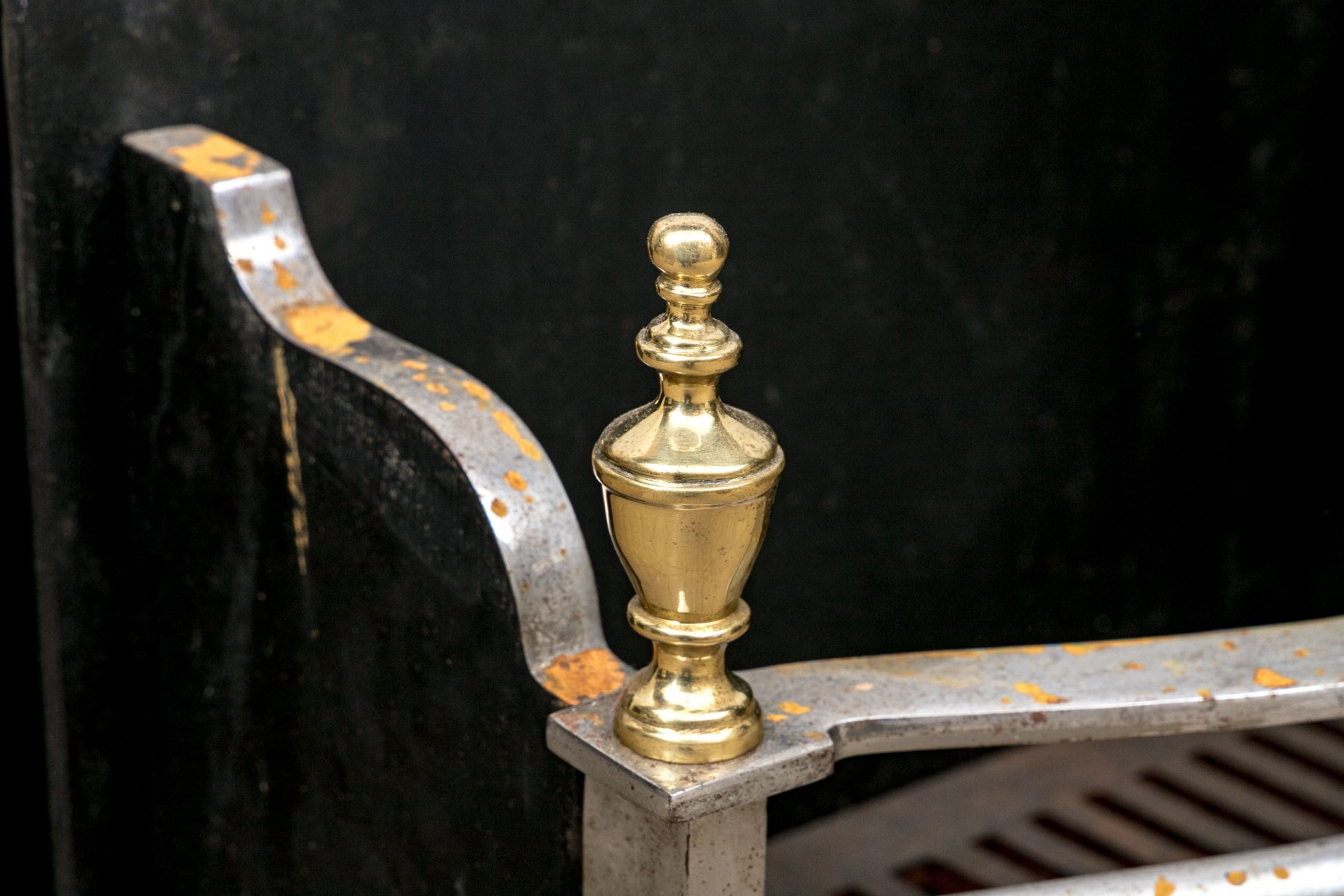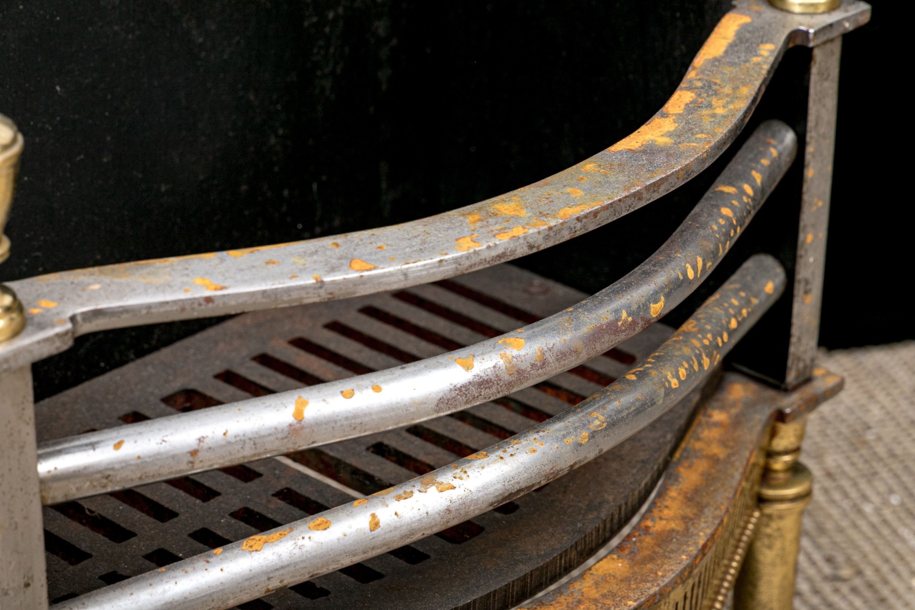 The grate has a pair of wonderful lidded urn form brass finials with an iron back plate with the grate below and steel frame with bow front.