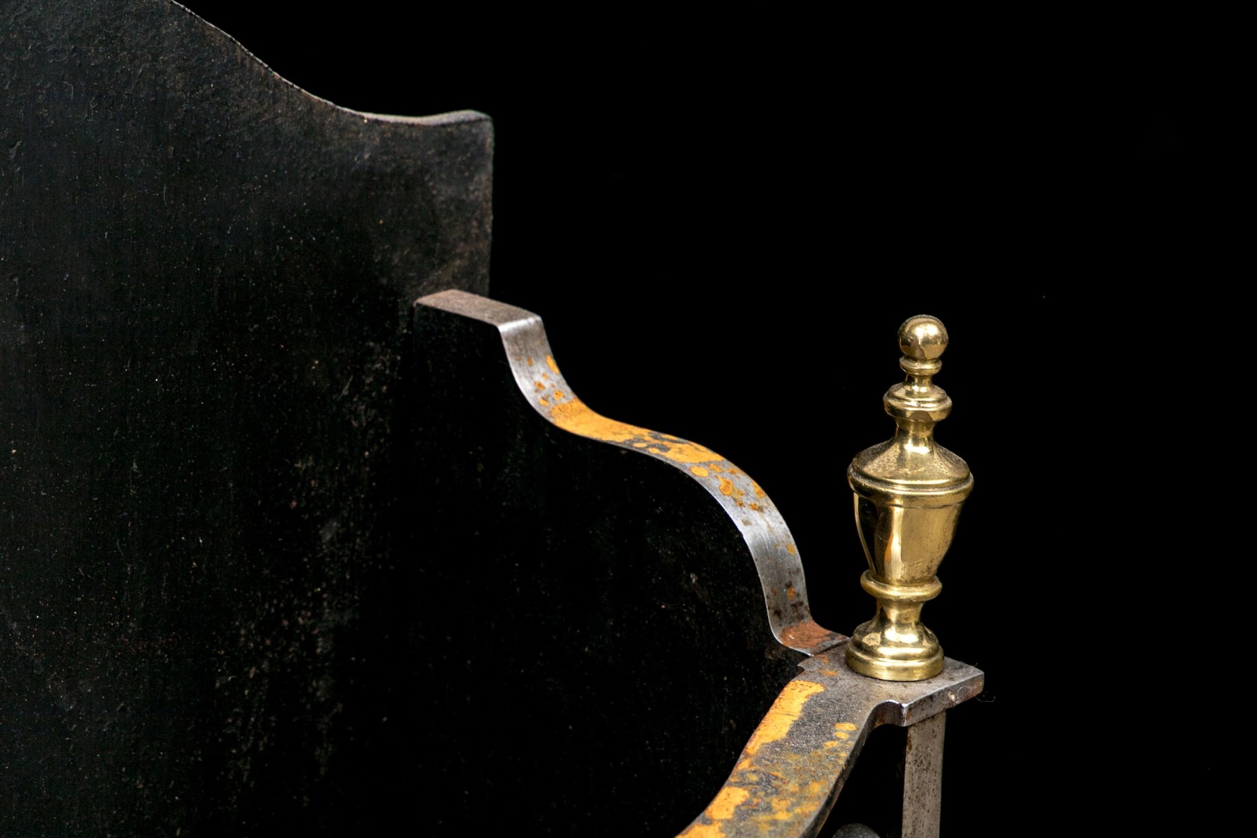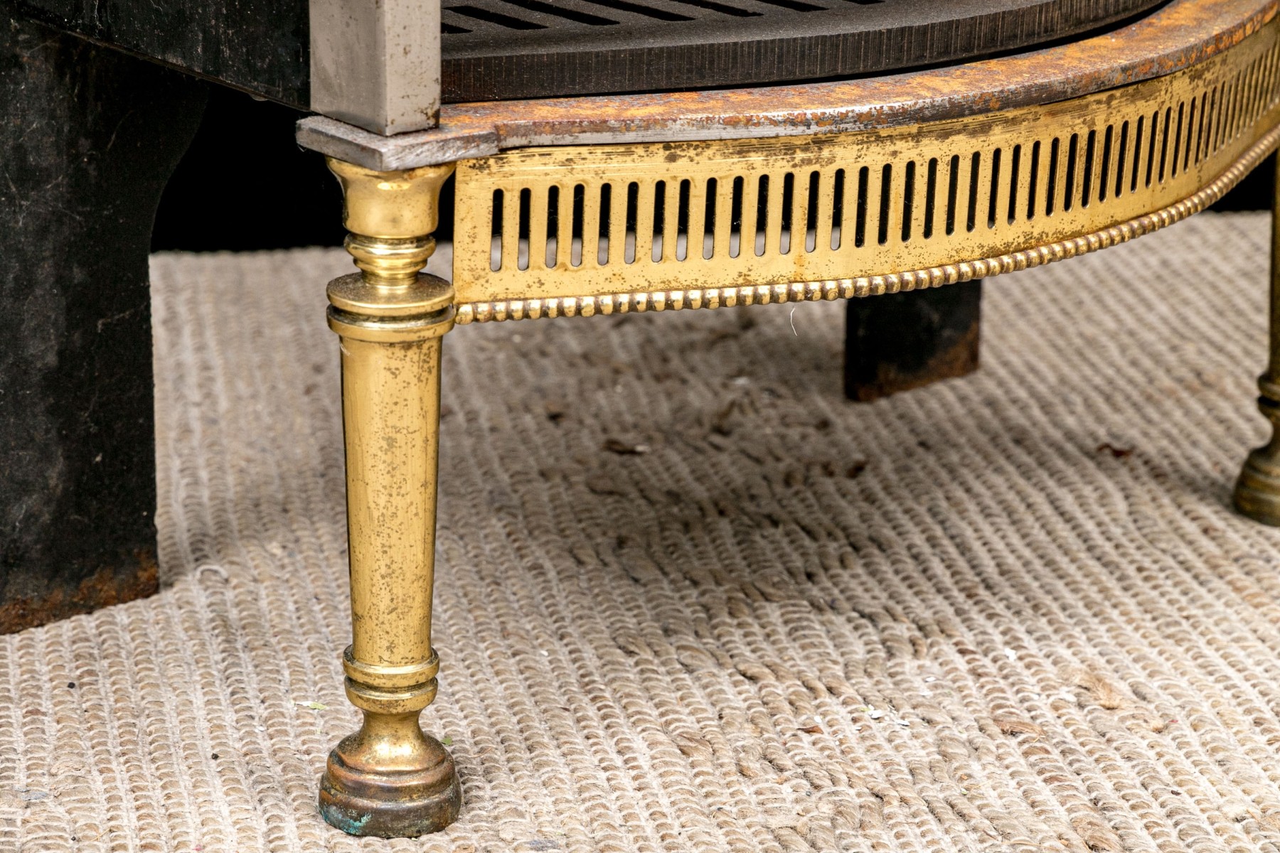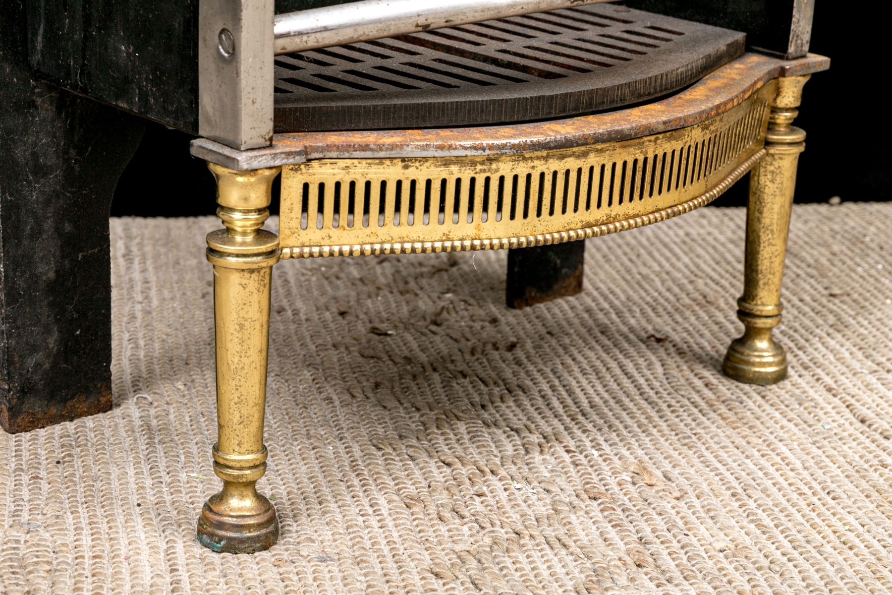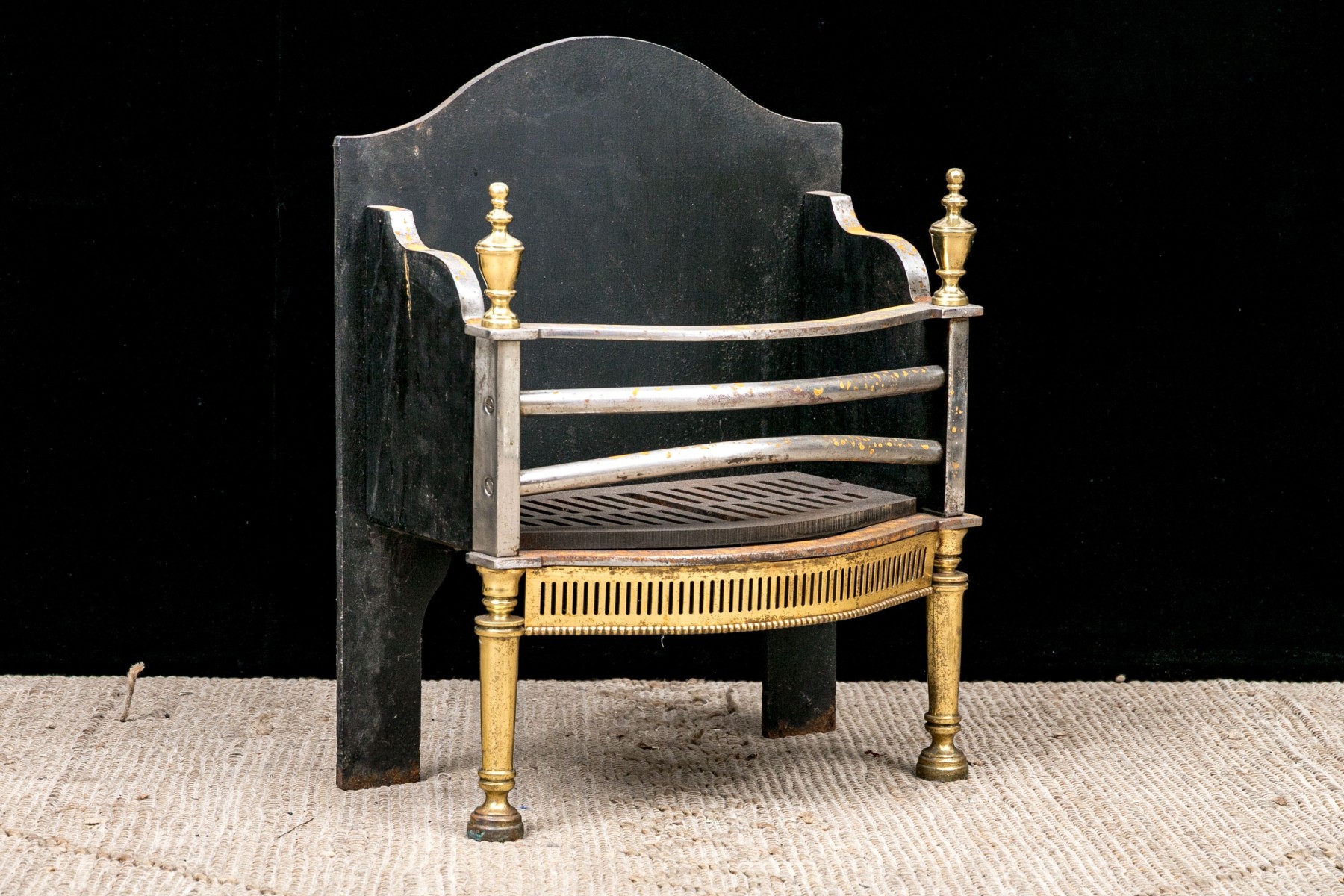 The grate has a pair of wonderful lidded urn form brass finials with an iron back plate with the grate below and steel frame with bow front.