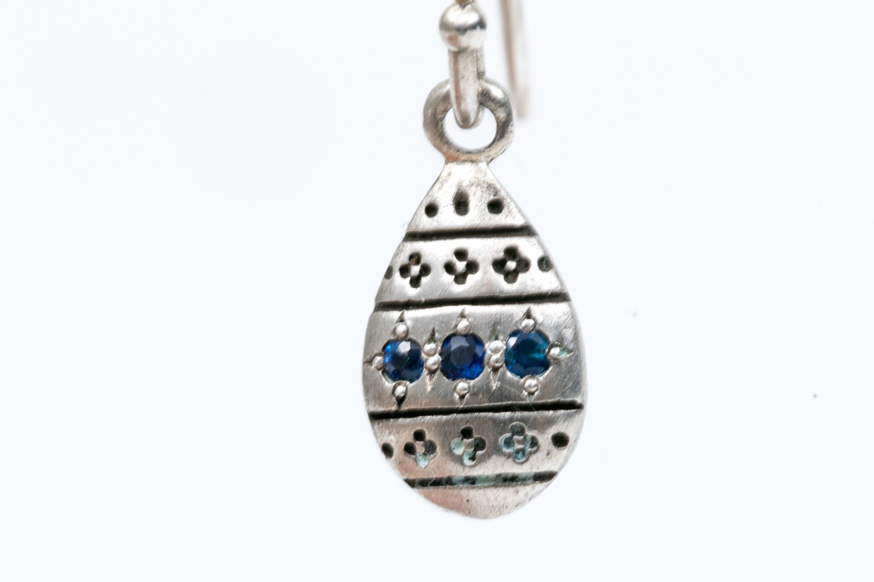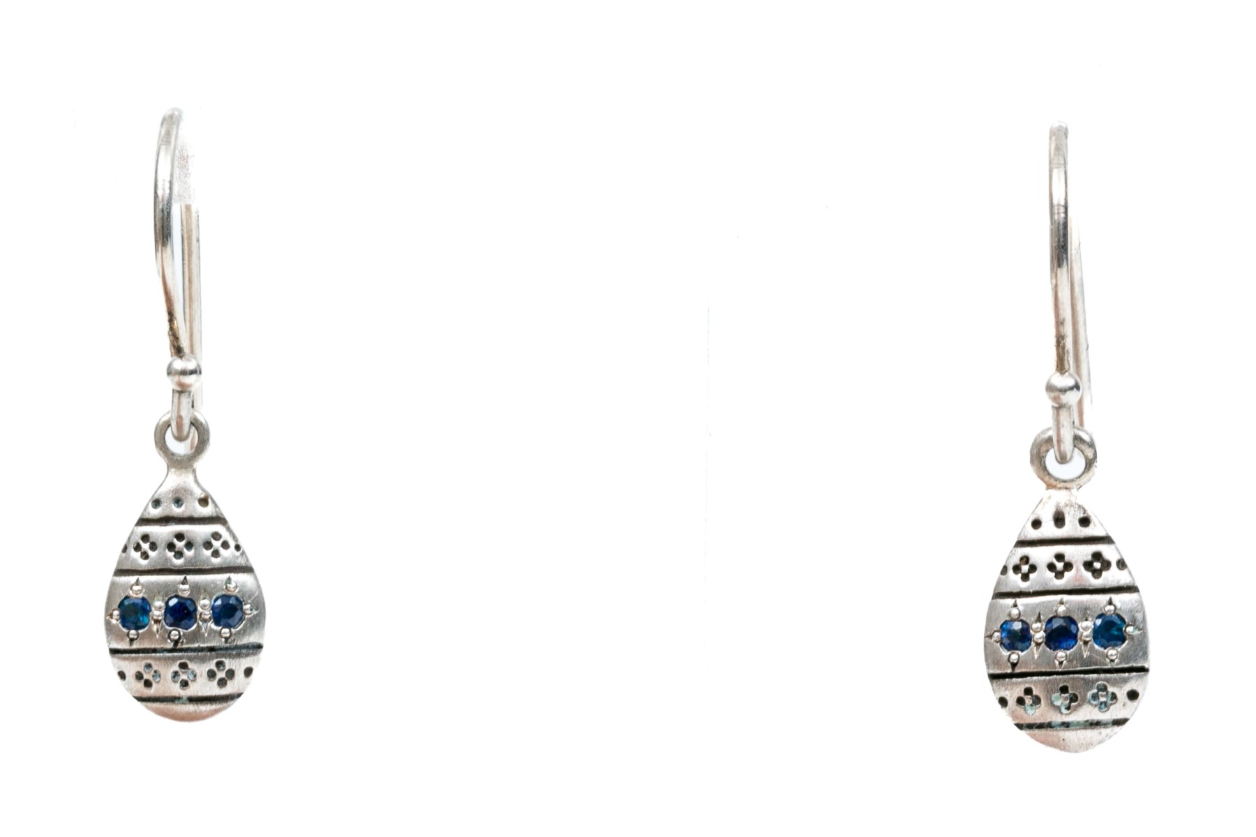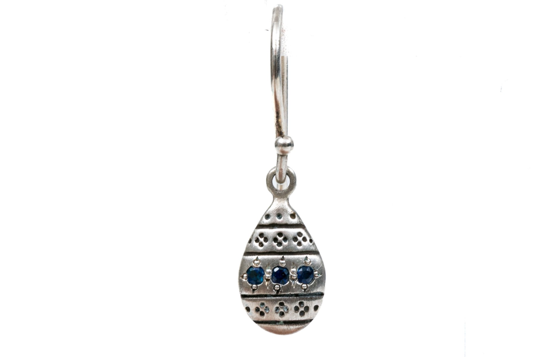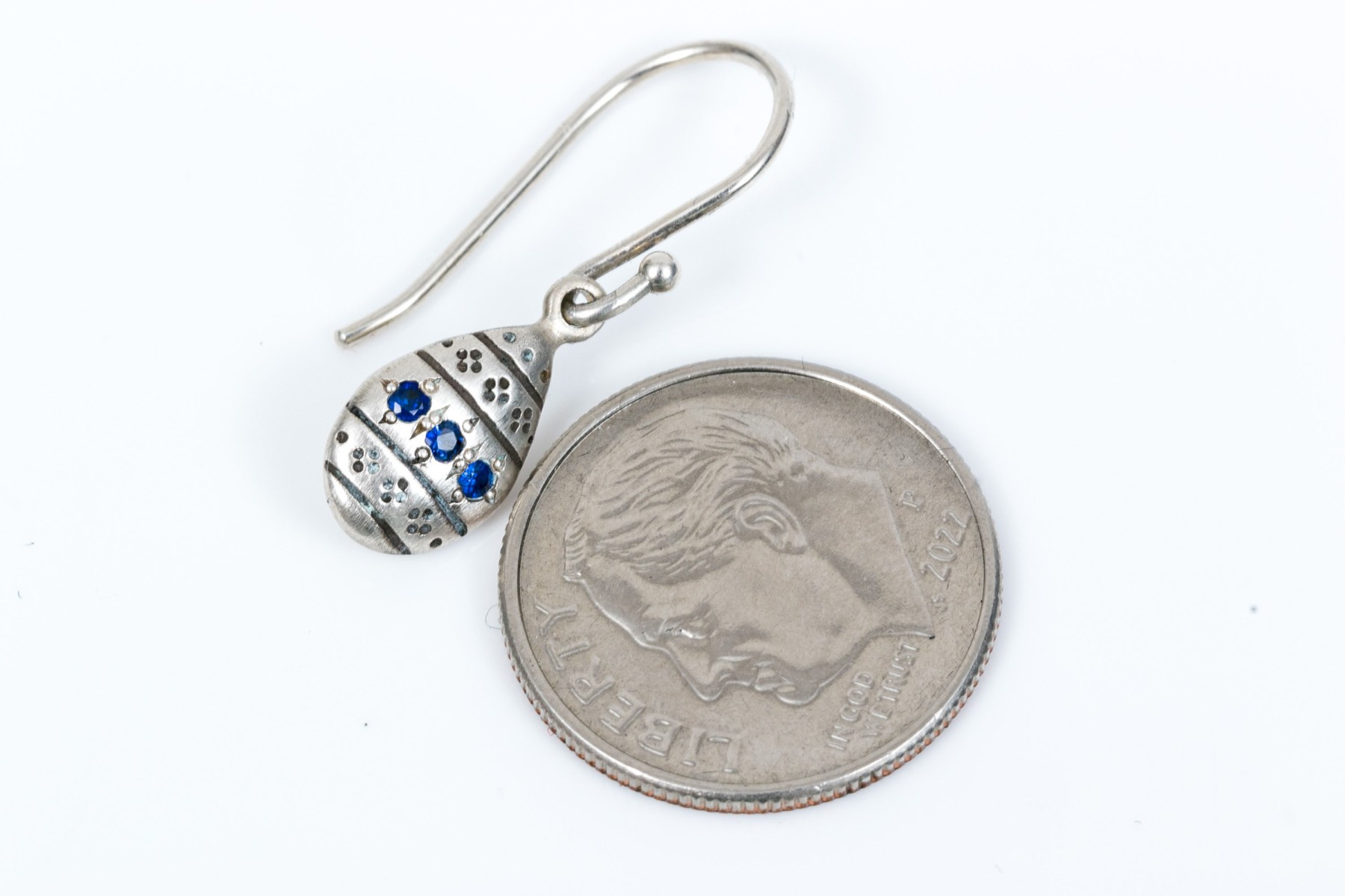 Adel Chefridi sterling silver handsome Nomad drop earrings, decorated with a brushed finish and set with round faceted blue sapphires, approximately 0.12 TCW, flush set. The earrings are finished with shepherd's hooks