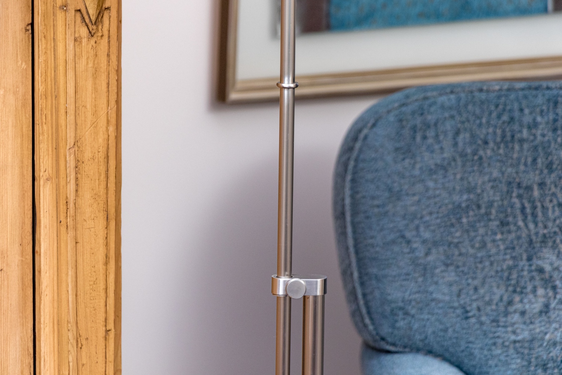 A sleek and stylish floor lamp raised on a circular base with adjustable central poles to raise or lower. Surmounted by a white shade above.