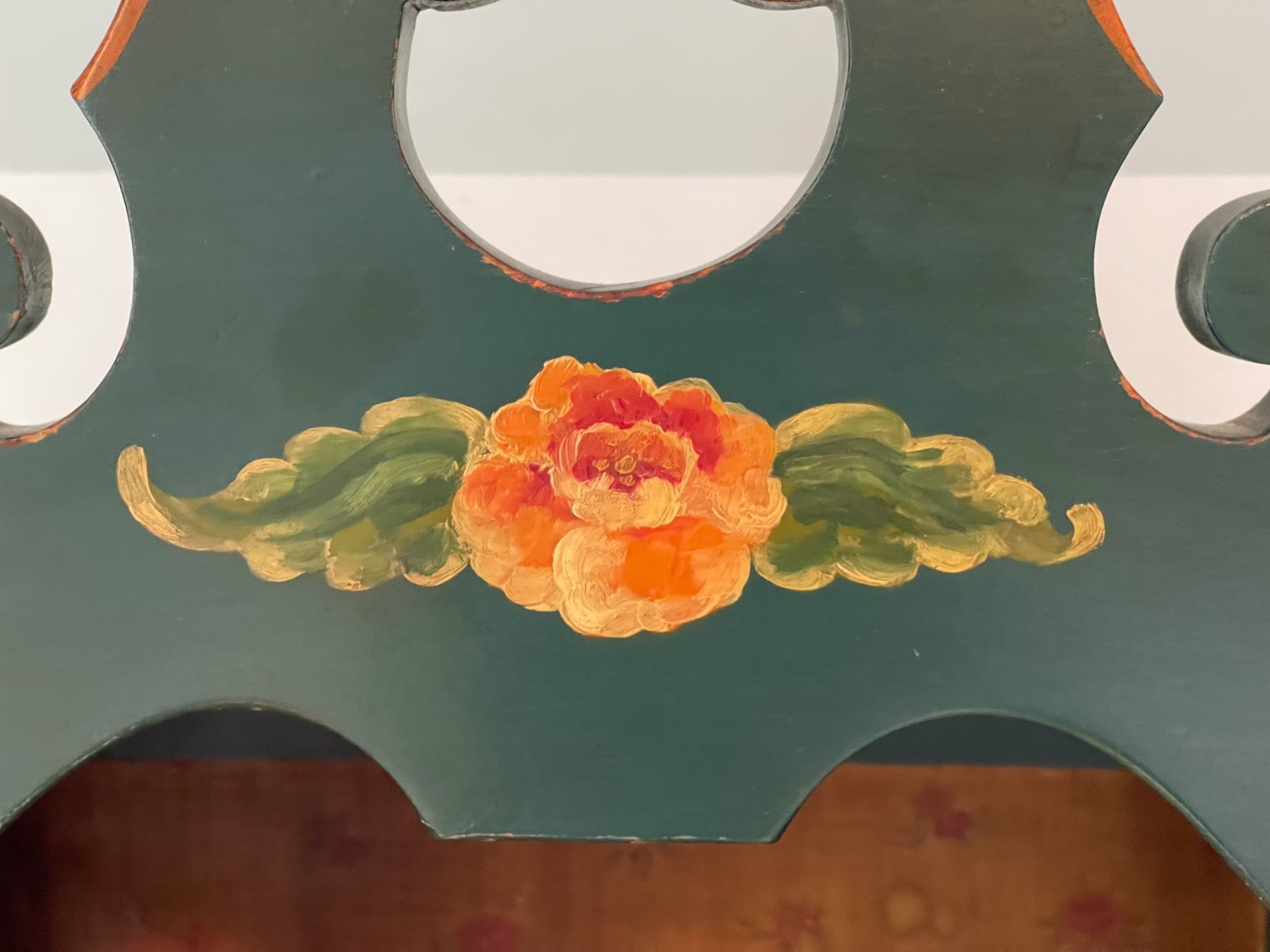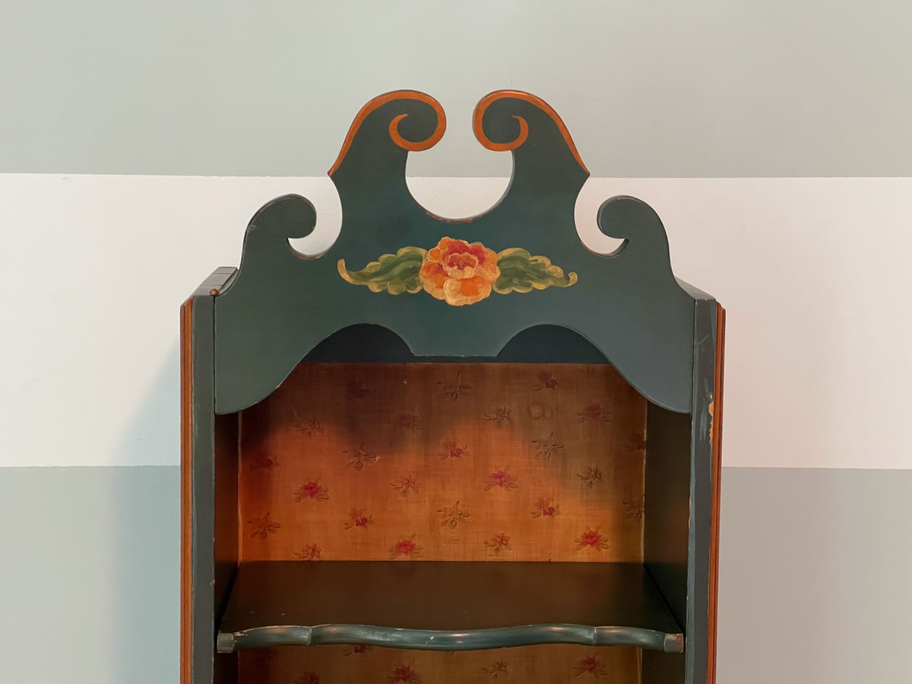 An adorable vintage style American pine bookcase supported on four carved short legs the rectangular frame with scalloped shelves with green ground and stencil decorated floral motifs, and all surmounted with a broken bonnet pediment.
