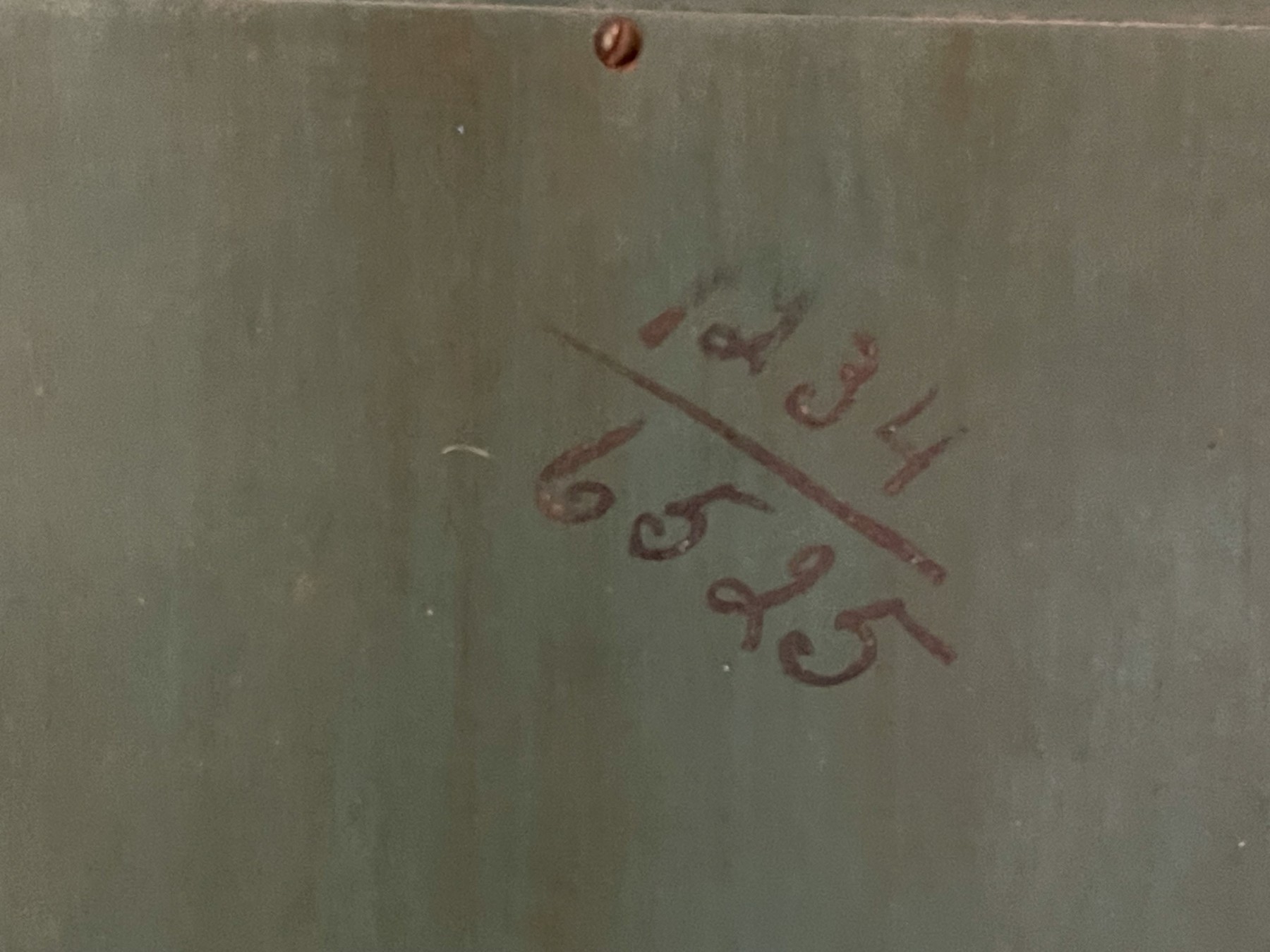 Some wear to the paint finish, stencil decoration and interor paper lined backing commensurate with age and usage but overall in good form and presents handsomely.