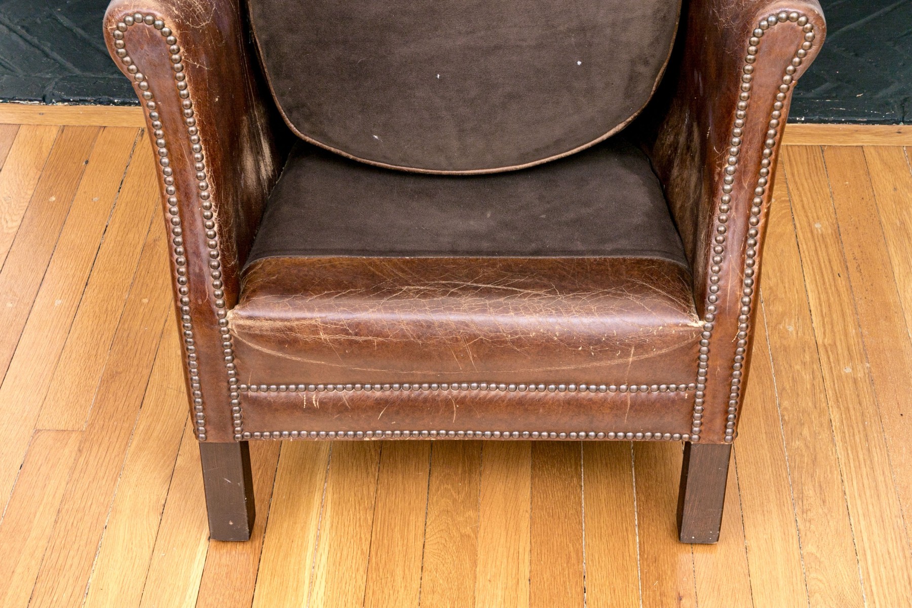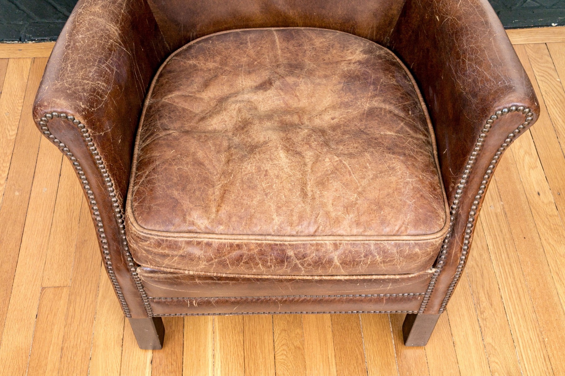 With loose upholstered seat cushion. On four carved wood legs the leather upholstered frame affixed to the frame with tack nailhead trim.