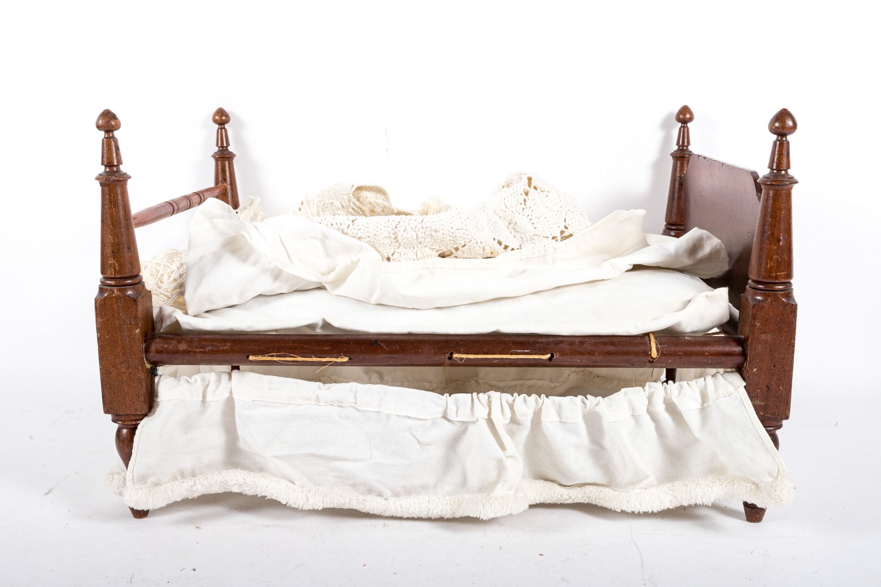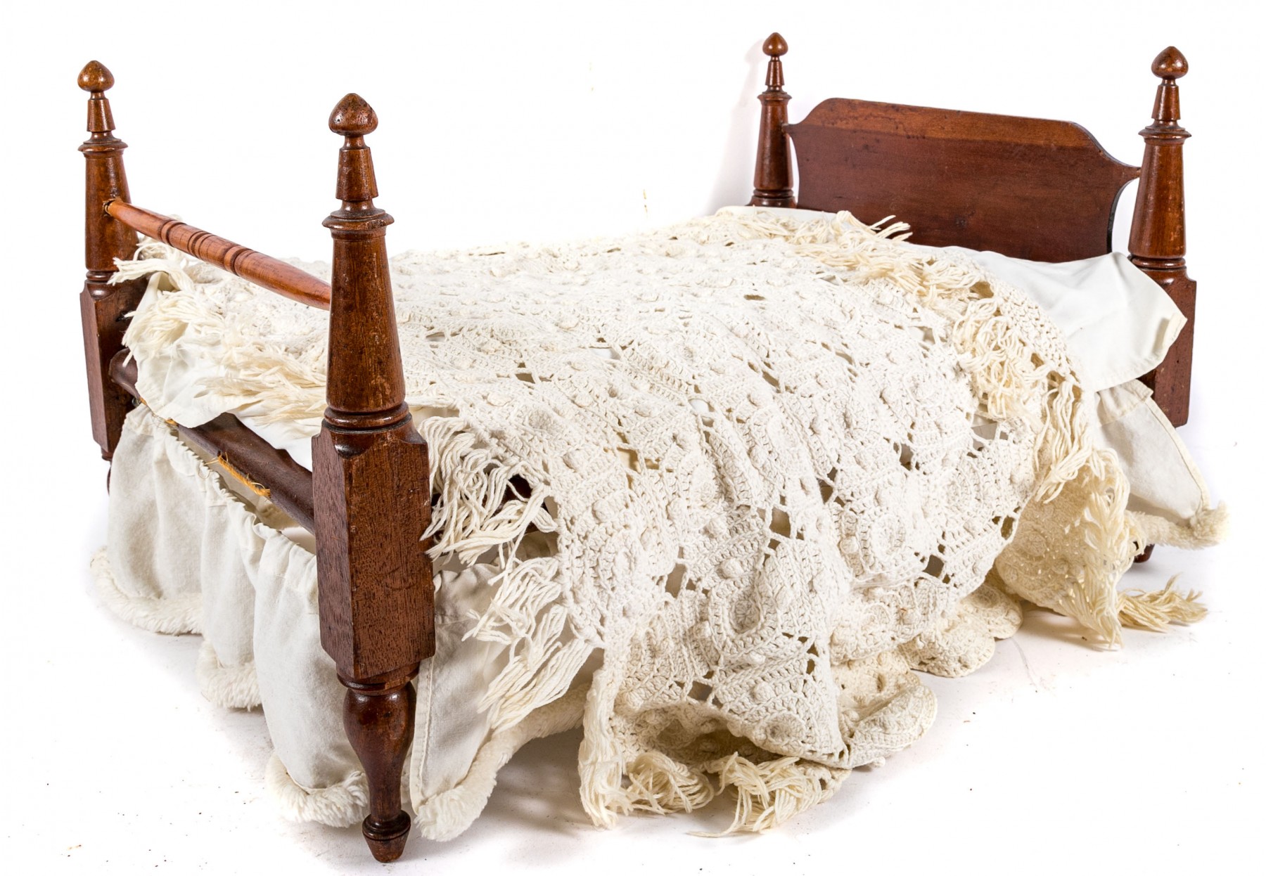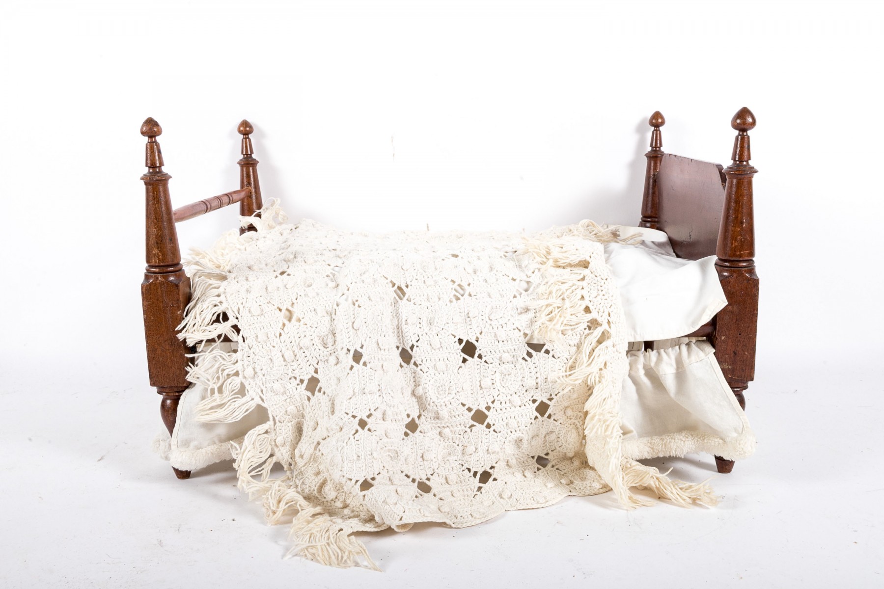 An adorable Eastlake-styled doll bed with a dark brown oak frame, fitted with ropes to support a darling mattress pad, flat sheet, and crochet coverlet. Finished with a white skirt lined with plush white fringe.